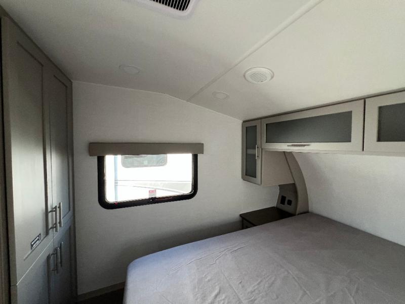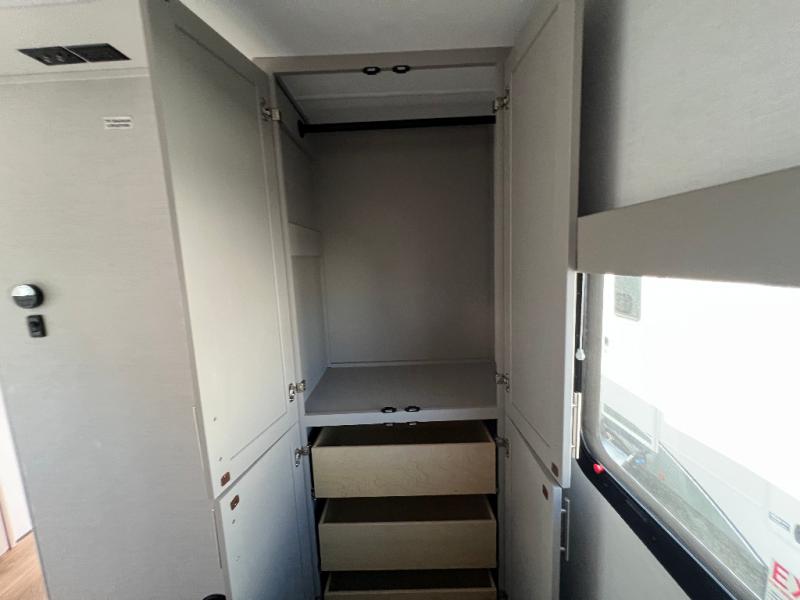 For the couple that enjoys adventures, this rear living coach has everything you need to travel comfortably and take along a couple of friends! The front private bedroom has a queen bed with nightstands on either side for your personal belongings, and a wardrobe to keep your clothes looking nice. Freshen up each morning in the full bathroom with a 30" x 36" shower, and grab a towel stored close by in the linen closet. Now that you're ready for the day, you can head to the kitchen and create a hearty breakfast with the full kitchen amenities. You will appreciate having a 10 cu. ft. 12V refrigerator and three burner cooktop, plus there is a center island with plenty of counter space and a sink to make food prep even easier. Spend your evenings in true relaxation in the dual recliner theater seats across from the swing mount 50" HDTV with hidden storage behind. You will also love the pantry and hutch in the kitchen area for storing all of your dishes and non-perishables. Dine at the floating table with two chairs along with a moveable ottoman featuring storage.