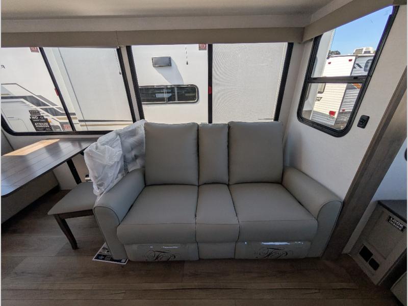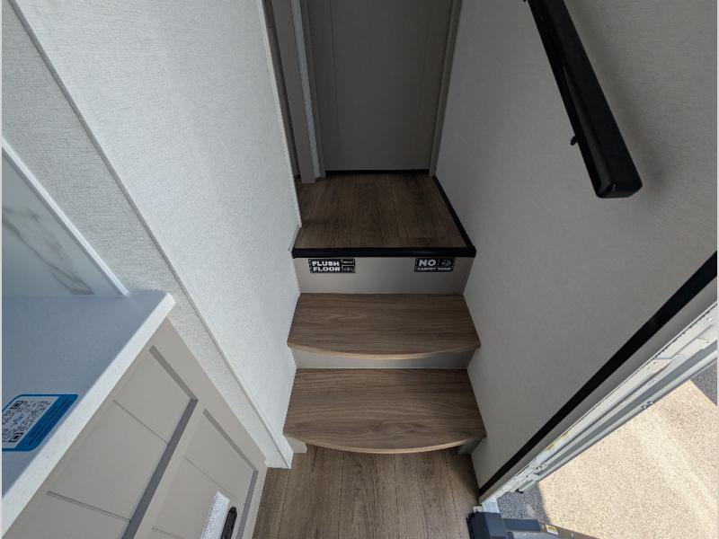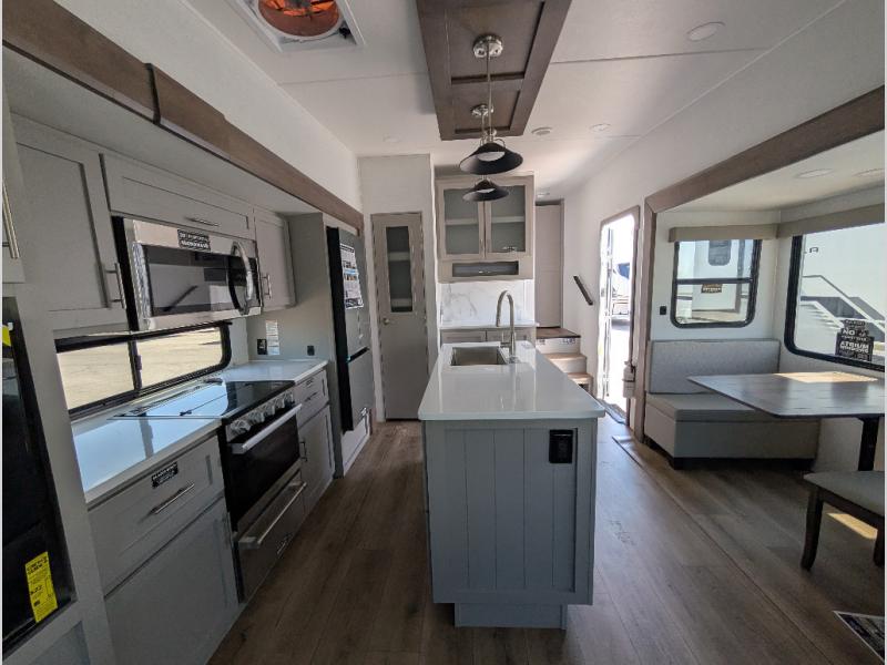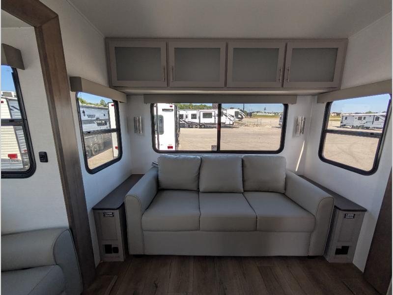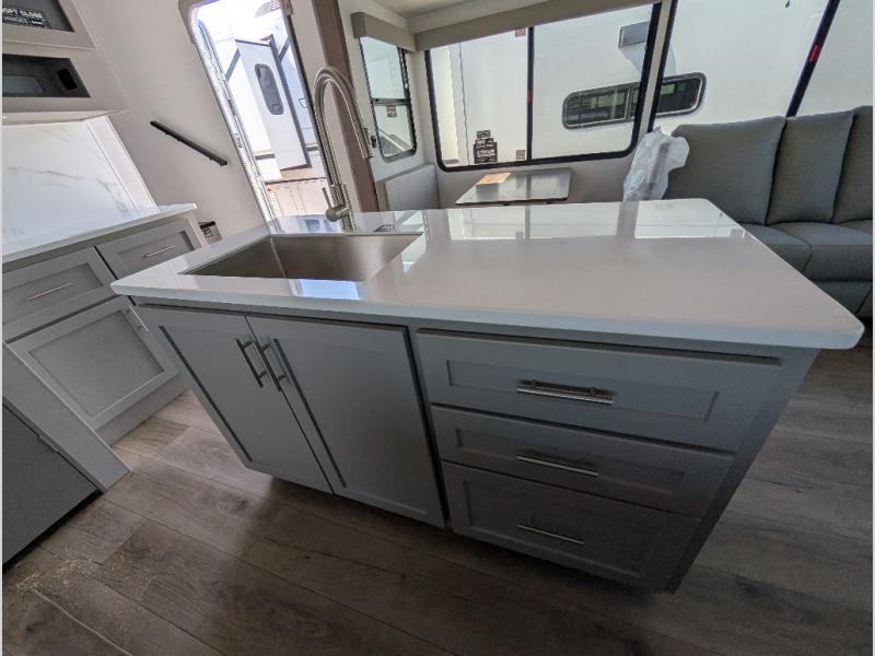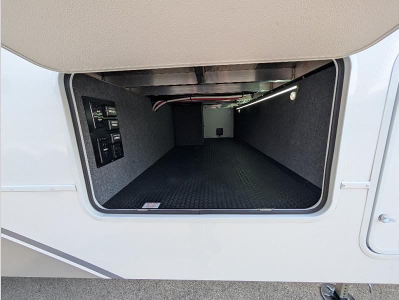A benchmark chassis creates a space saver upper deck with each one of these Avenue All-Access fifth wheels by Alliance RV! The 101 in. wide-body construction gives you more room to walk around and the flush slide out floors throughout prevent any tripping. There are Azdel composite sidewalls inside and out, and a seamless fully walkable PVC roof for extreme durability and zero maintenance. You are sure to love no carpet throughout making each Avenue All-Access easy to clean and allergen free, not to mention pet friendly. You can maximize your space throughout with innovative storage solutions like the hidden storage behind the TV, inside the end tables, ottoman, and dinette chairs. These units also include the OTG Solar Package with a 200 watt solar panel, 15 amp MPPT charger, multiple outlets, and more to keep you powered up!