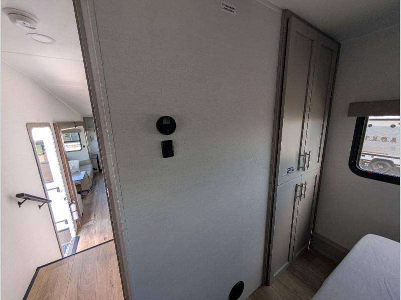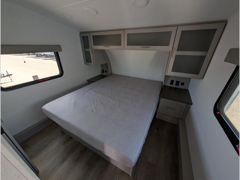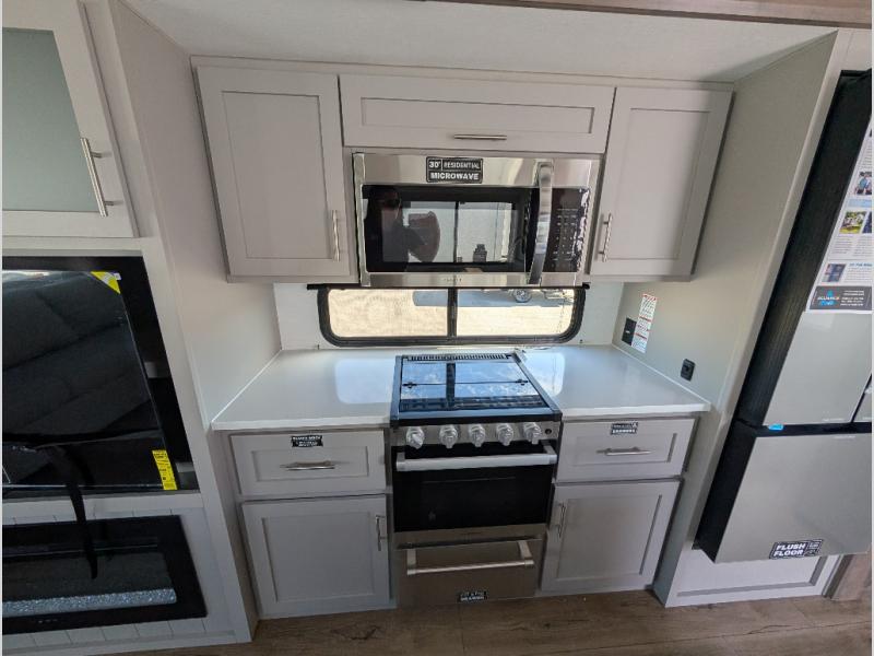 For the couple that enjoys adventures, this rear living coach has everything you need to travel comfortably and take along a couple of friends! The front private bedroom has a queen bed with nightstands on either side for your personal belongings, and a wardrobe to keep your clothes looking nice. Freshen up each morning in the full bathroom with a 30" x 36" shower, and grab a towel stored close by in the linen closet. Now that you're ready for the day, you can head to the kitchen and create a hearty breakfast with the full kitchen amenities. You will appreciate having a 10 cu. ft. 12V refrigerator and three burner cooktop, plus there is a center island with plenty of counter space and a sink to make food prep even easier. Spend your evenings in true relaxation in the dual recliner theater seats across from the swing mount 50" HDTV with hidden storage behind. You will also love the pantry and hutch in the kitchen area for storing all of your dishes and non-perishables. Dine at the floating table with two chairs along with a moveable ottoman featuring storage.
