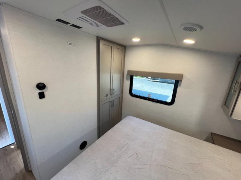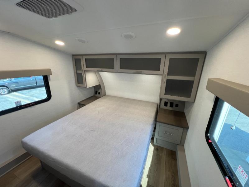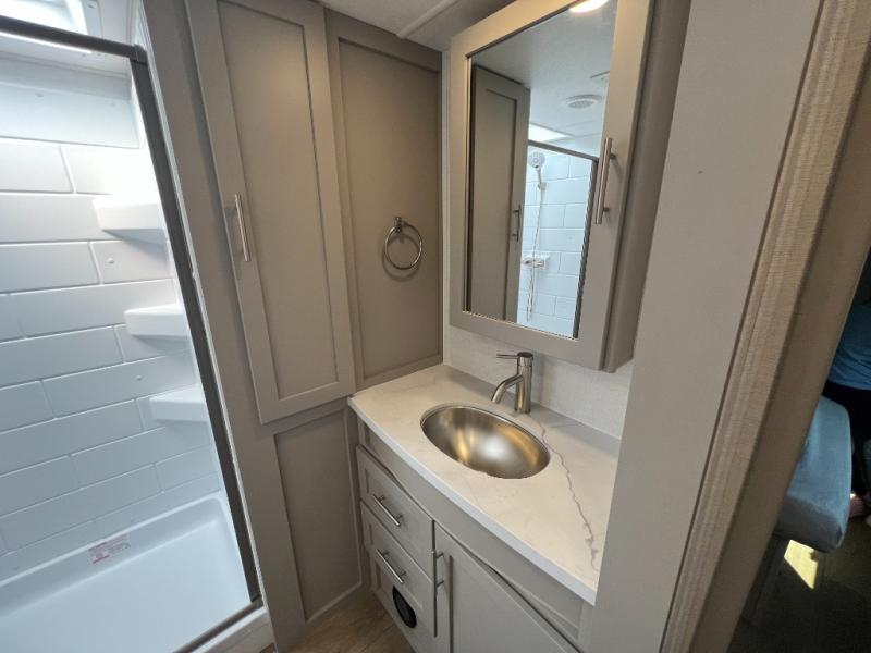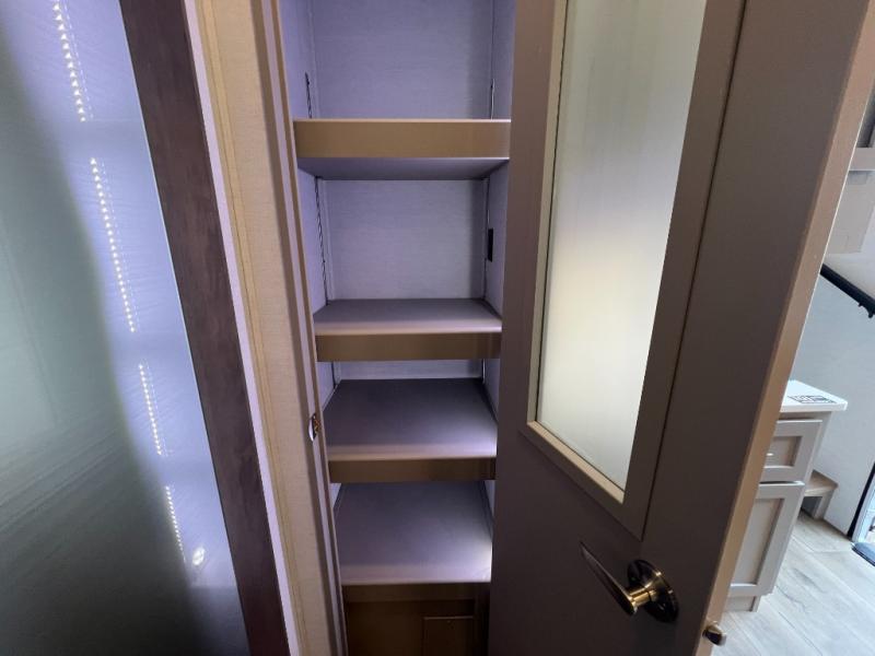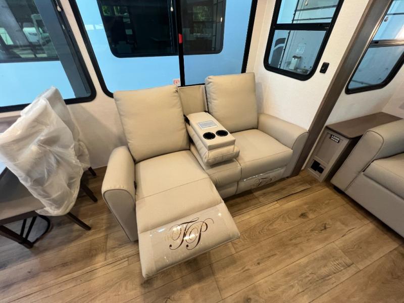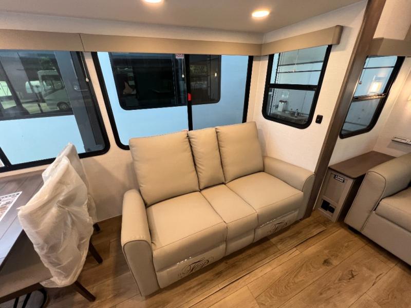 For the couple that enjoys adventures, this rear living coach has everything you need to travel comfortably and take along a couple of friends! The front private bedroom has a queen bed with nightstands on either side for your personal belongings, and a wardrobe to keep your clothes looking nice. Freshen up each morning in the full bathroom with a 30" x 36" shower, and grab a towel stored close by in the linen closet. Now that you're ready for the day, you can head to the kitchen and create a hearty breakfast with the full kitchen amenities. You will appreciate having a 10 cu. ft. 12V refrigerator and three burner cooktop, plus there is a center island with plenty of counter space and a sink to make food prep even easier. Spend your evenings in true relaxation in the dual recliner theater seats across from the swing mount 50" HDTV with hidden storage behind. You will also love the pantry and hutch in the kitchen area for storing all of your dishes and non-perishables. Dine at the floating table with two chairs along with a moveable ottoman featuring storage.