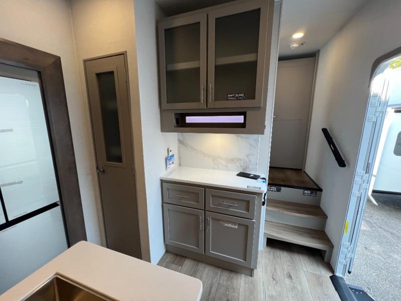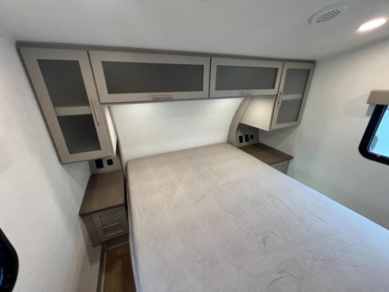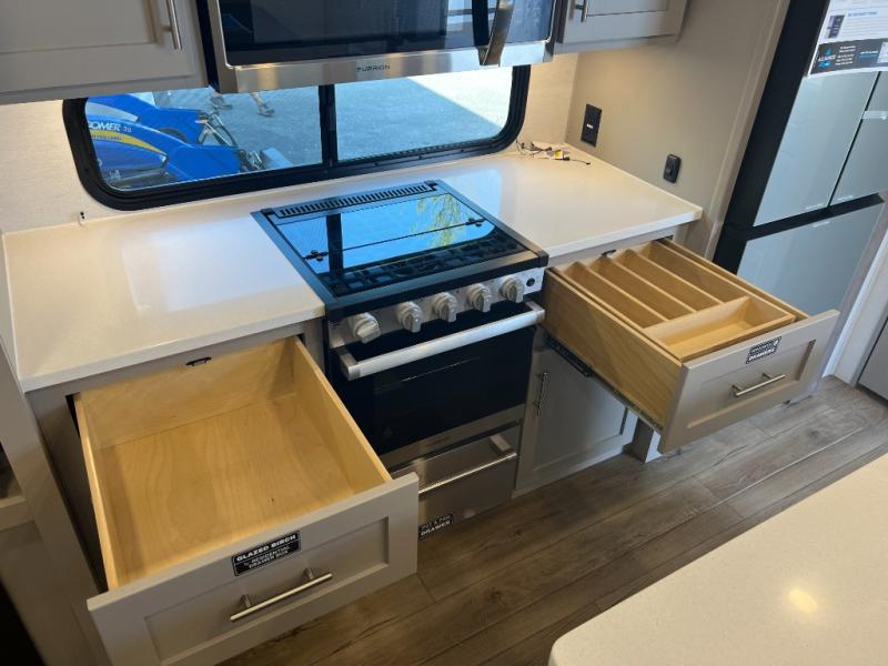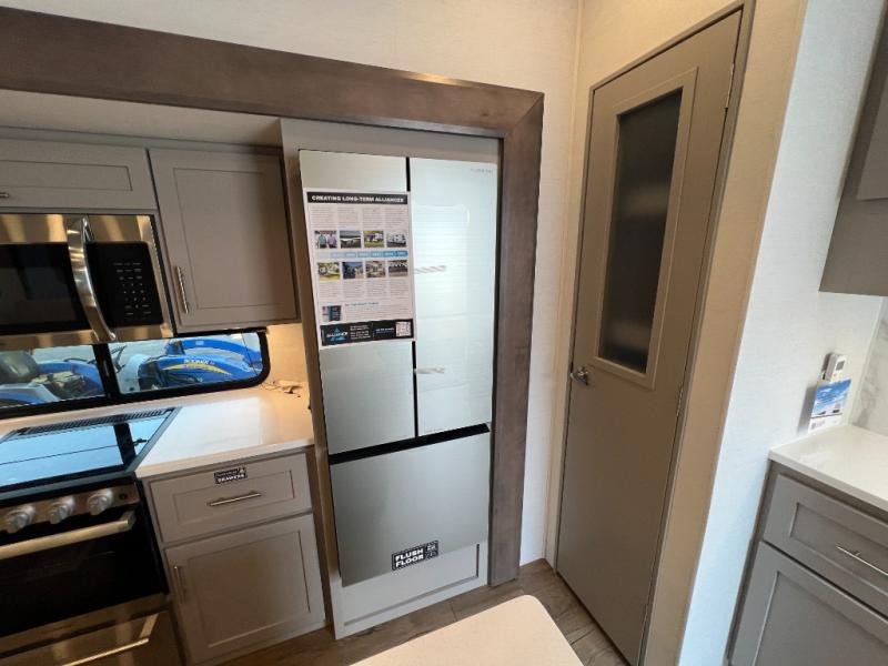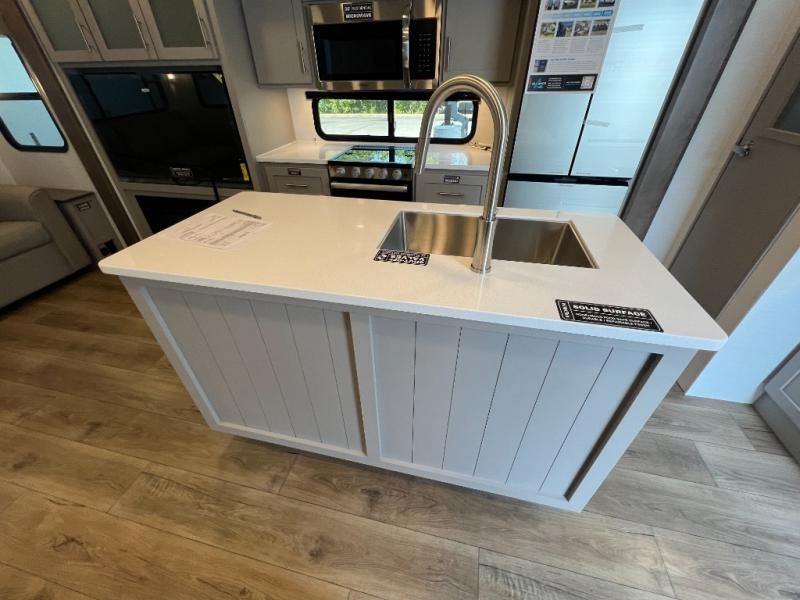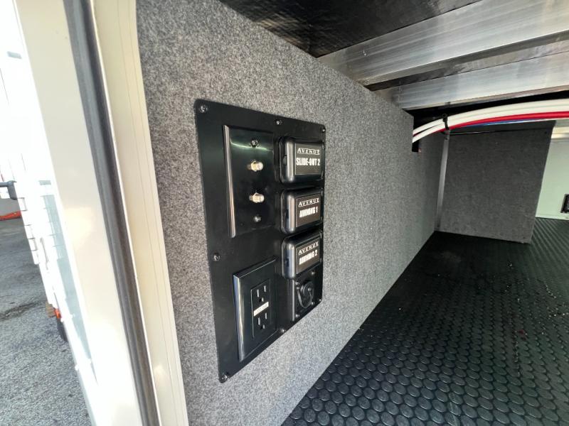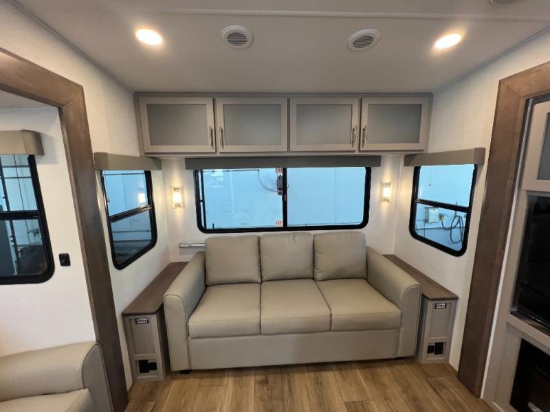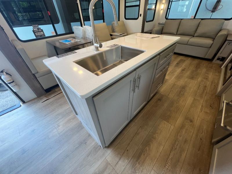 A benchmark chassis creates a space saver upper deck with each one of these Avenue All-Access fifth wheels by Alliance RV! The 101 in. wide-body construction gives you more room to walk around and the flush slide out floors throughout prevent any tripping. There are Azdel composite sidewalls inside and out, and a seamless fully walkable PVC roof for extreme durability and zero maintenance. You are sure to love no carpet throughout making each Avenue All-Access easy to clean and allergen free, not to mention pet friendly. You can maximize your space throughout with innovative storage solutions like the hidden storage behind the TV, inside the end tables, ottoman, and dinette chairs. These units also include the OTG Solar Package with a 200 watt solar panel, 15 amp MPPT charger, multiple outlets, and more to keep you powered up!