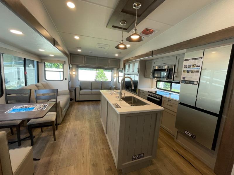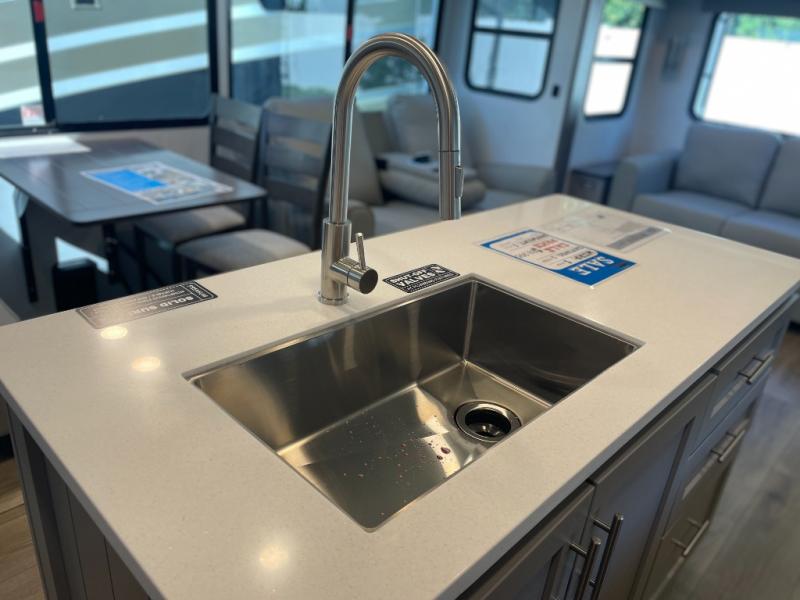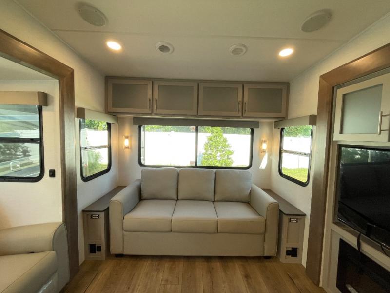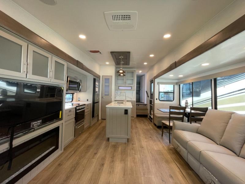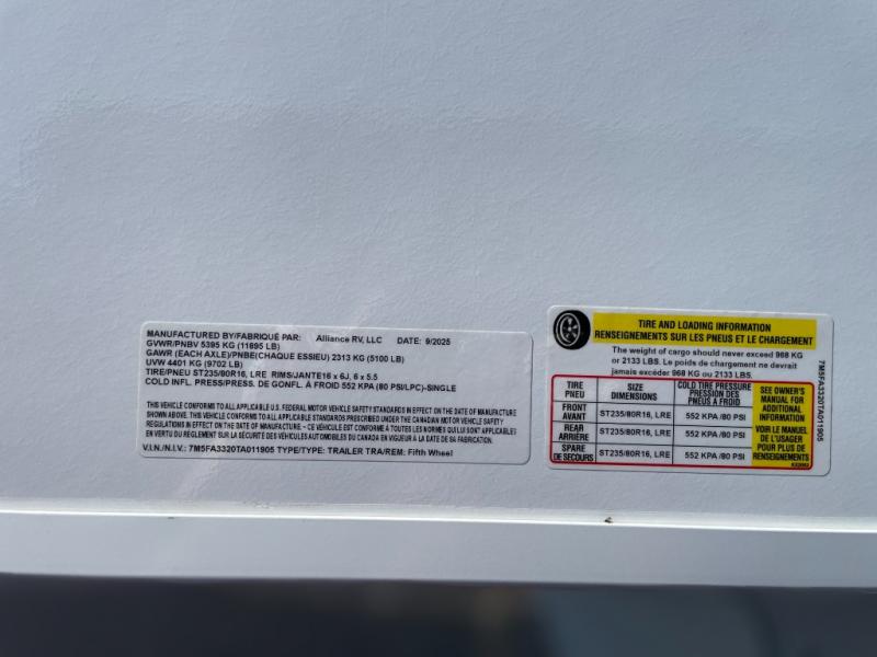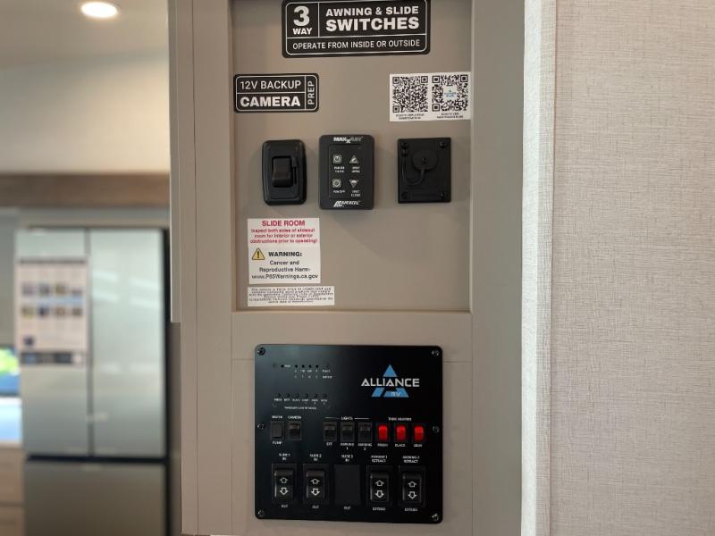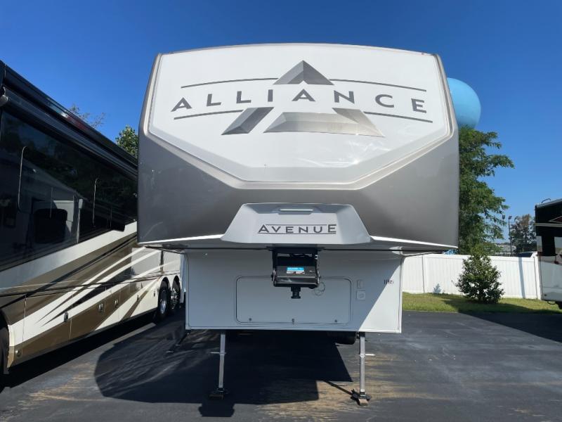 A benchmark chassis creates a space saver upper deck with each one of these Avenue All-Access fifth wheels by Alliance RV! The 101 in. wide-body construction gives you more room to walk around and the flush slide out floors throughout prevent any tripping. There are Azdel composite sidewalls inside and out, and a seamless fully walkable PVC roof for extreme durability and zero maintenance. You are sure to love no carpet throughout making each Avenue All-Access easy to clean and allergen free, not to mention pet friendly. You can maximize your space throughout with innovative storage solutions like the hidden storage behind the TV, inside the end tables, ottoman, and dinette chairs. These units also include the OTG Solar Package with a 200 watt solar panel, 15 amp MPPT charger, multiple outlets, and more to keep you powered up!