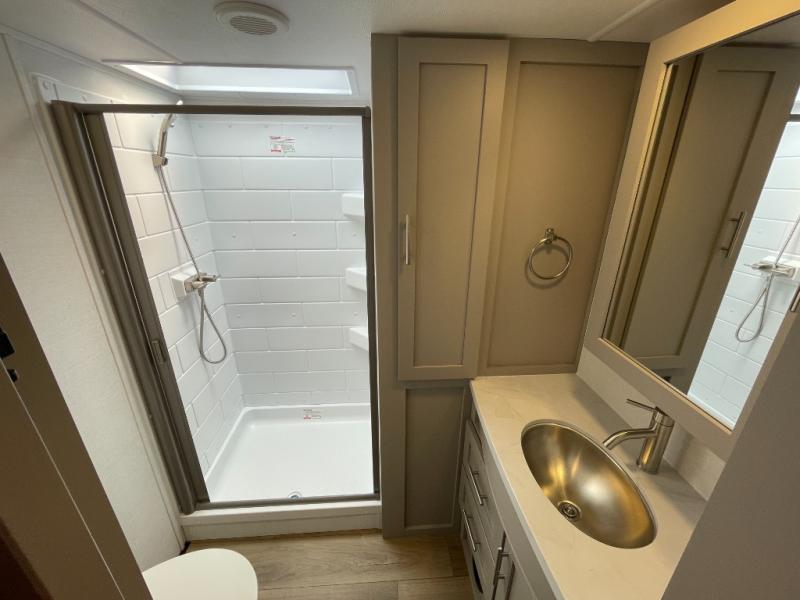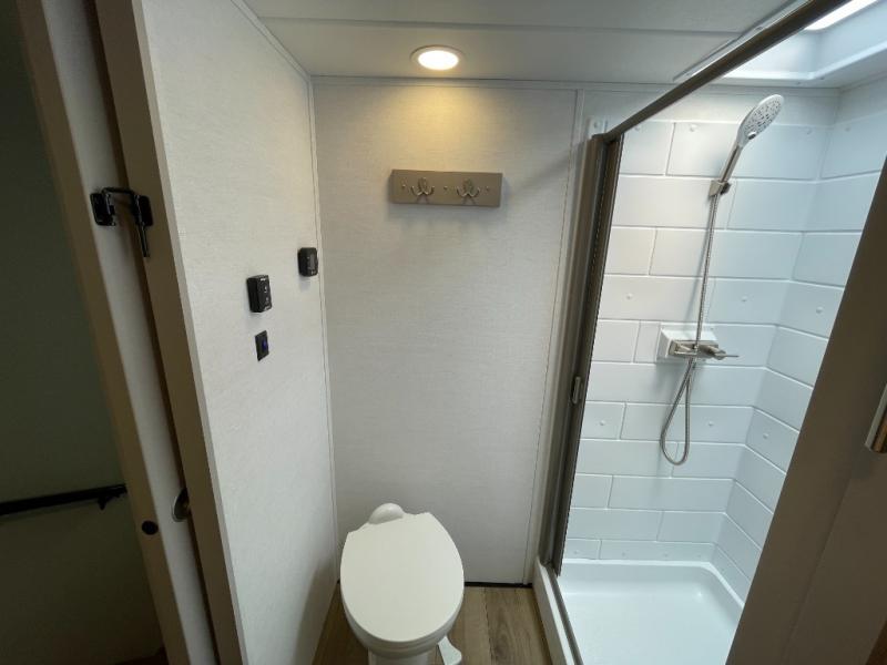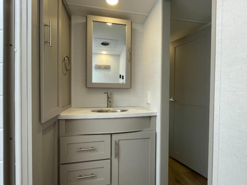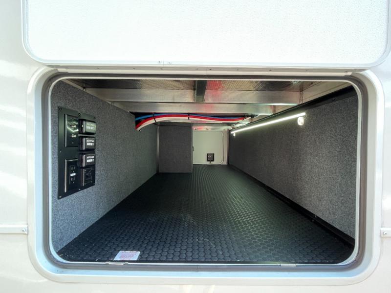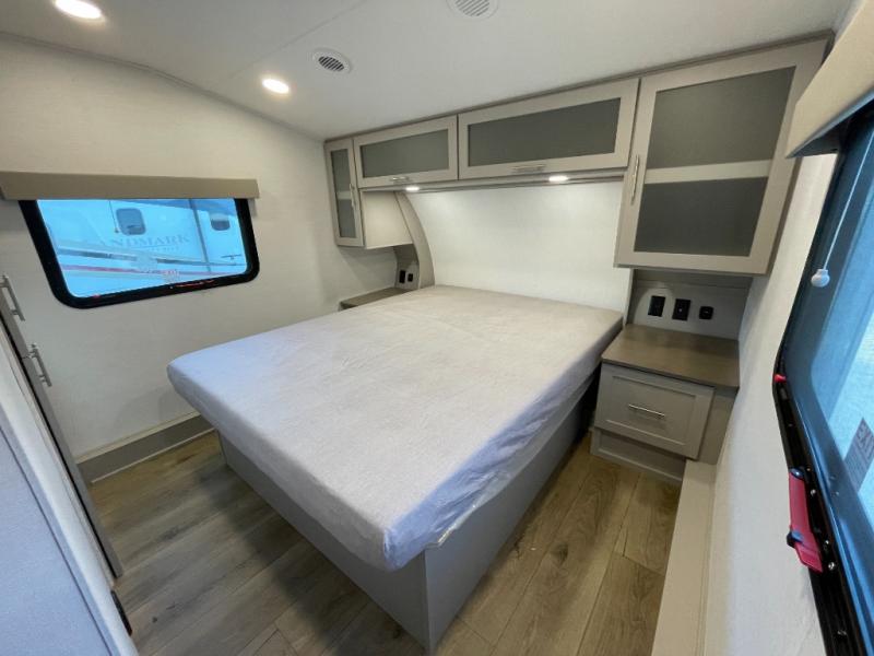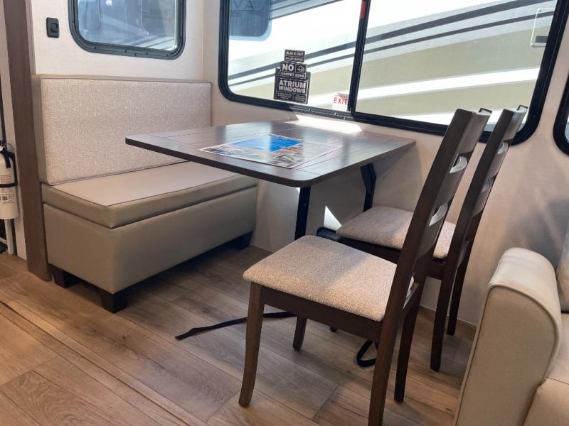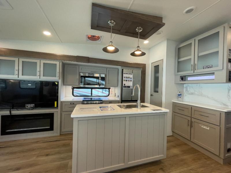 A benchmark chassis creates a space saver upper deck with each one of these Avenue All-Access fifth wheels by Alliance RV! The 101 in. wide-body construction gives you more room to walk around and the flush slide out floors throughout prevent any tripping. There are Azdel composite sidewalls inside and out, and a seamless fully walkable PVC roof for extreme durability and zero maintenance. You are sure to love no carpet throughout making each Avenue All-Access easy to clean and allergen free, not to mention pet friendly. You can maximize your space throughout with innovative storage solutions like the hidden storage behind the TV, inside the end tables, ottoman, and dinette chairs. These units also include the OTG Solar Package with a 200 watt solar panel, 15 amp MPPT charger, multiple outlets, and more to keep you powered up!