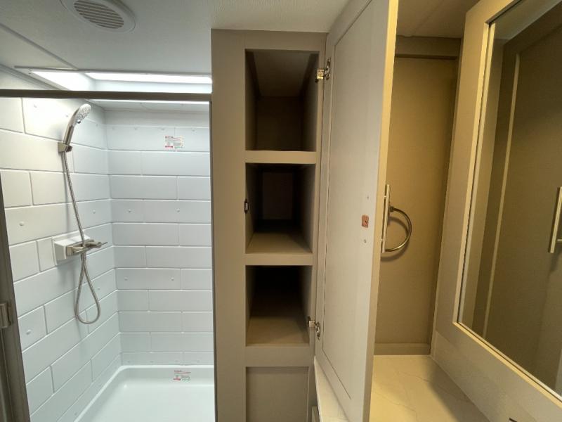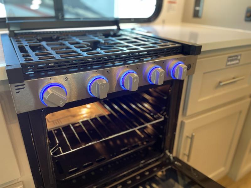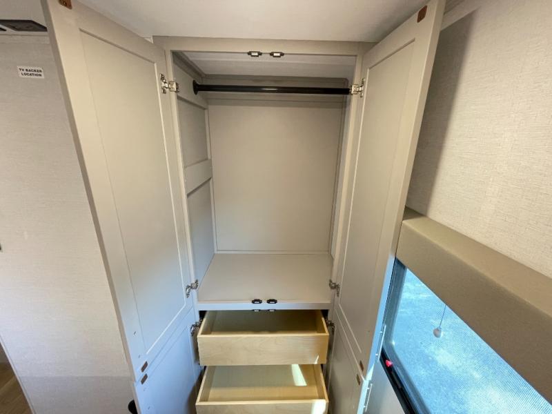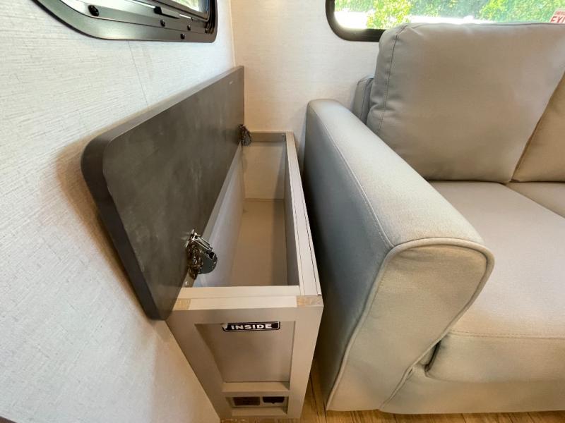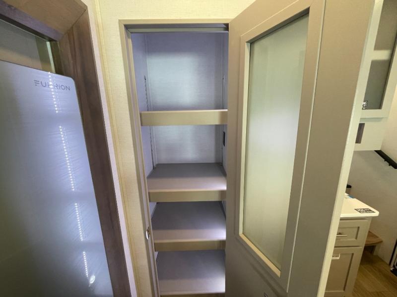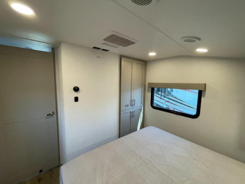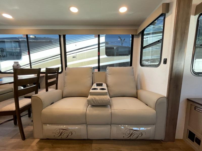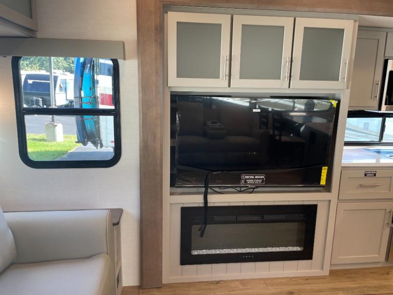 For the couple that enjoys adventures, this rear living coach has everything you need to travel comfortably and take along a couple of friends! The front private bedroom has a queen bed with nightstands on either side for your personal belongings, and a wardrobe to keep your clothes looking nice. Freshen up each morning in the full bathroom with a 30" x 36" shower, and grab a towel stored close by in the linen closet. Now that you're ready for the day, you can head to the kitchen and create a hearty breakfast with the full kitchen amenities. You will appreciate having a 10 cu. ft. 12V refrigerator and three burner cooktop, plus there is a center island with plenty of counter space and a sink to make food prep even easier. Spend your evenings in true relaxation in the dual recliner theater seats across from the swing mount 50" HDTV with hidden storage behind. You will also love the pantry and hutch in the kitchen area for storing all of your dishes and non-perishables. Dine at the floating table with two chairs along with a moveable ottoman featuring storage.
