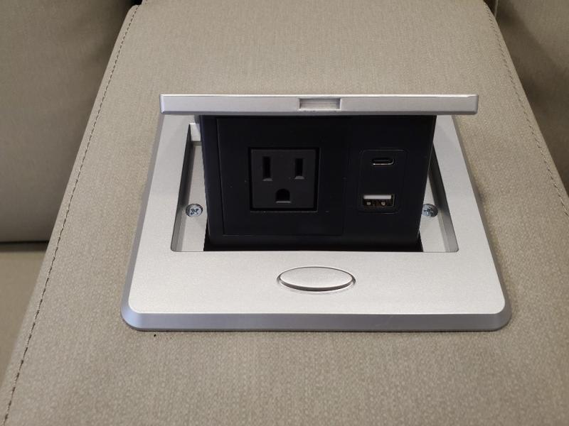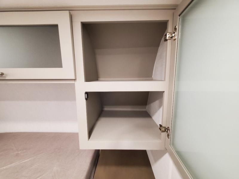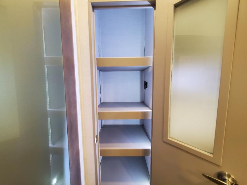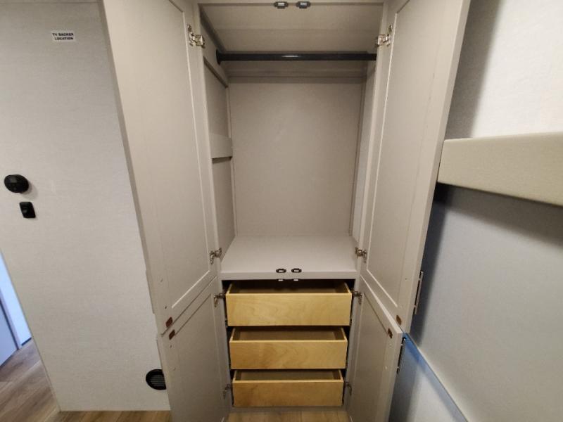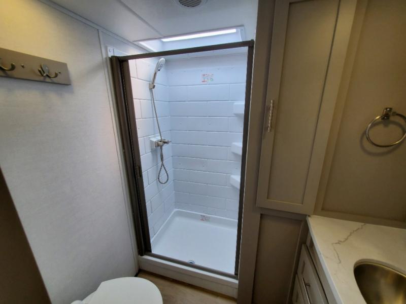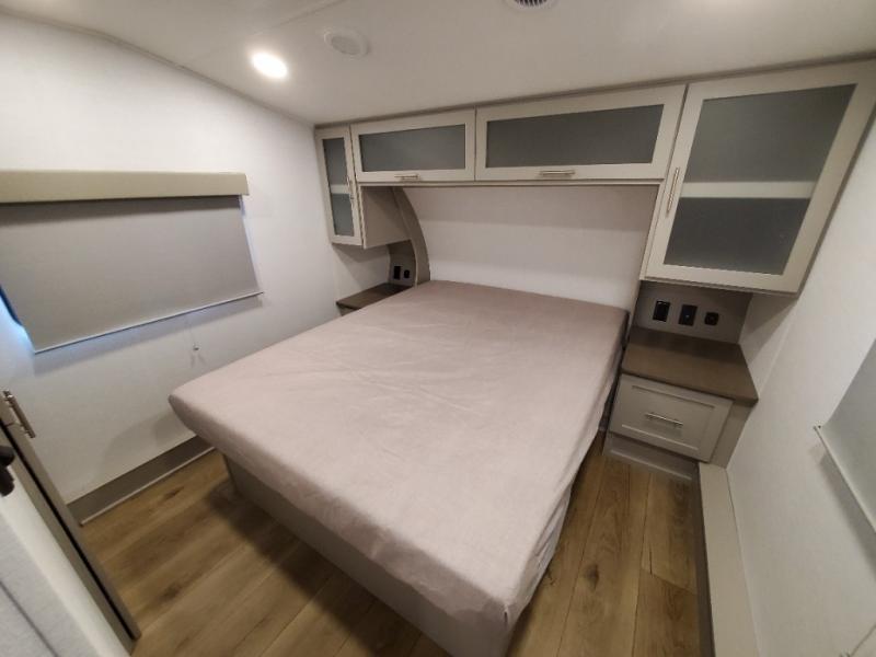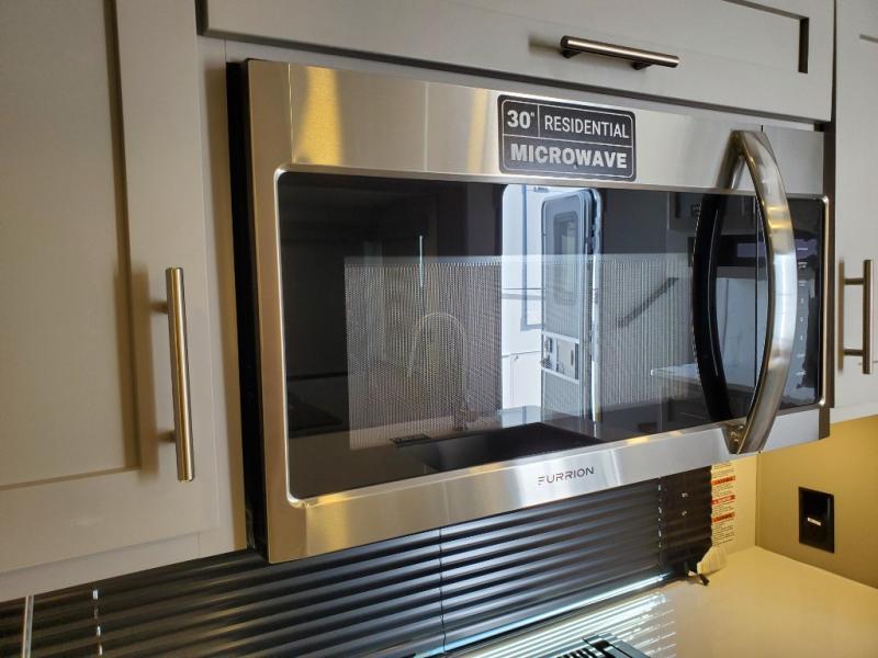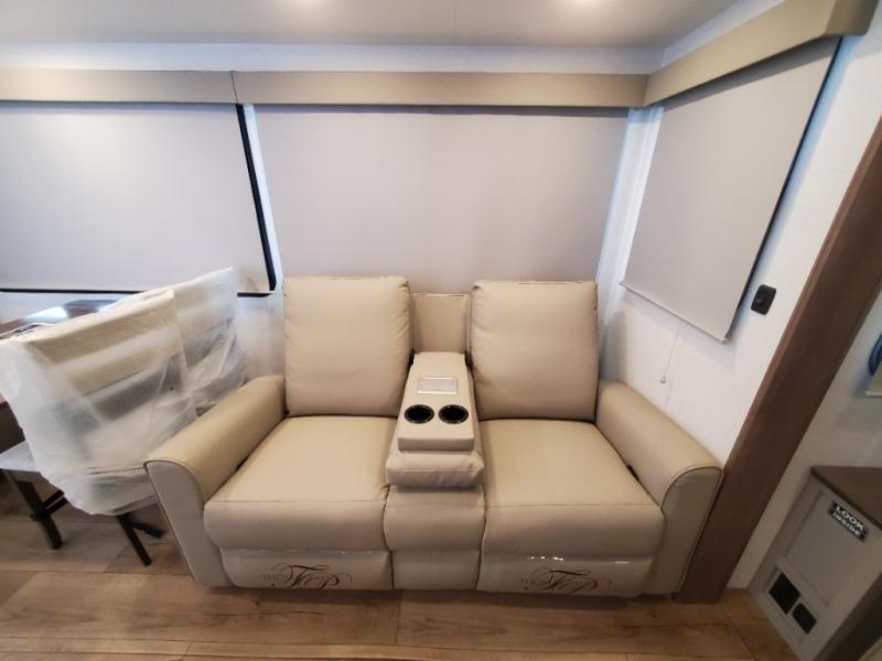 For the couple that enjoys adventures, this rear living coach has everything you need to travel comfortably and take along a couple of friends! The front private bedroom has a queen bed with nightstands on either side for your personal belongings, and a wardrobe to keep your clothes looking nice. Freshen up each morning in the full bathroom with a 30" x 36" shower, and grab a towel stored close by in the linen closet. Now that you're ready for the day, you can head to the kitchen and create a hearty breakfast with the full kitchen amenities. You will appreciate having a 10 cu. ft. 12V refrigerator and three burner cooktop, plus there is a center island with plenty of counter space and a sink to make food prep even easier. Spend your evenings in true relaxation in the dual recliner theater seats across from the swing mount 50" HDTV with hidden storage behind. You will also love the pantry and hutch in the kitchen area for storing all of your dishes and non-perishables. Dine at the floating table with two chairs along with a moveable ottoman featuring storage.