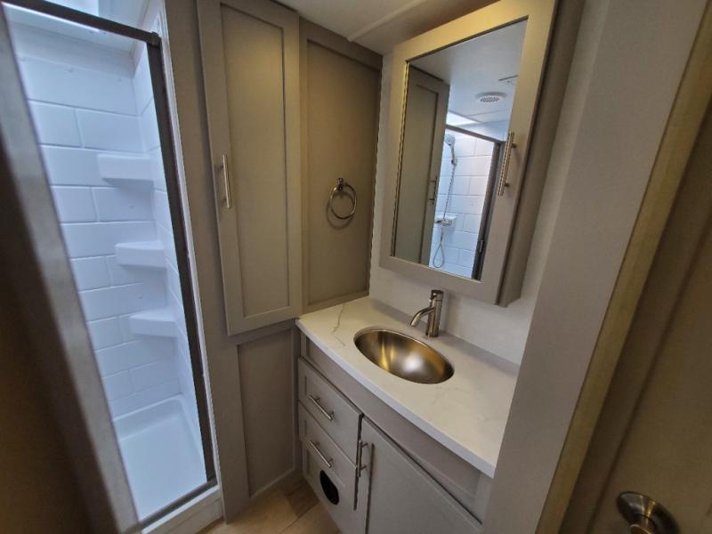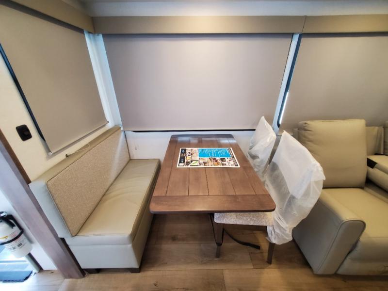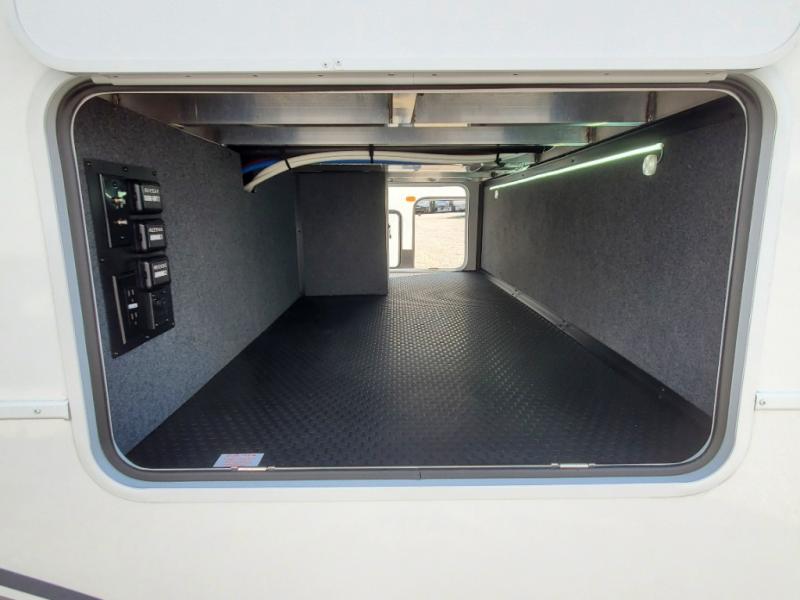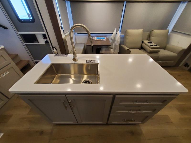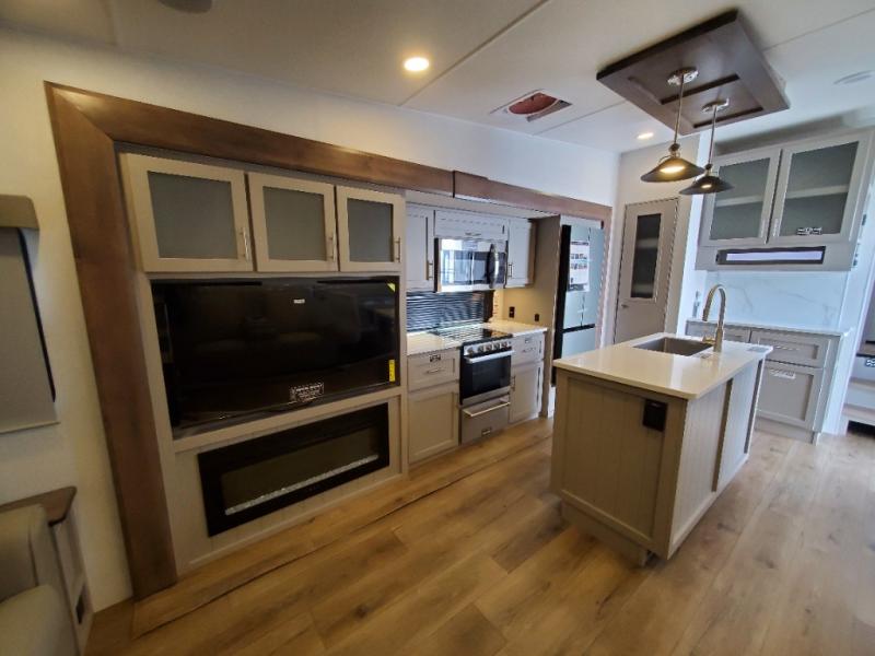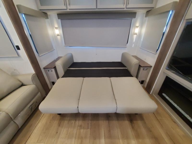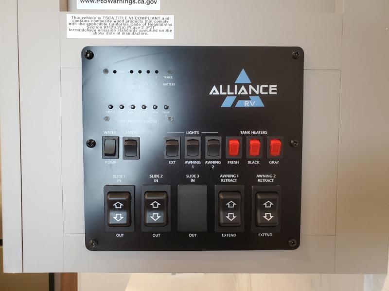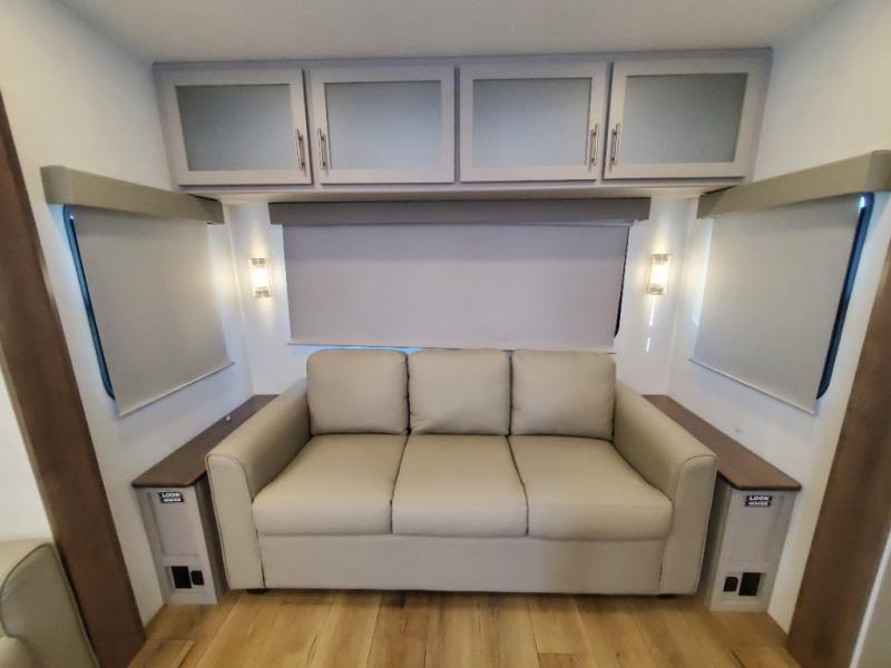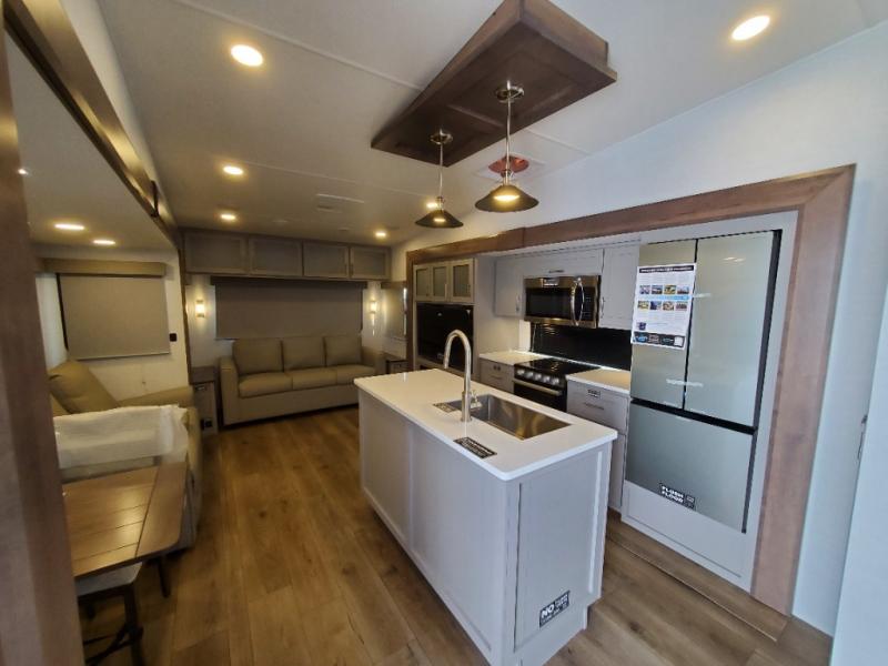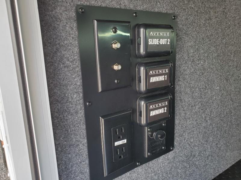 A benchmark chassis creates a space saver upper deck with each one of these Avenue All-Access fifth wheels by Alliance RV! The 101 in. wide-body construction gives you more room to walk around and the flush slide out floors throughout prevent any tripping. There are Azdel composite sidewalls inside and out, and a seamless fully walkable PVC roof for extreme durability and zero maintenance. You are sure to love no carpet throughout making each Avenue All-Access easy to clean and allergen free, not to mention pet friendly. You can maximize your space throughout with innovative storage solutions like the hidden storage behind the TV, inside the end tables, ottoman, and dinette chairs. These units also include the OTG Solar Package with a 200 watt solar panel, 15 amp MPPT charger, multiple outlets, and more to keep you powered up!