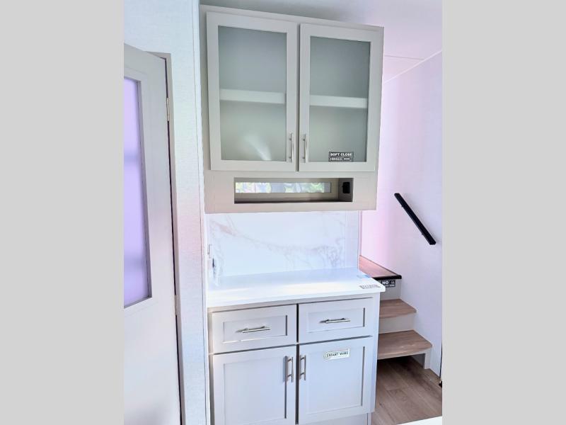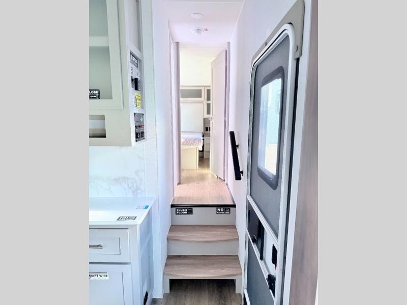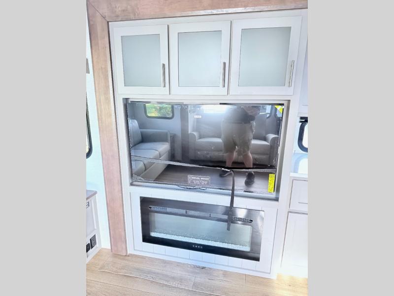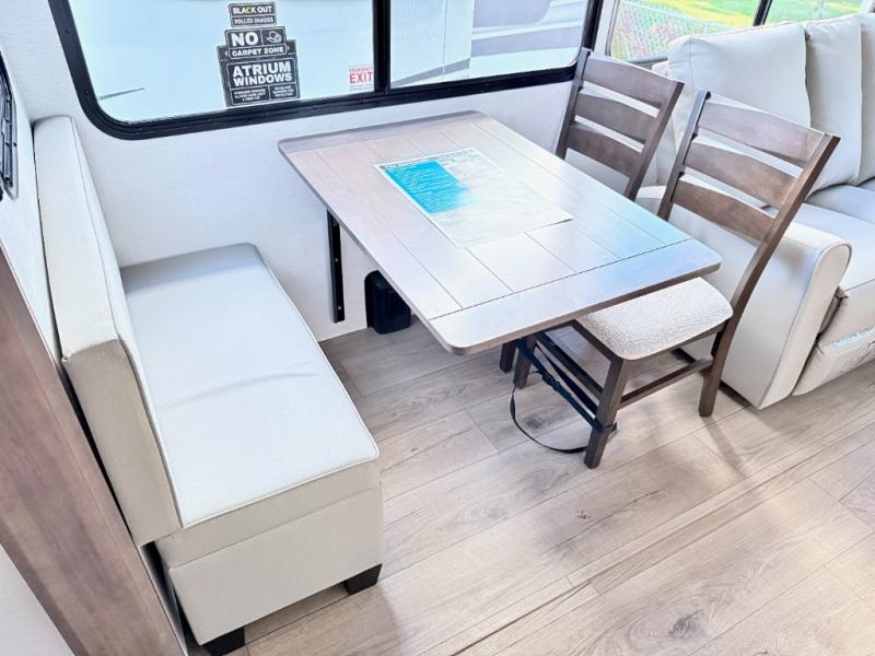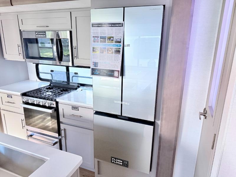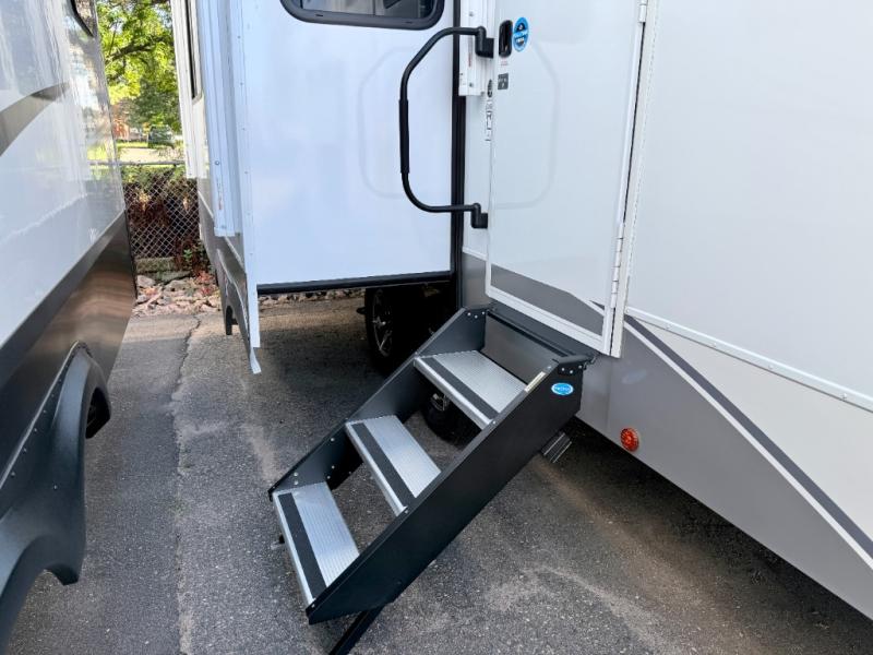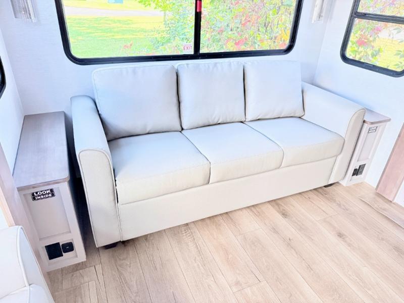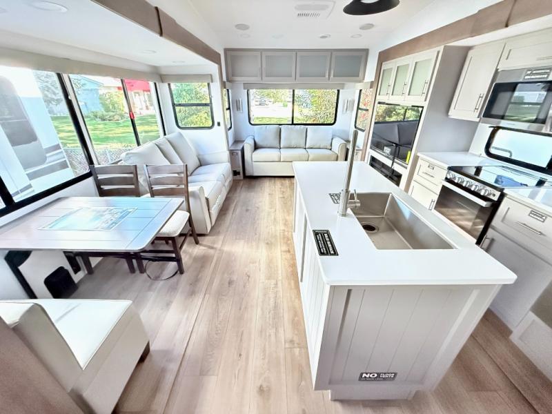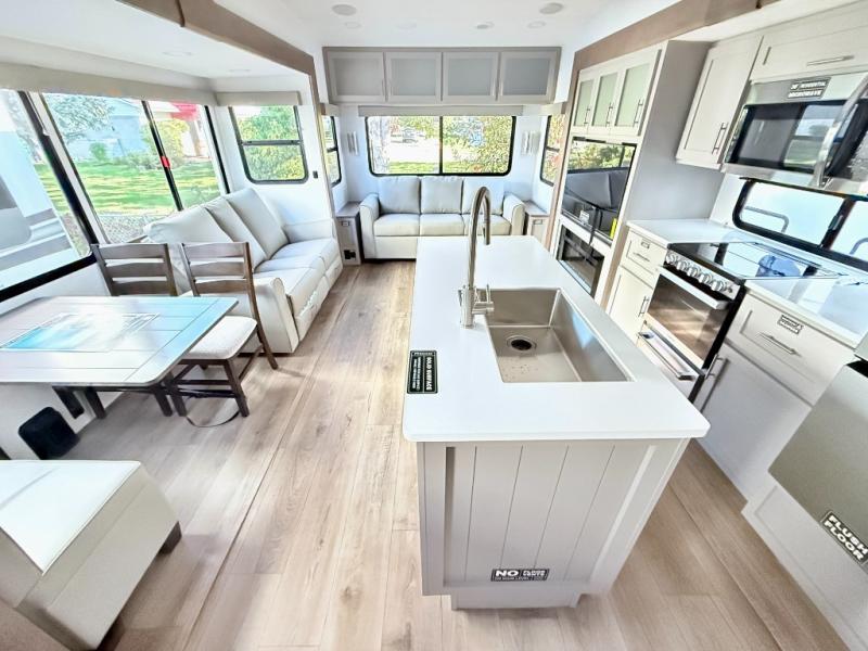 A benchmark chassis creates a space saver upper deck with each one of these Avenue All-Access fifth wheels by Alliance RV! The 101 in. wide-body construction gives you more room to walk around and the flush slide out floors throughout prevent any tripping. There are Azdel composite sidewalls inside and out, and a seamless fully walkable PVC roof for extreme durability and zero maintenance. You are sure to love no carpet throughout making each Avenue All-Access easy to clean and allergen free, not to mention pet friendly. You can maximize your space throughout with innovative storage solutions like the hidden storage behind the TV, inside the end tables, ottoman, and dinette chairs. These units also include the OTG Solar Package with a 200 watt solar panel, 15 amp MPPT charger, multiple outlets, and more to keep you powered up!