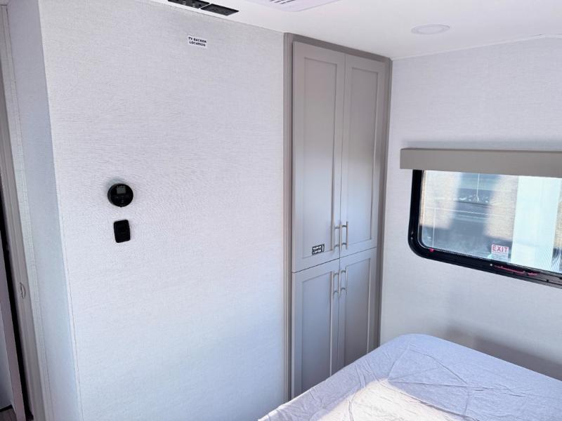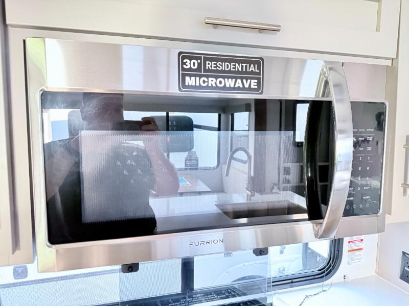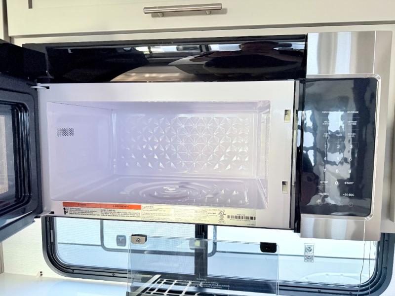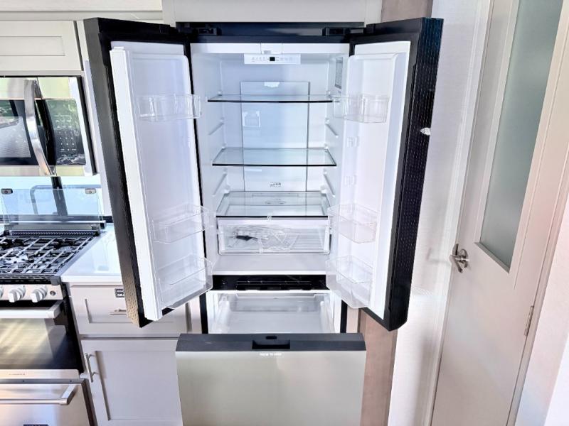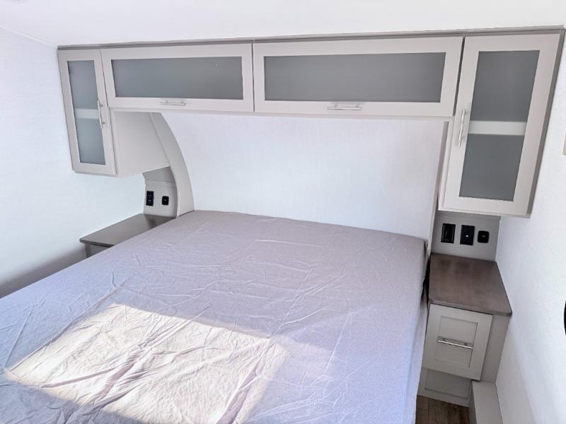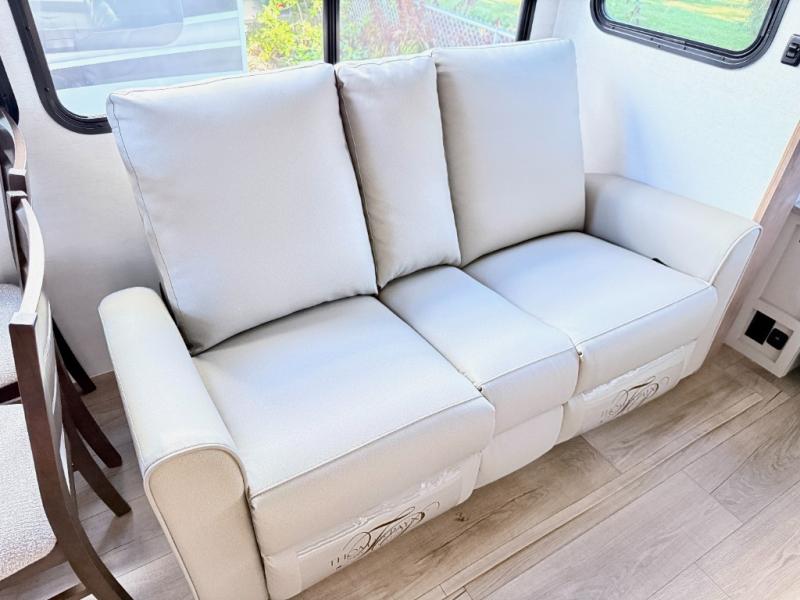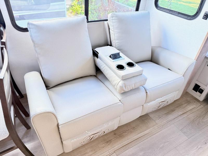 For the couple that enjoys adventures, this rear living coach has everything you need to travel comfortably and take along a couple of friends! The front private bedroom has a queen bed with nightstands on either side for your personal belongings, and a wardrobe to keep your clothes looking nice. Freshen up each morning in the full bathroom with a 30" x 36" shower, and grab a towel stored close by in the linen closet. Now that you're ready for the day, you can head to the kitchen and create a hearty breakfast with the full kitchen amenities. You will appreciate having a 10 cu. ft. 12V refrigerator and three burner cooktop, plus there is a center island with plenty of counter space and a sink to make food prep even easier. Spend your evenings in true relaxation in the dual recliner theater seats across from the swing mount 50" HDTV with hidden storage behind. You will also love the pantry and hutch in the kitchen area for storing all of your dishes and non-perishables. Dine at the floating table with two chairs along with a moveable ottoman featuring storage.