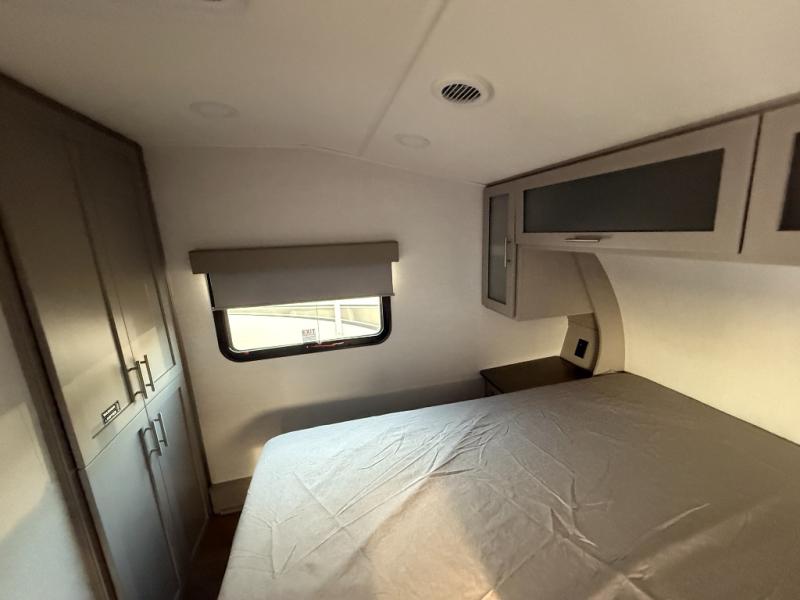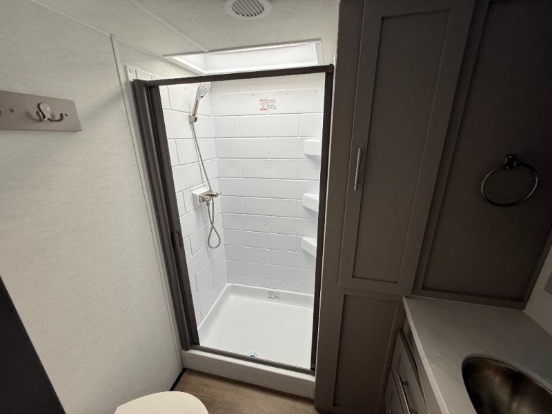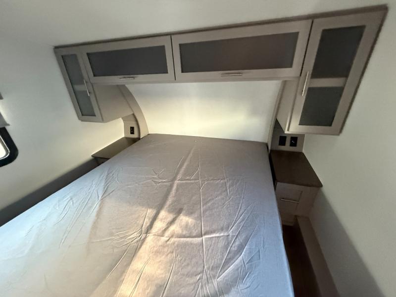 For the couple that enjoys adventures, this rear living coach has everything you need to travel comfortably and take along a couple of friends! The front private bedroom has a queen bed with nightstands on either side for your personal belongings, and a wardrobe to keep your clothes looking nice. Freshen up each morning in the full bathroom with a 30" x 36" shower, and grab a towel stored close by in the linen closet. Now that you're ready for the day, you can head to the kitchen and create a hearty breakfast with the full kitchen amenities. You will appreciate having a 10 cu. ft. 12V refrigerator and three burner cooktop, plus there is a center island with plenty of counter space and a sink to make food prep even easier. Spend your evenings in true relaxation in the dual recliner theater seats across from the swing mount 50" HDTV with hidden storage behind. You will also love the pantry and hutch in the kitchen area for storing all of your dishes and non-perishables. Dine at the floating table with two chairs along with a moveable ottoman featuring storage.