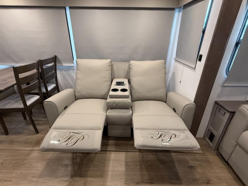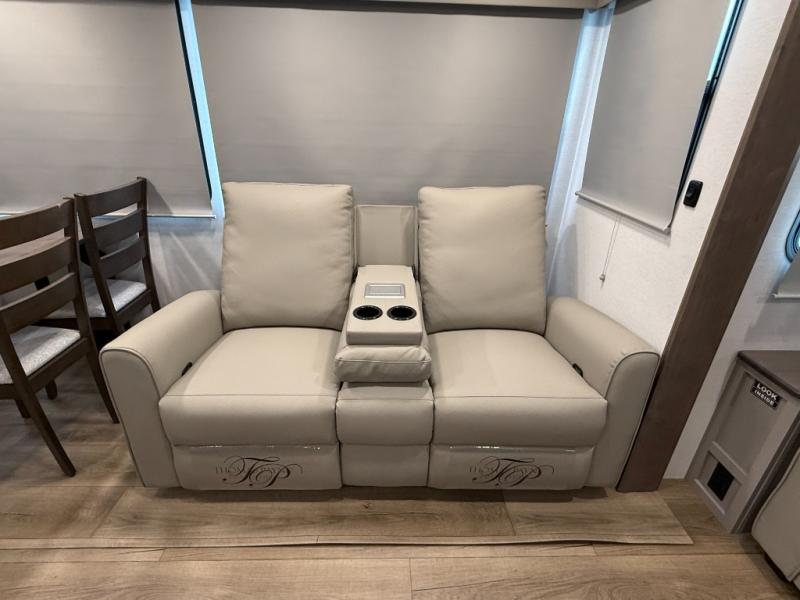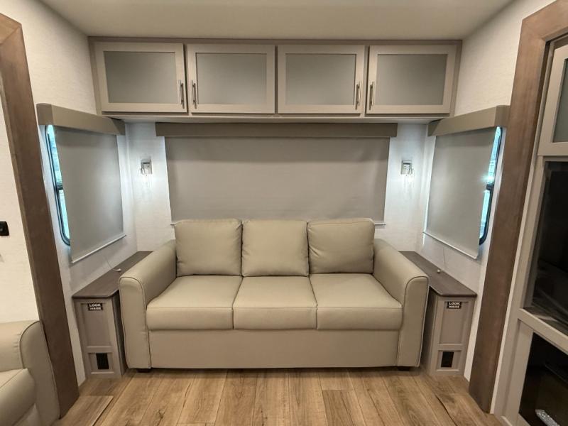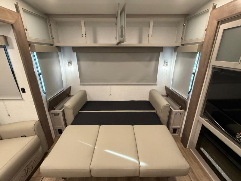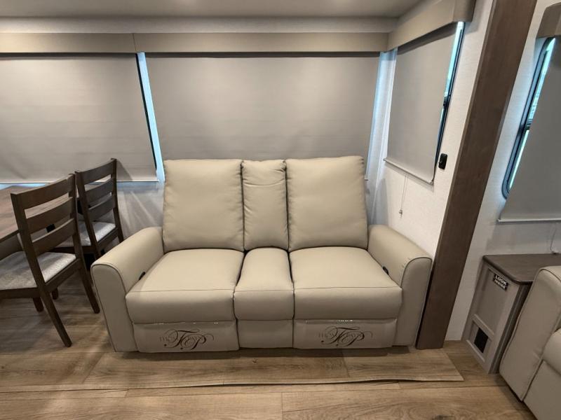 Rear-living layout with dual recliner theater seats and sleeper sofa — great for relaxing or hosting guests.