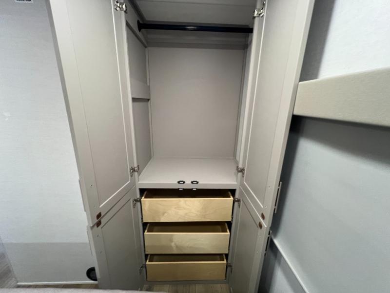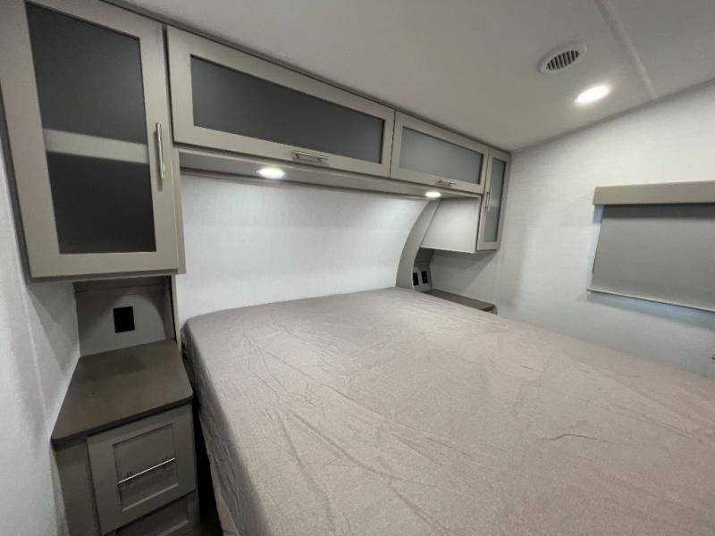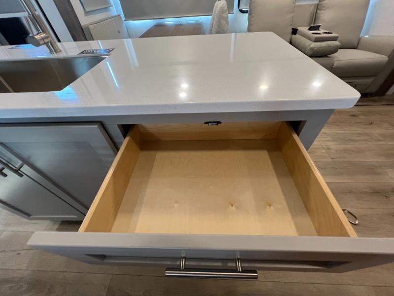 For the couple that enjoys adventures, this rear living coach has everything you need to travel comfortably and take along a couple of friends! The front private bedroom has a queen bed with nightstands on either side for your personal belongings, and a wardrobe to keep your clothes looking nice. Freshen up each morning in the full bathroom with a 30" x 36" shower, and grab a towel stored close by in the linen closet. Now that you're ready for the day, you can head to the kitchen and create a hearty breakfast with the full kitchen amenities. You will appreciate having a 10 cu. ft. 12V refrigerator and three burner cooktop, plus there is a center island with plenty of counter space and a sink to make food prep even easier. Spend your evenings in true relaxation in the dual recliner theater seats across from the swing mount 50" HDTV with hidden storage behind. You will also love the pantry and hutch in the kitchen area for storing all of your dishes and non-perishables. Dine at the floating table with two chairs along with a moveable ottoman featuring storage.
