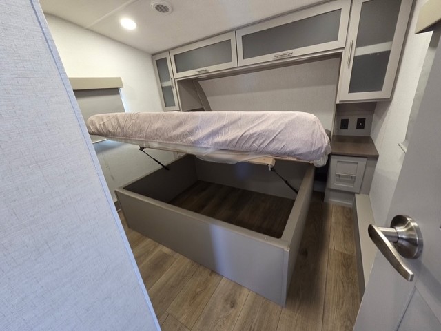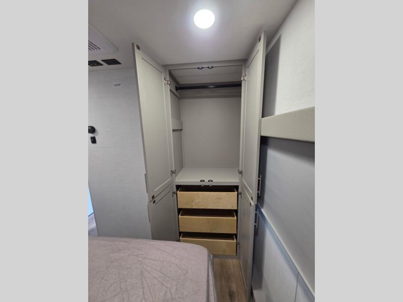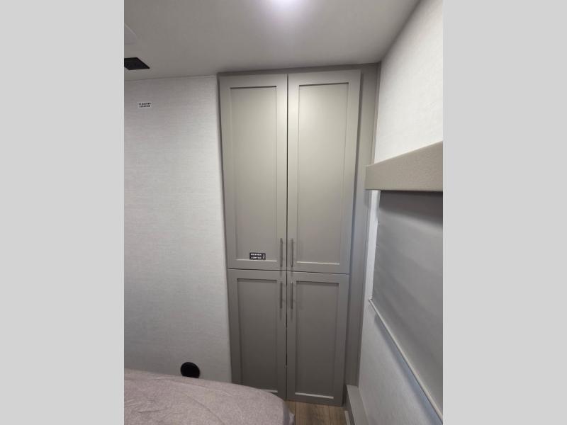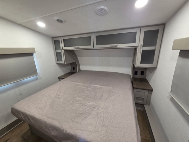 For the couple that enjoys adventures, this rear living coach has everything you need to travel comfortably and take along a couple of friends! The front private bedroom has a queen bed with nightstands on either side for your personal belongings, and a wardrobe to keep your clothes looking nice. Freshen up each morning in the full bathroom with a 30" x 36" shower, and grab a towel stored close by in the linen closet. Now that you're ready for the day, you can head to the kitchen and create a hearty breakfast with the full kitchen amenities. You will appreciate having a 10 cu. ft. 12V refrigerator and three burner cooktop, plus there is a center island with plenty of counter space and a sink to make food prep even easier. Spend your evenings in true relaxation in the dual recliner theater seats across from the swing mount 50" HDTV with hidden storage behind. You will also love the pantry and hutch in the kitchen area for storing all of your dishes and non-perishables. Dine at the floating table with two chairs along with a moveable ottoman featuring storage.