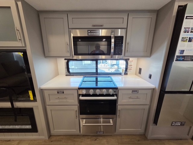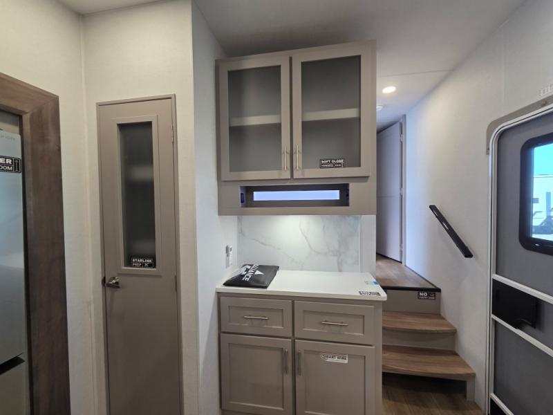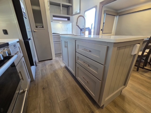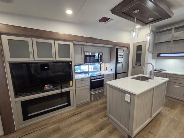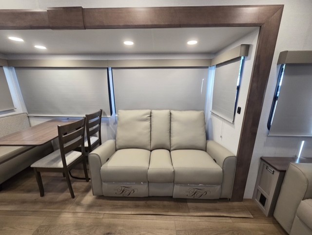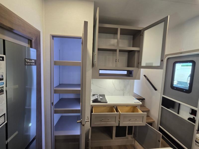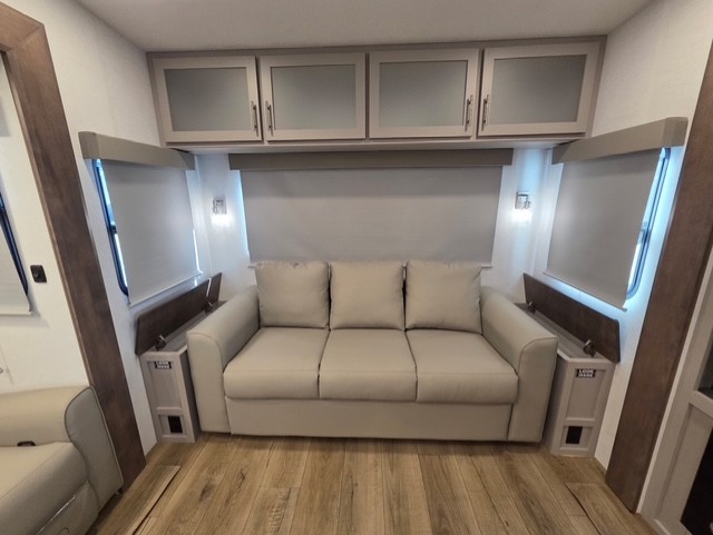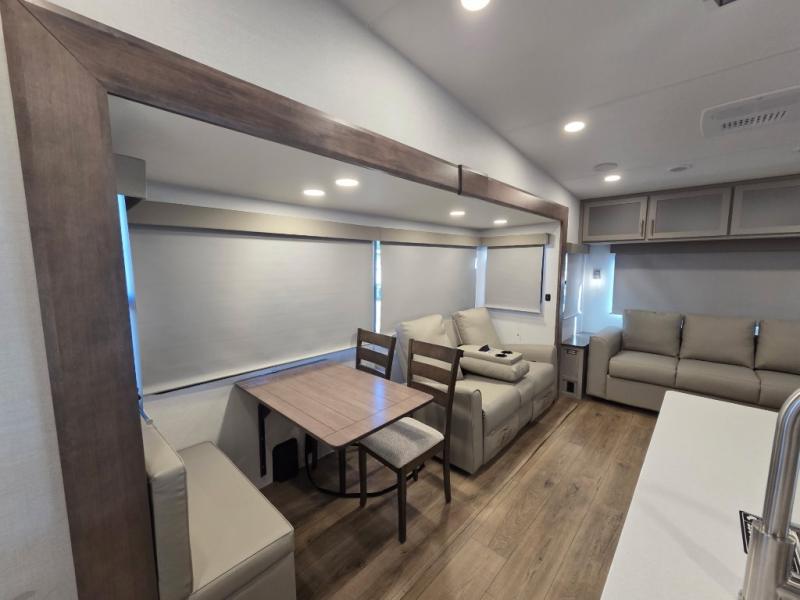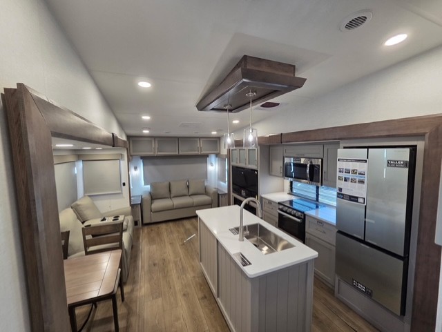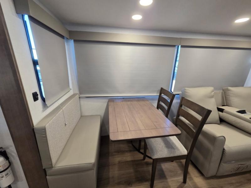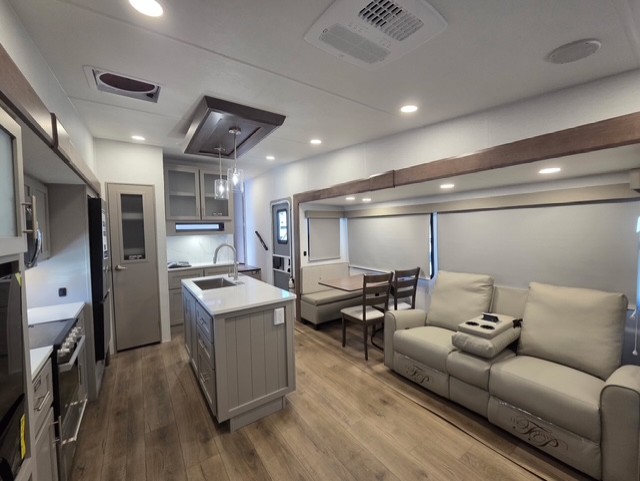 A benchmark chassis creates a space saver upper deck with each one of these Avenue All-Access fifth wheels by Alliance RV! The 101 in. wide-body construction gives you more room to walk around and the flush slide out floors throughout prevent any tripping. There are composite sidewalls inside and out, and PVC roof for extreme durability. You are sure to love no carpet throughout making each Avenue All-Access easy to clean and allergen free, not to mention pet friendly. You can maximize your space throughout with innovative storage solutions like the hidden storage behind the TV, inside the end tables, ottoman, and dinette chairs. These units also include the OTG Solar Package with a 200 watt solar panel, 15 amp MPPT charger, multiple outlets, and more to keep you powered up!