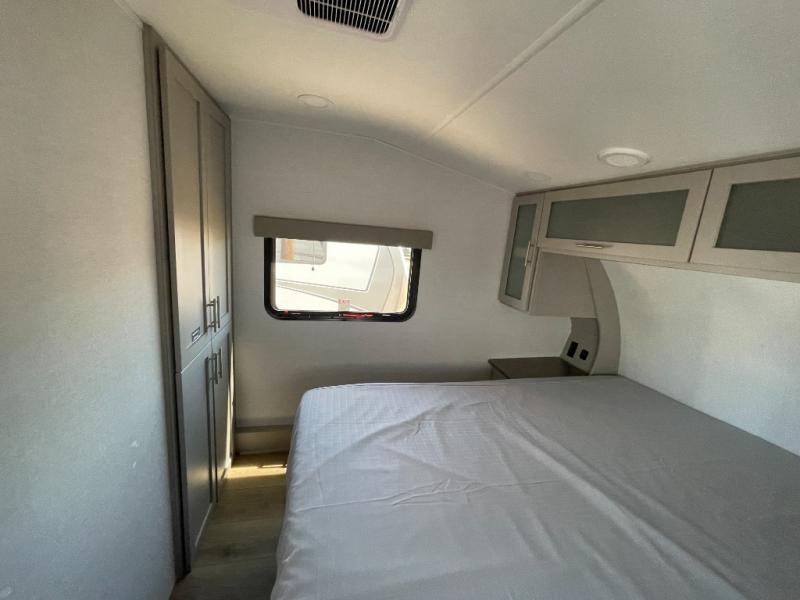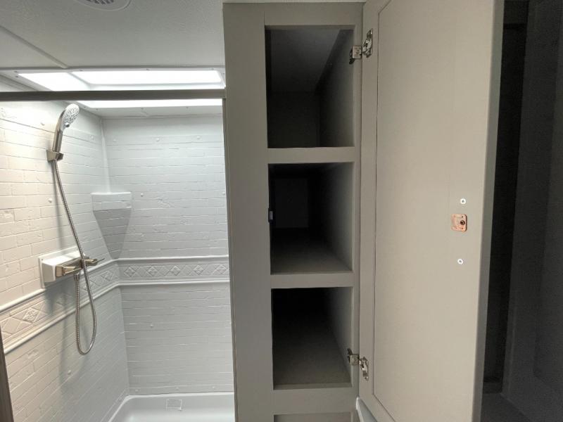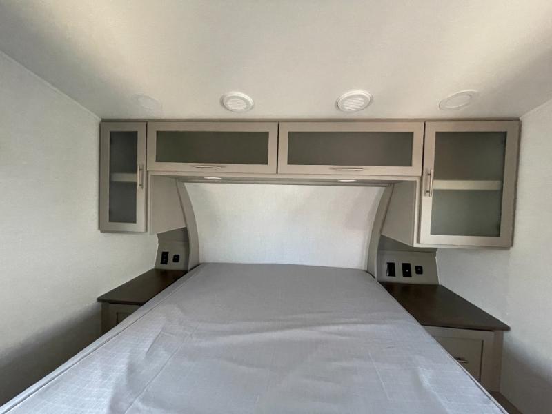For the couple that enjoys adventures, this rear living coach has everything you need to travel comfortably and take along a couple of friends! The front private bedroom has a queen bed with nightstands on either side for your personal belongings, and a wardrobe to keep your clothes looking nice. Freshen up each morning in the full bathroom with a 30" x 36" shower, and grab a towel stored close by in the linen closet. Now that you're ready for the day, you can head to the kitchen and create a hearty breakfast with the full kitchen amenities. You will appreciate having a 10 cu. ft. 12V refrigerator and three burner cooktop, plus there is a center island with plenty of counter space and a sink to make food prep even easier. Spend your evenings in true relaxation in the dual recliner theater seats across from the swing mount 50" HDTV with hidden storage behind. You will also love the pantry and hutch in the kitchen area for storing all of your dishes and non-perishables. Dine at the floating table with two chairs along with a moveable ottoman featuring storage.