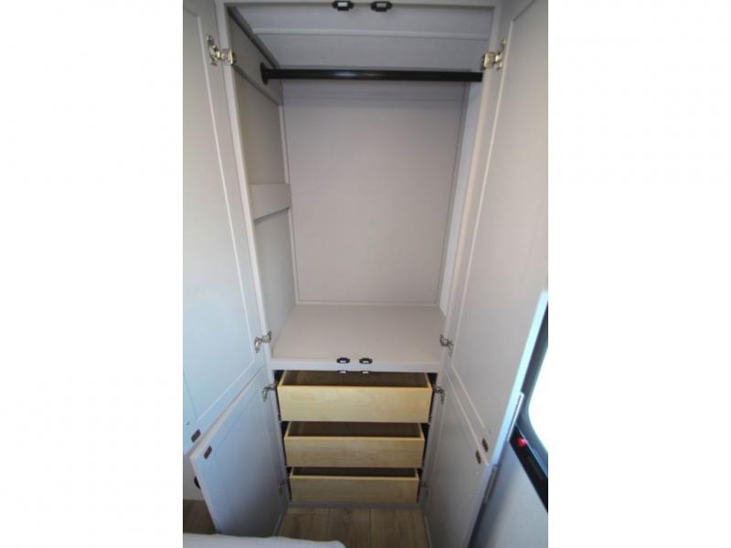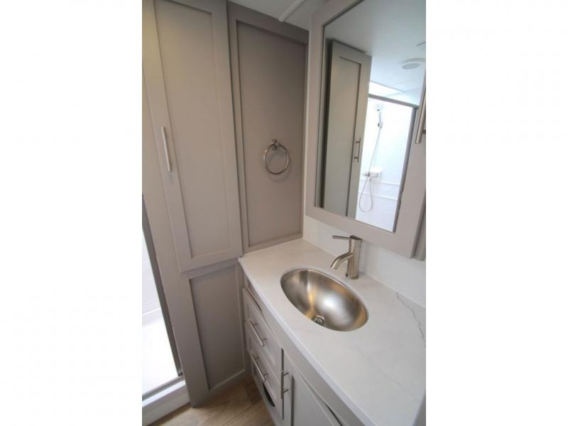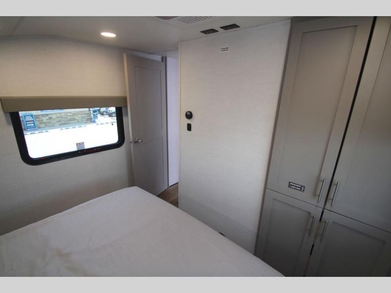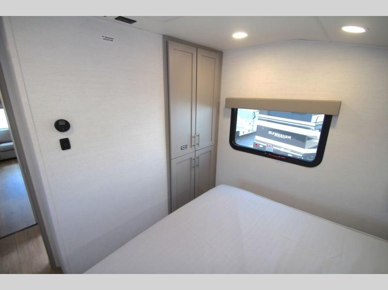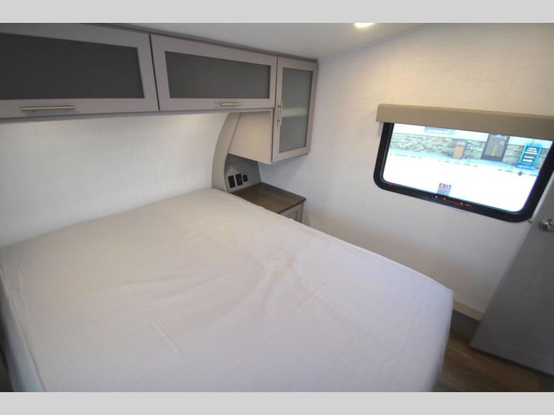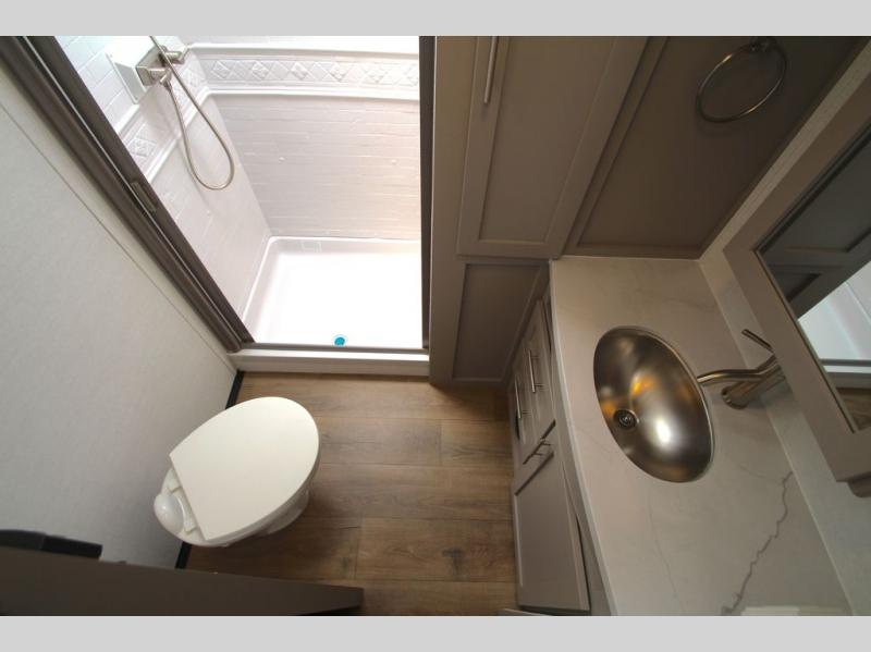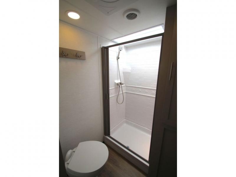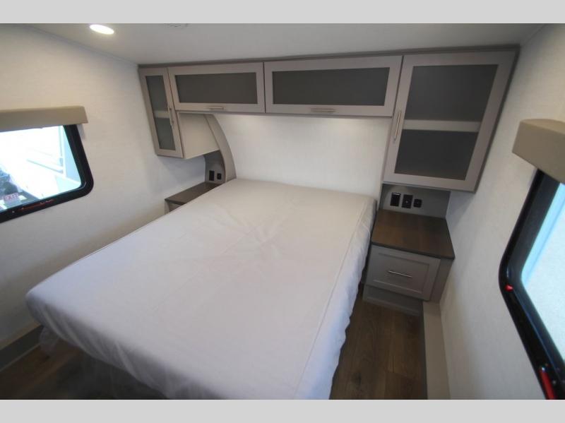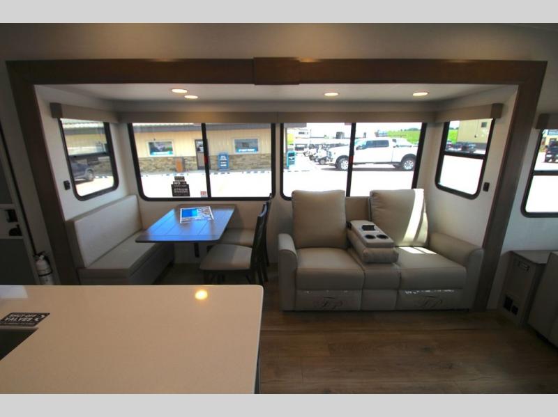 For the couple that enjoys adventures, this rear living coach has everything you need to travel comfortably and take along a couple of friends! The front private bedroom has a queen bed with nightstands on either side for your personal belongings, and a wardrobe to keep your clothes looking nice. Freshen up each morning in the full bathroom with a 30" x 36" shower, and grab a towel stored close by in the linen closet. Now that you're ready for the day, you can head to the kitchen and create a hearty breakfast with the full kitchen amenities. You will appreciate having a 10 cu. ft. 12V refrigerator and three burner cooktop, plus there is a center island with plenty of counter space and a sink to make food prep even easier. Spend your evenings in true relaxation in the dual recliner theater seats across from the swing mount 50" HDTV with hidden storage behind. You will also love the pantry and hutch in the kitchen area for storing all of your dishes and non-perishables. Dine at the floating table with two chairs along with a moveable ottoman featuring storage.