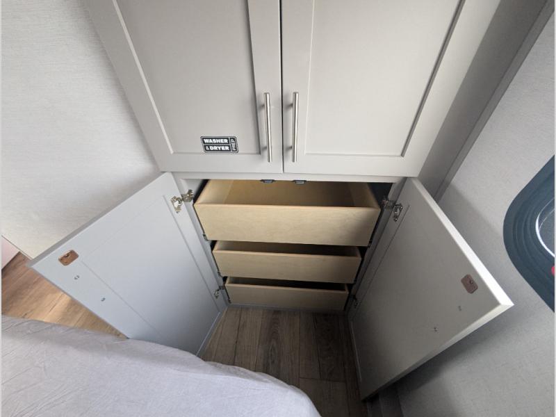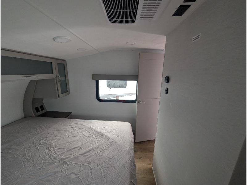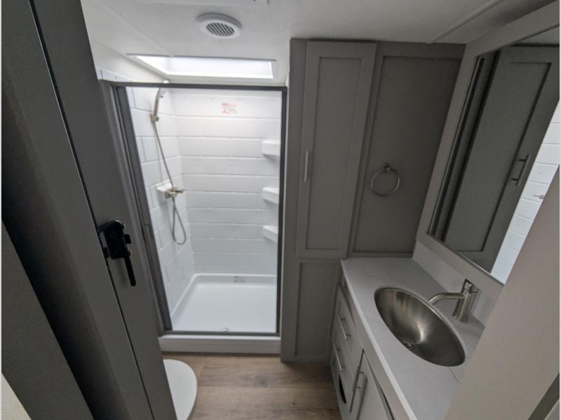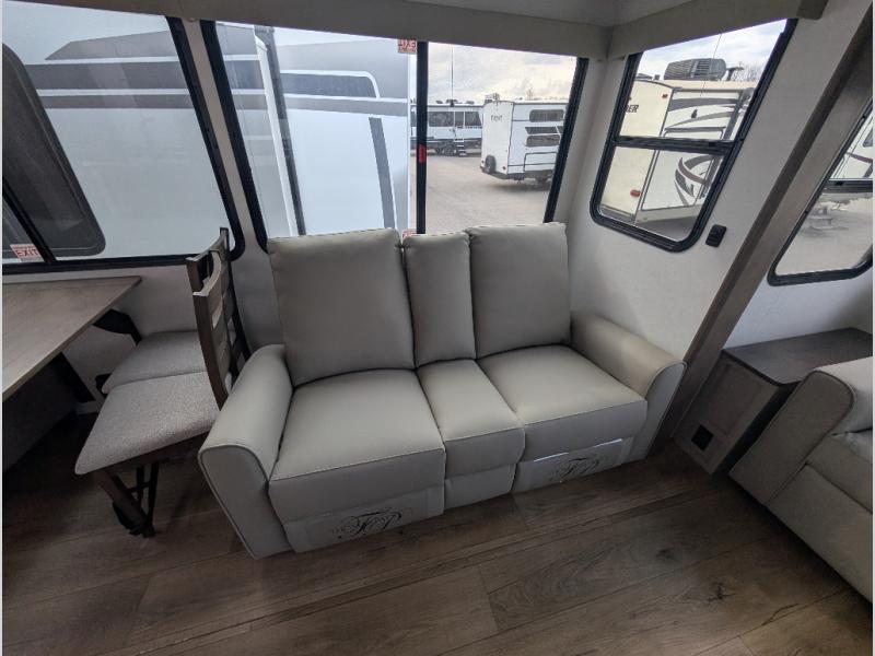 For the couple that enjoys adventures, this rear living coach has everything you need to travel comfortably and take along a couple of friends! The front private bedroom has a queen bed with nightstands on either side for your personal belongings, and a wardrobe to keep your clothes looking nice. Freshen up each morning in the full bathroom with a 30" x 36" shower, and grab a towel stored close by in the linen closet. Now that you're ready for the day, you can head to the kitchen and create a hearty breakfast with the full kitchen amenities. You will appreciate having a 10 cu. ft. 12V refrigerator and three burner cooktop, plus there is a center island with plenty of counter space and a sink to make food prep even easier. Spend your evenings in true relaxation in the dual recliner theater seats across from the swing mount 50" HDTV with hidden storage behind. You will also love the pantry and hutch in the kitchen area for storing all of your dishes and non-perishables. Dine at the floating table with two chairs along with a moveable ottoman featuring storage.