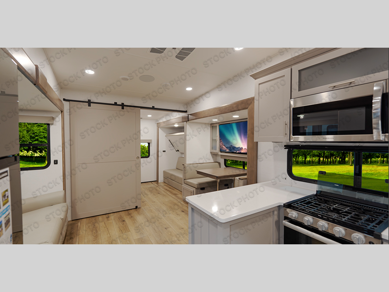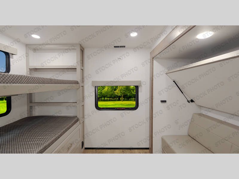 If you've been searching for a fifth wheel with more sleeping space, this is the one! You will find a queen bed in the front private bedroom, along with a wardrobe with washer and dryer prep and overhead storage for your things. Your guests can take the rear bunkhouse that includes 40" x 72" bunks across from a slide out with a flip-up bunk and cube sofa below. Everyone can meet in the middle living area and kitchen to relax on the sofa that is in direct view of the 50" Class HDTV. There is also a booth dinette table here to dine together. If the weather is nice, you may just find yourselves outdoors since there are two awnings and an exterior griddle!