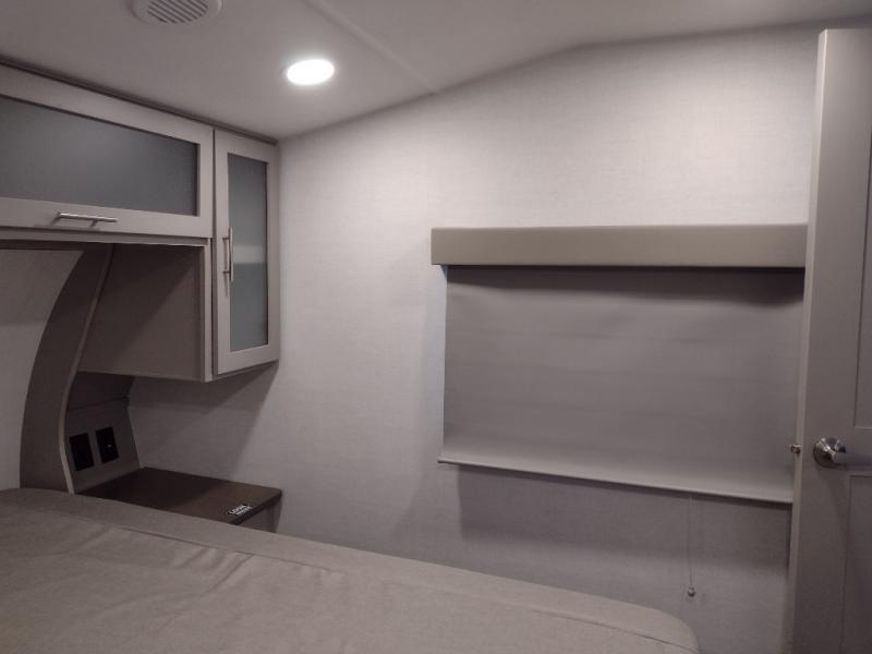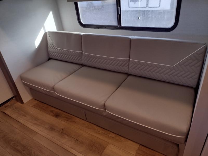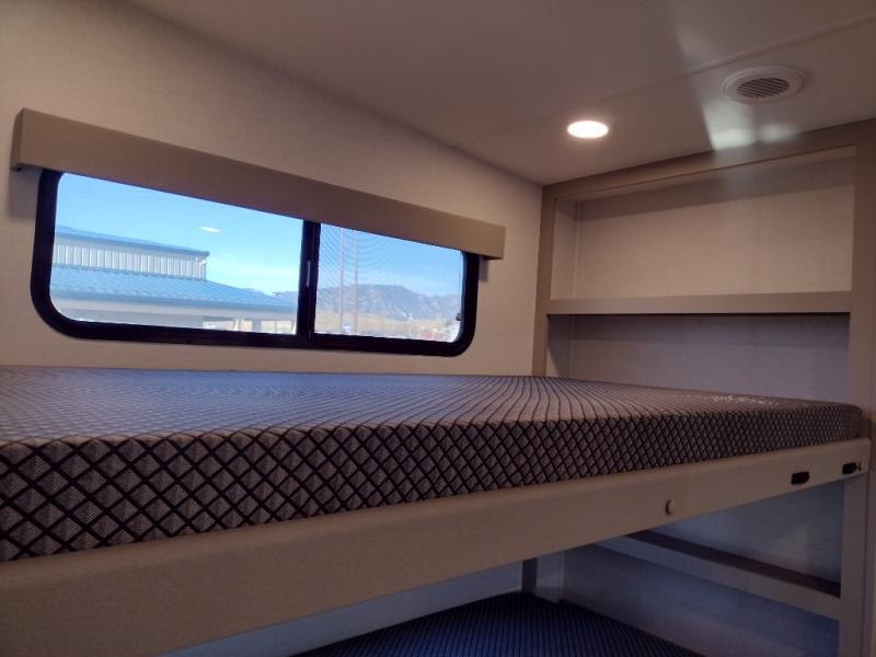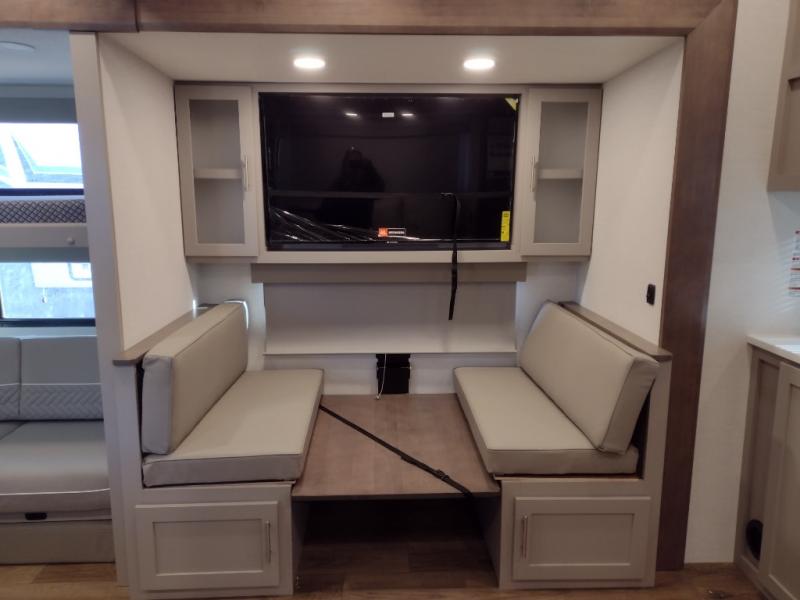 If you've been searching for a fifth wheel with more sleeping space, this is the one! You will find a queen bed in the front private bedroom, along with a wardrobe with washer and dryer prep and overhead storage for your things. Your guests can take the rear bunkhouse that includes 40" x 72" bunks across from a slide out with a flip-up bunk and cube sofa below. Everyone can meet in the middle living area and kitchen to relax on the sofa that is in direct view of the 50" Class HDTV. There is also a booth dinette table here to dine together. If the weather is nice, you may just find yourselves outdoors since there are two awnings and an exterior griddle!