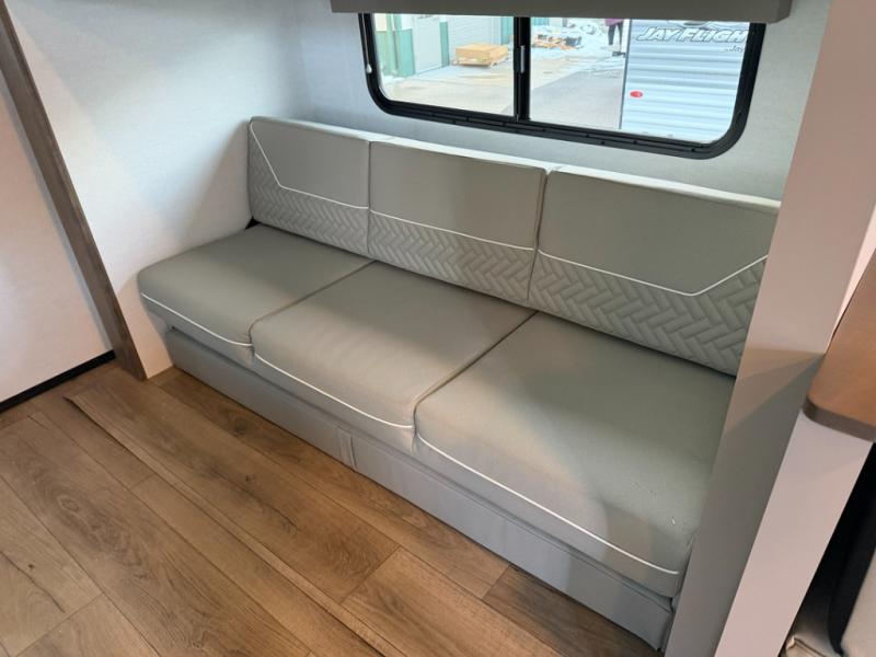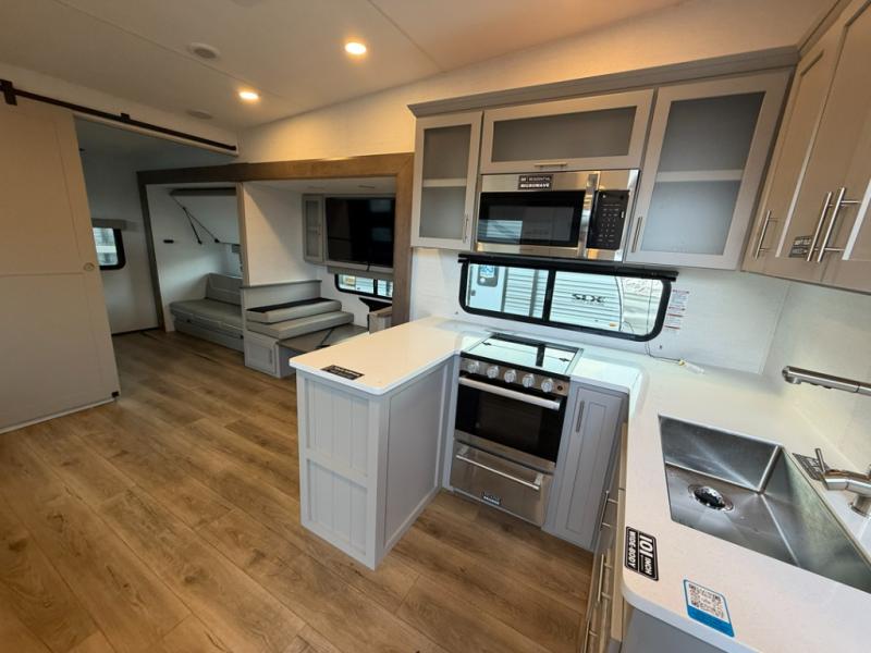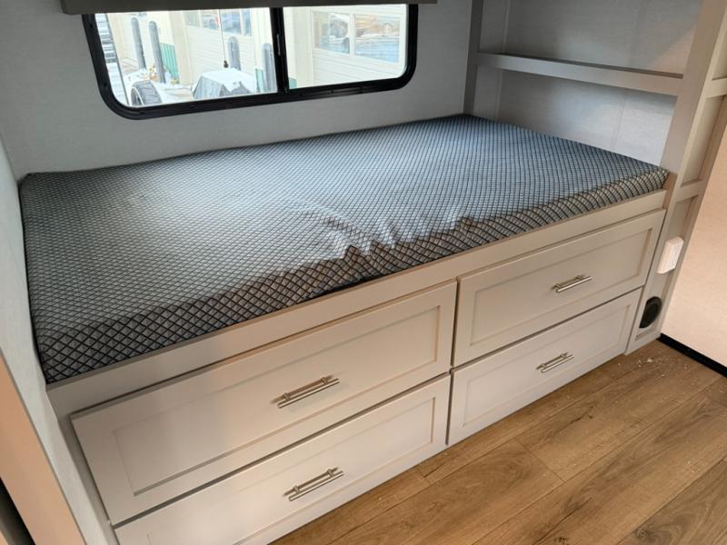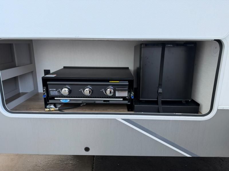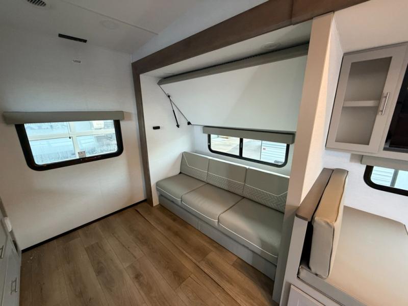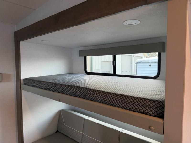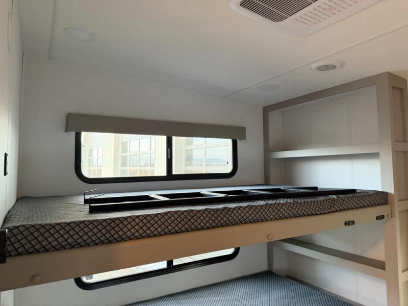 If you've been searching for a fifth wheel with more sleeping space, this is the one! You will find a queen bed in the front private bedroom, along with a wardrobe with washer and dryer prep and overhead storage for your things. Your guests can take the rear bunkhouse that includes 40" x 72" bunks across from a slide out with a flip-up bunk and cube sofa below. Everyone can meet in the middle living area and kitchen to relax on the sofa that is in direct view of the 50" Class HDTV. There is also a booth dinette table here to dine together. If the weather is nice, you may just find yourselves outdoors since there are two awnings and an exterior griddle!