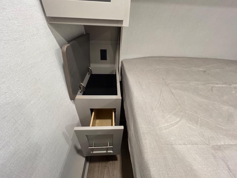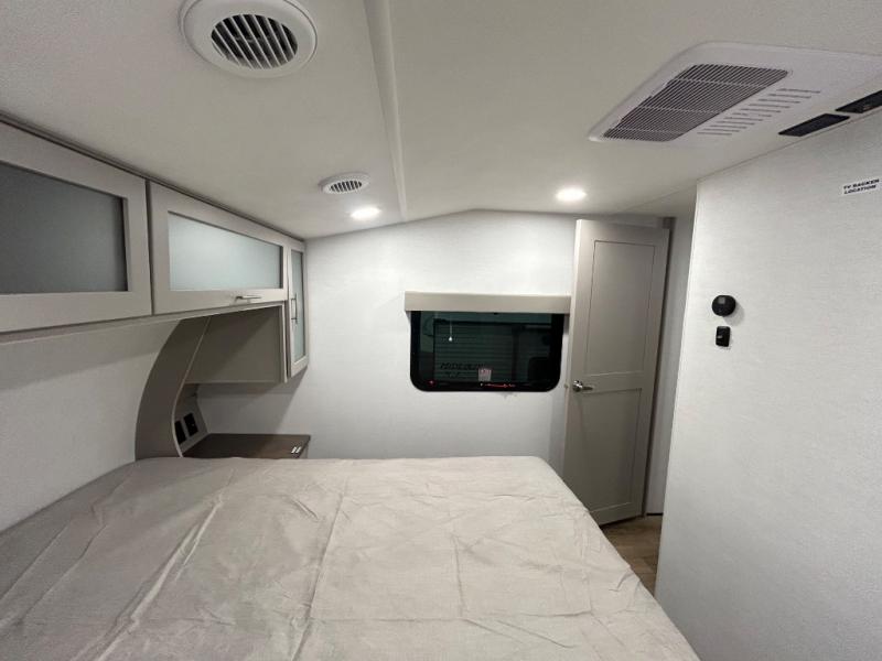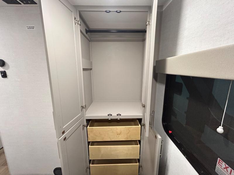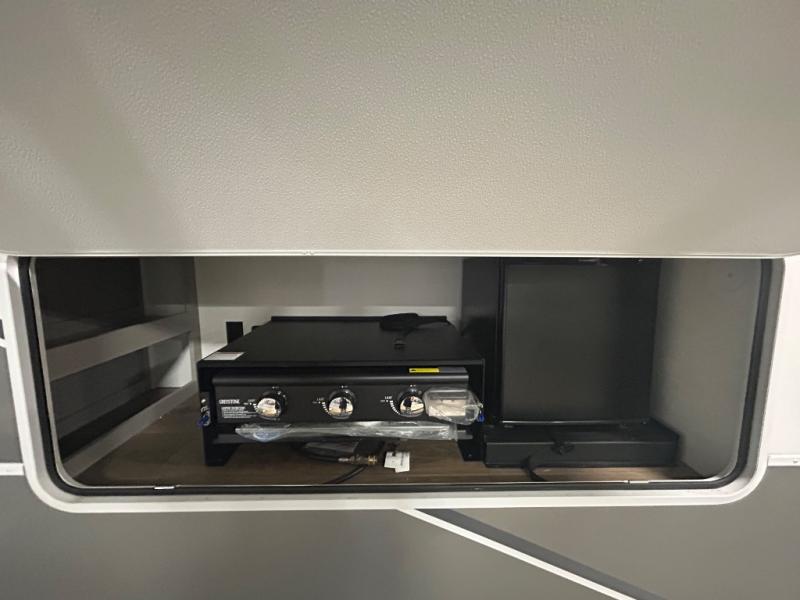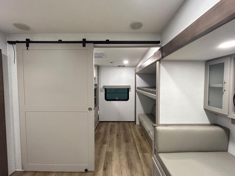 If you've been searching for a fifth wheel with more sleeping space, this is the one! You will find a queen bed in the front private bedroom, along with a wardrobe with washer and dryer prep and overhead storage for your things. Your guests can take the rear bunkhouse that includes 40" x 72" bunks across from a slide out with a flip-up bunk and cube sofa below. Everyone can meet in the middle living area and kitchen to relax on the sofa that is in direct view of the 50" Class HDTV. There is also a booth dinette table here to dine together. If the weather is nice, you may just find yourselves outdoors since there are two awnings and an exterior griddle!