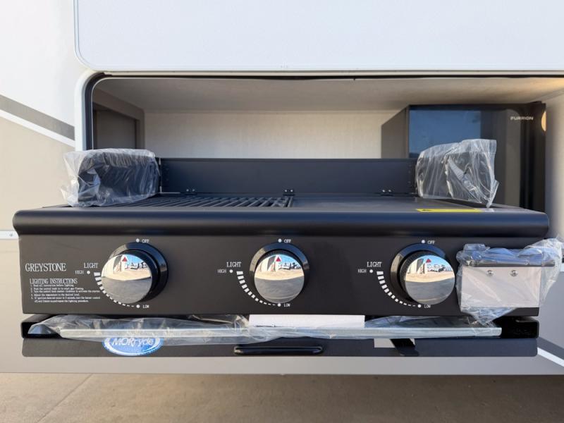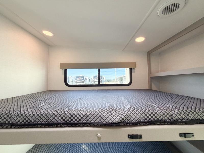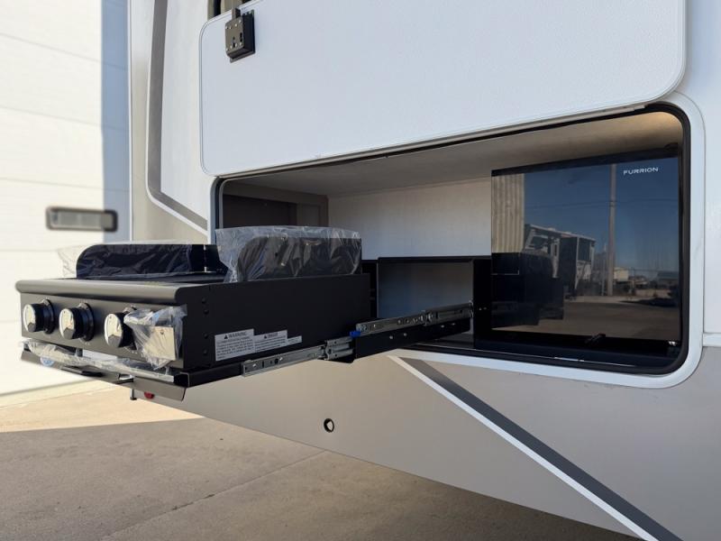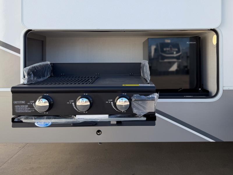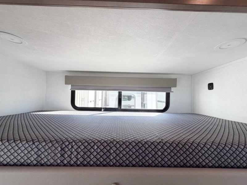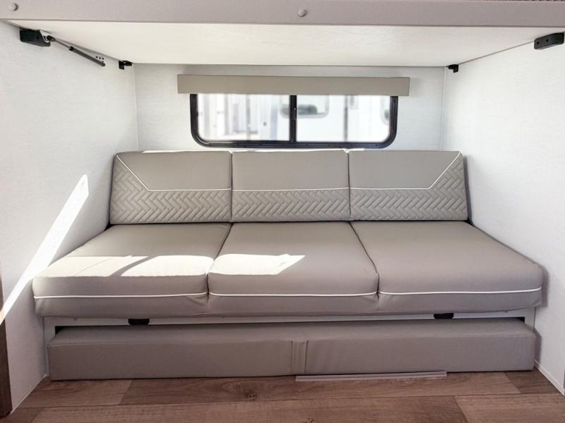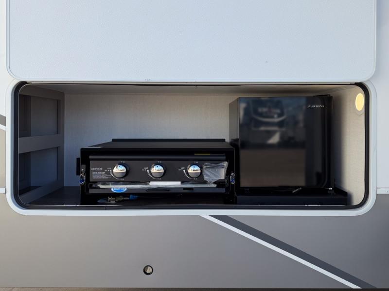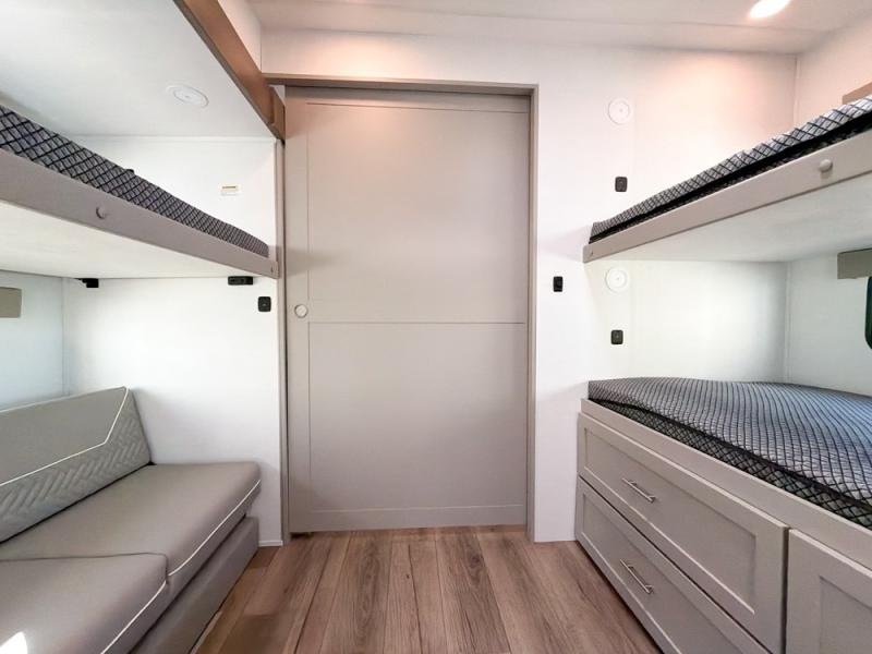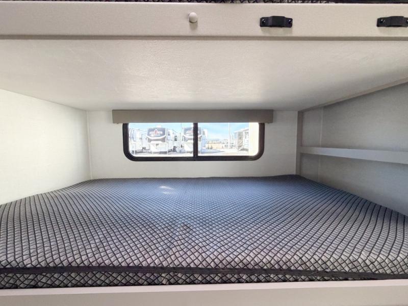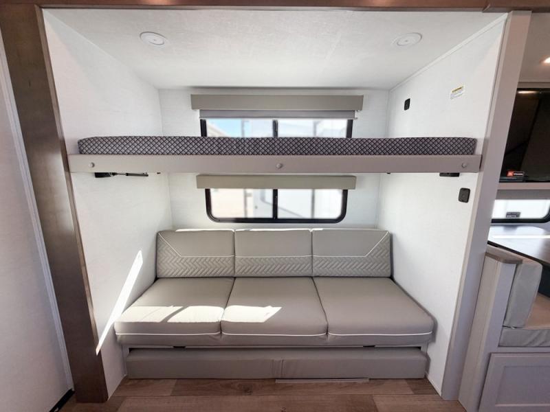 If you've been searching for a fifth wheel with more sleeping space, this is the one! You will find a queen bed in the front private bedroom, along with a wardrobe with washer and dryer prep and overhead storage for your things. Your guests can take the rear bunkhouse that includes 40" x 72" bunks across from a slide out with a flip-up bunk and cube sofa below. Everyone can meet in the middle living area and kitchen to relax on the sofa that is in direct view of the 50" Class HDTV. There is also a booth dinette table here to dine together. If the weather is nice, you may just find yourselves outdoors since there are two awnings and an exterior griddle!