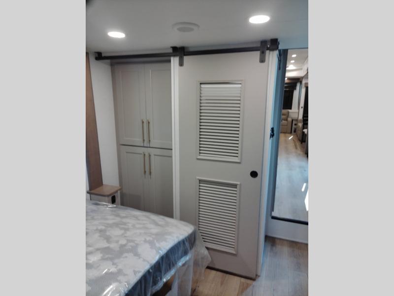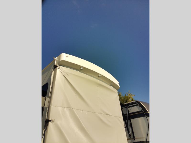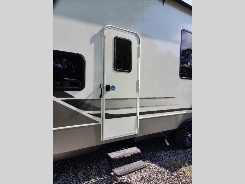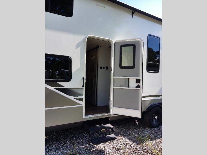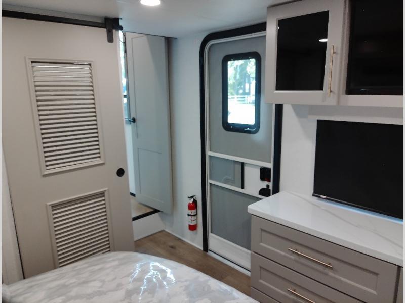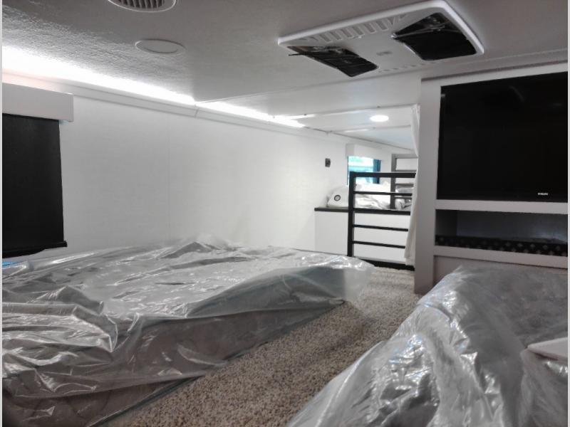This destination trailer with a loft will be a favorite with the little ones! They will have three bunk mats to choose from plus a wardrobe to keep their things picked up. You can take the rear private bedroom that includes a power tilting king bed that will allow you to sit up in bed at night to read. There is also a wardrobe, a dresser with a 32" TV, and a stackable washer and dryer to make laundry day easier than ever. A full bath with a 48" x 30" shower will let you freshen up each day, and there is a linen closet to keep clean towels close by. Everyone will enjoy spending time together in the front living area that includes a two dual recliner theater seats, a 50" TV and fireplace, and hidden storage for games or books. The chef of your group can make meals each day on the residential range and microwave, and there is a 110V Samsung refrigerator to keep your food fresh.
