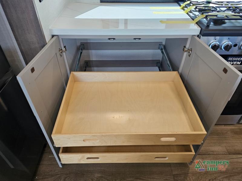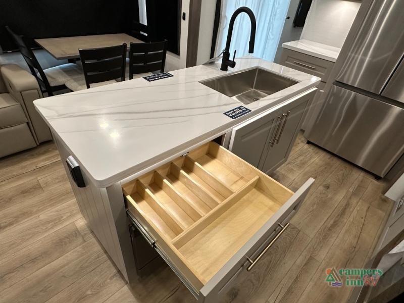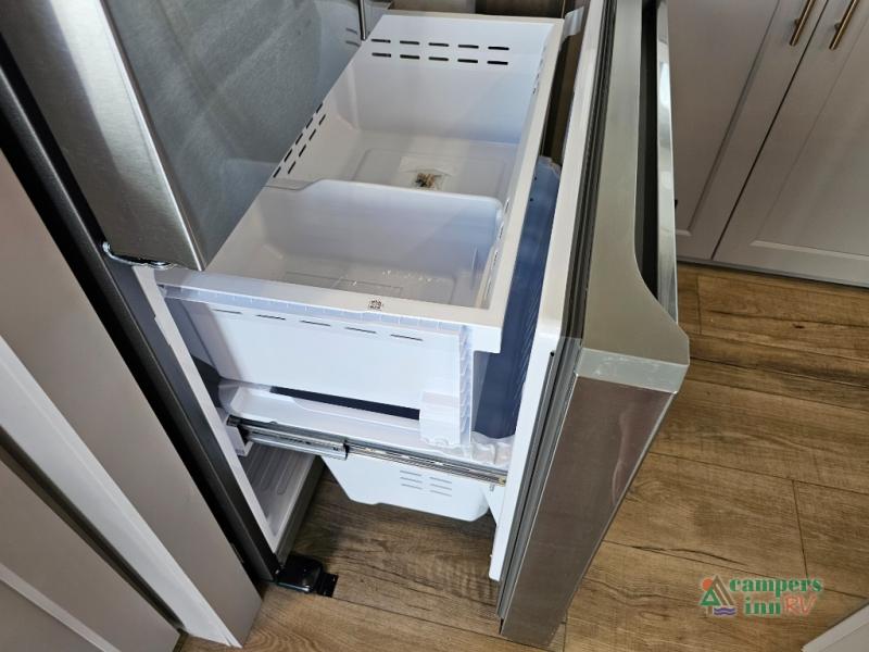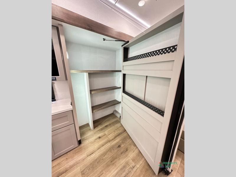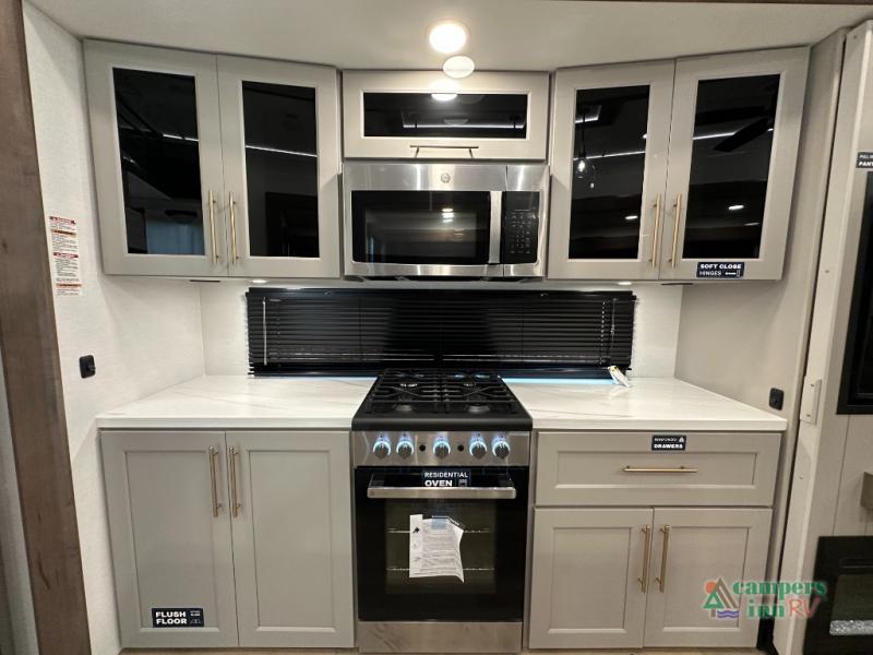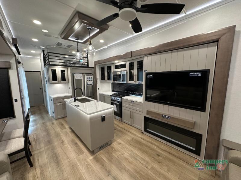 This destination trailer with a loft will be a favorite with the little ones! They will have three bunk mats to choose from plus a wardrobe to keep their things picked up. You can take the rear private bedroom that includes a power tilting king bed that will allow you to sit up in bed at night to read. There is also a wardrobe, a dresser with a 32" TV, and a stackable washer and dryer to make laundry day easier than ever. A full bath with a 48" x 30" shower will let you freshen up each day, and there is a linen closet to keep clean towels close by. Everyone will enjoy spending time together in the front living area that includes a two dual recliner theater seats, a 50" TV and fireplace, and hidden storage for games or books. The chef of your group can make meals each day on the residential range and microwave, and there is a 110V Samsung refrigerator to keep your food fresh.