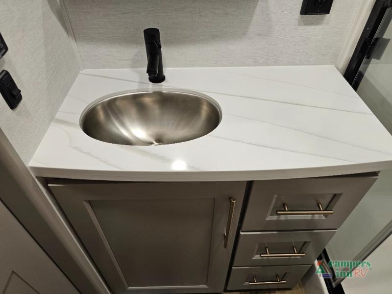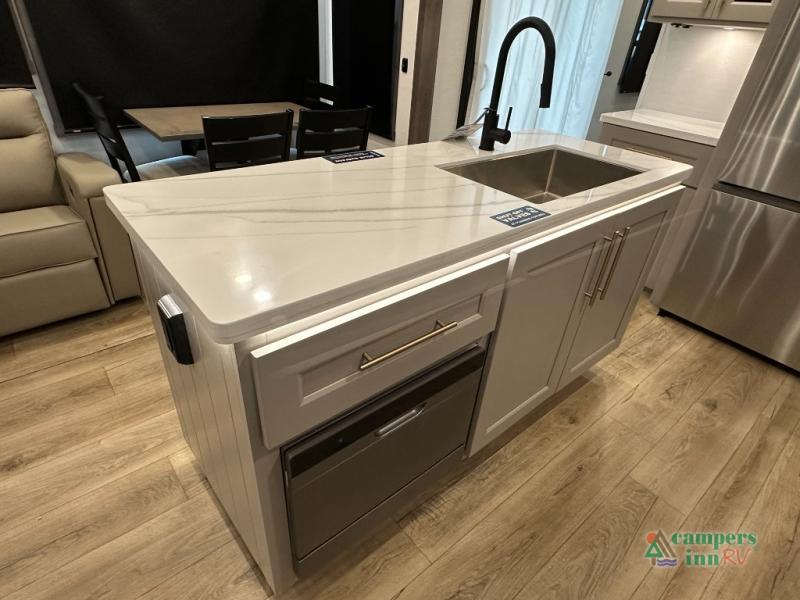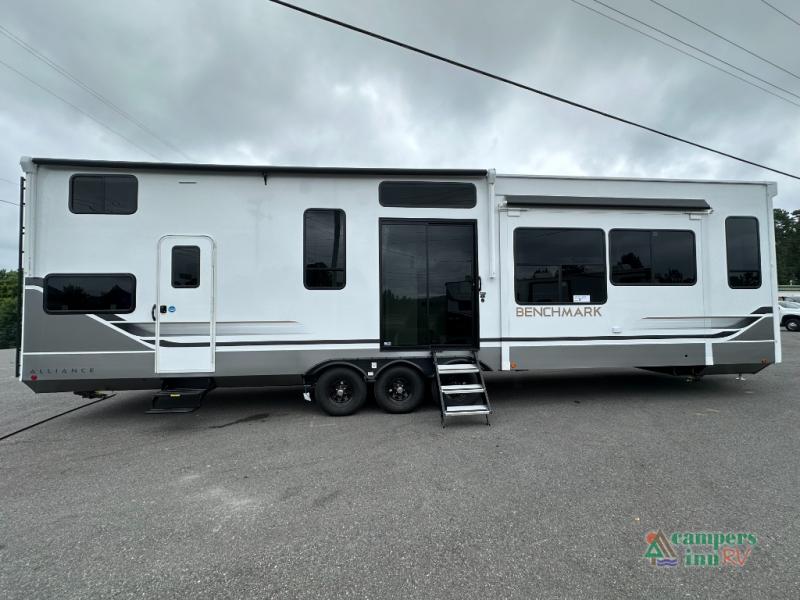 With any Benchmark destination trailer by Alliance RV, you will enjoy luxury features at every turn! The high gloss fiberglass exterior is ultra sleek, and the Azdel composite fiberglass sidewalls add durability so you can camp for years to come. You'll also find a residential exterior garden hose connection outside, along with a powder coated aluminum rear ladder, and an auxiliary LP tank hook up if you want to bring your grill along. Head inside to find hardwood cabinetry, solid surface countertops throughout, oversized windows in all rooms, and MCD roller shades throughout. The 45,000 BTU A/C and 60,000 BTU furnace will keep you comfortable year around, and there is a stackable washer and dryer to make full-time RV living easier than ever!