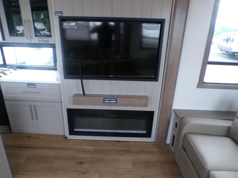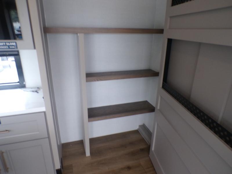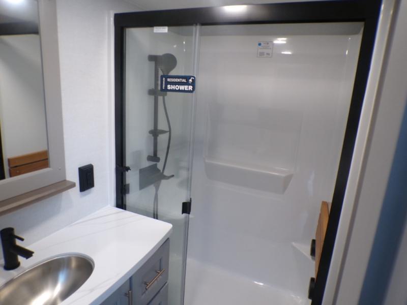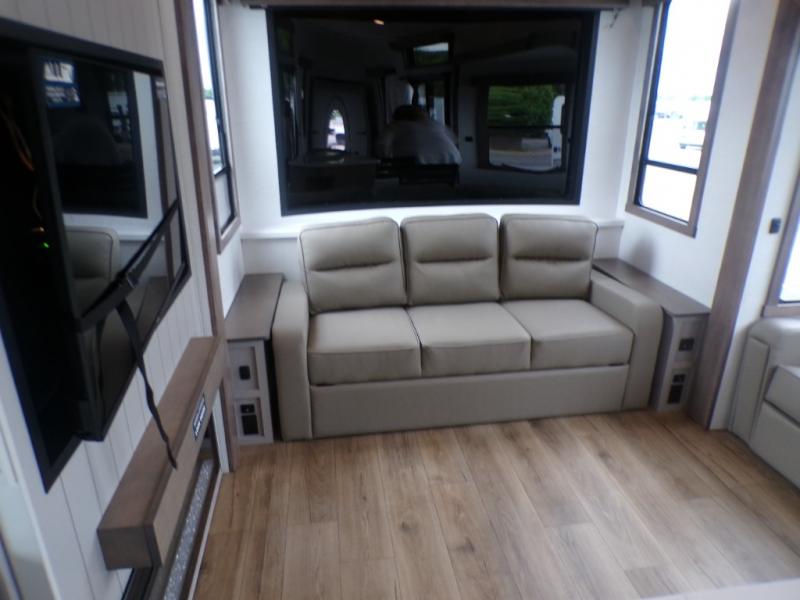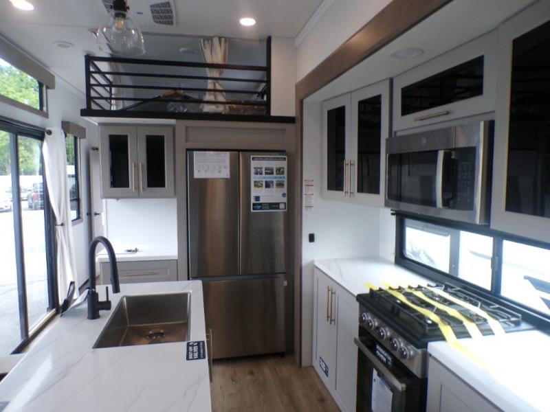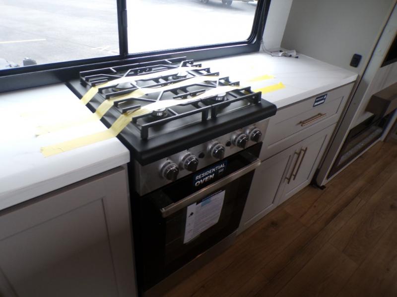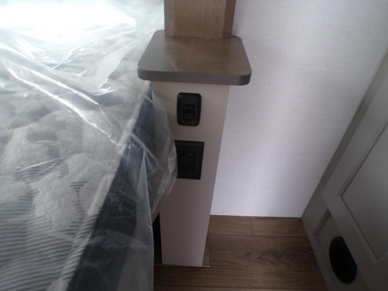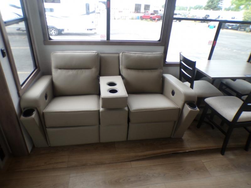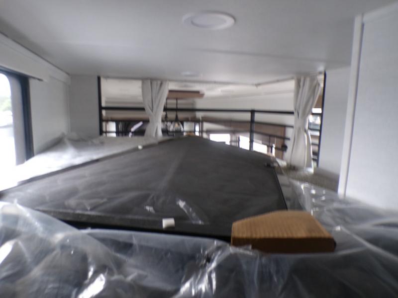 This destination trailer with a loft will be a favorite with the little ones! They will have three bunk mats to choose from plus wardrobes to keep their things picked up. You can take the rear private bedroom that includes a power tilting king bed that will allow you to sit up in bed at night to read. There is also a wardrobe, a dresser with a 32" TV, and a stackable washer and dryer to make laundry day easier than ever. A full bath with a 48" x 30" shower will let you freshen up each day, and there is a linen closet to keep clean towels close by. Everyone will enjoy spending time together in the front living area that includes a two dual recliner theater seats, a 50" TV and fireplace, and hidden storage for games or books. The chef of your group can make meals each day on the residential range and microwave, and there is a 110V Samsung refrigerator to keep your food fresh.