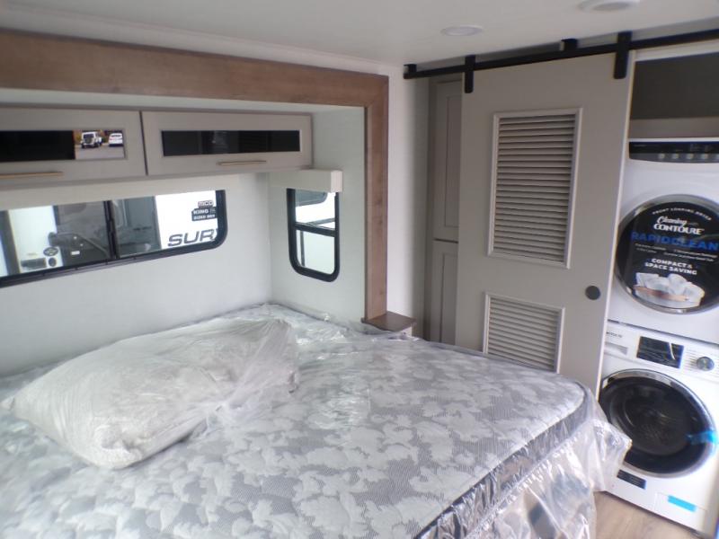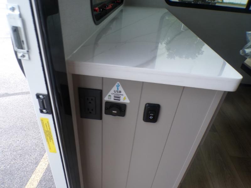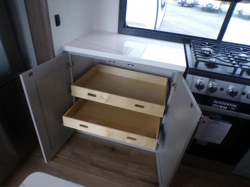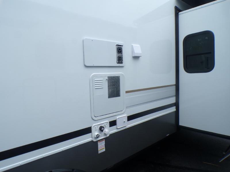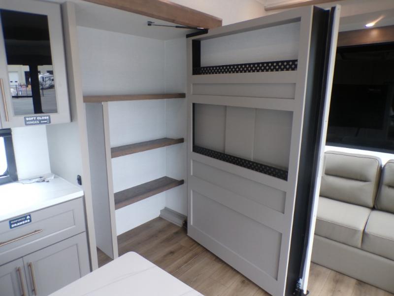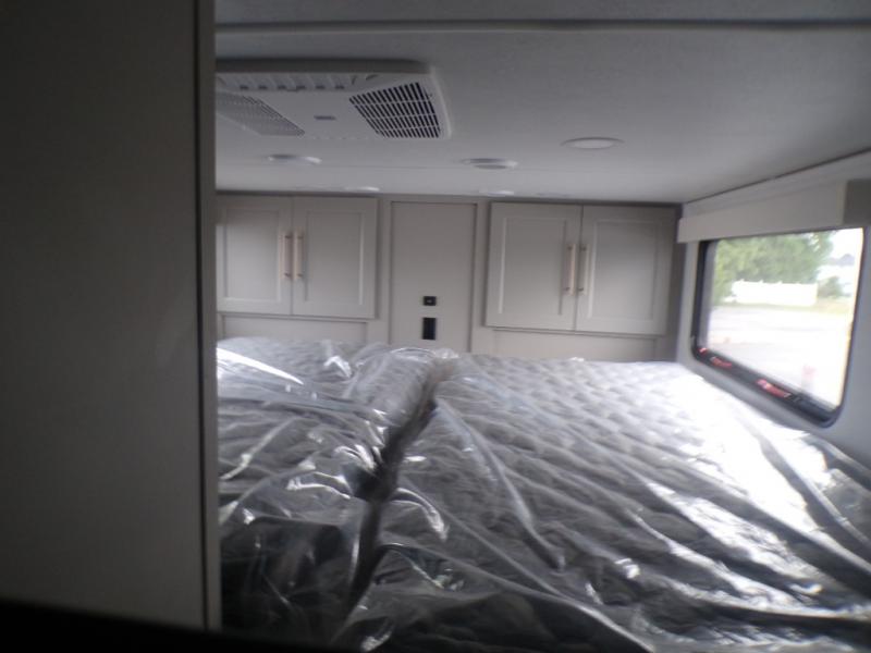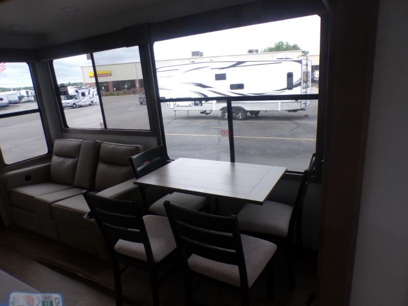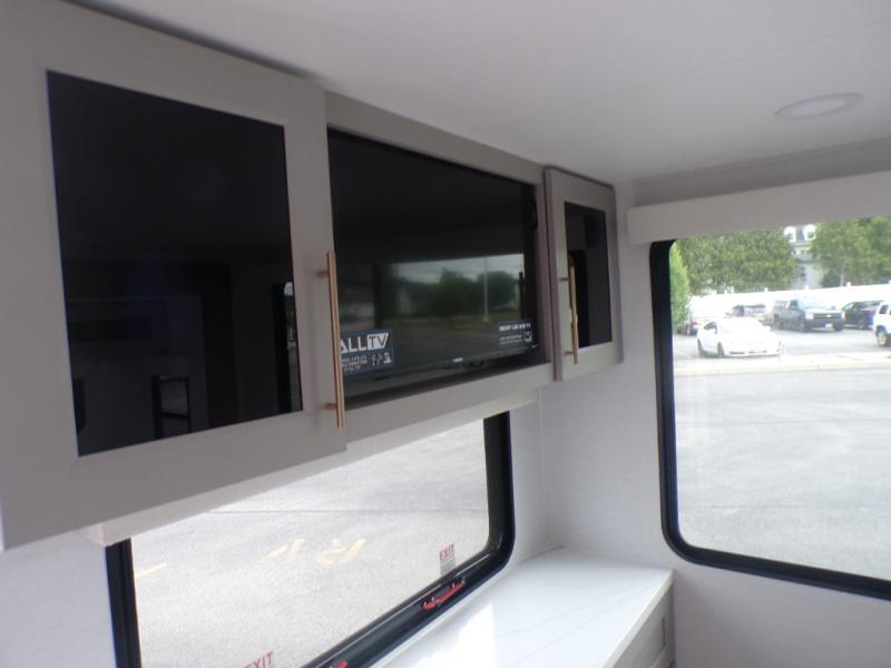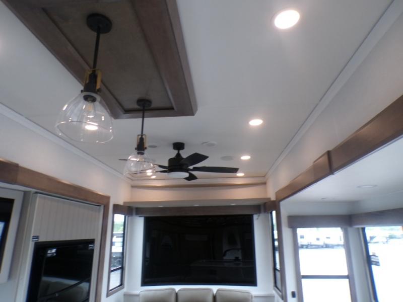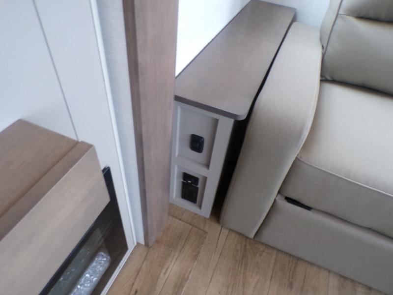 This destination trailer with a loft will be a favorite with the little ones! They will have three bunk mats to choose from plus wardrobes to keep their things picked up. You can take the rear private bedroom that includes a power tilting king bed that will allow you to sit up in bed at night to read. There is also a wardrobe, a dresser with a 32" TV, and a stackable washer and dryer to make laundry day easier than ever. A full bath with a 48" x 30" shower will let you freshen up each day, and there is a linen closet to keep clean towels close by. Everyone will enjoy spending time together in the front living area that includes a two dual recliner theater seats, a 50" TV and fireplace, and hidden storage for games or books. The chef of your group can make meals each day on the residential range and microwave, and there is a 110V Samsung refrigerator to keep your food fresh.