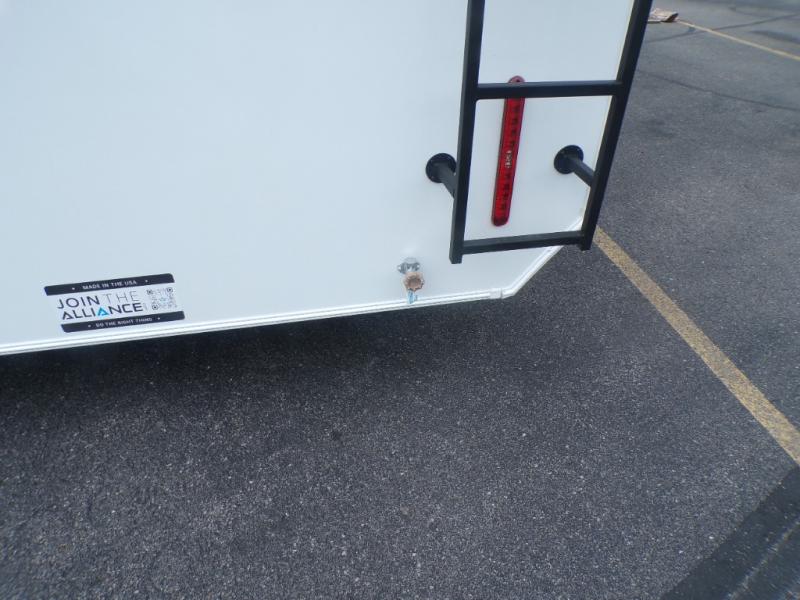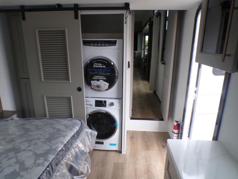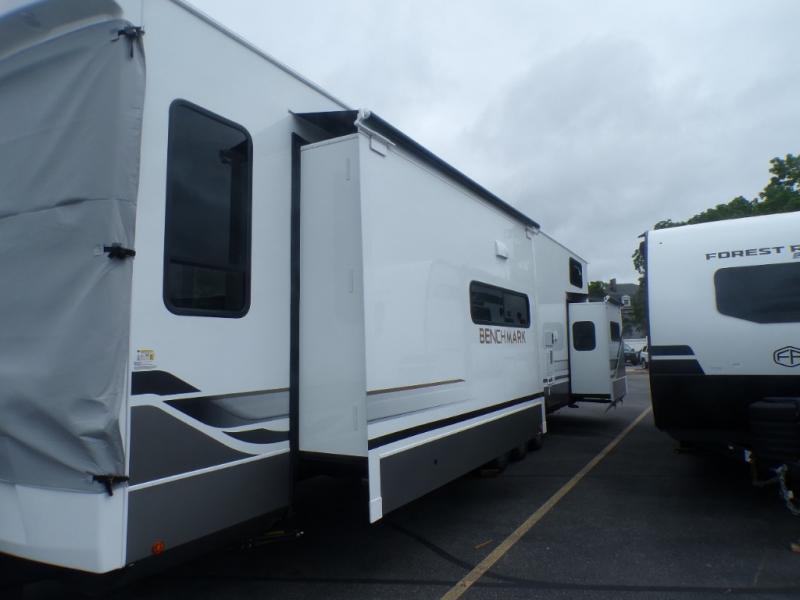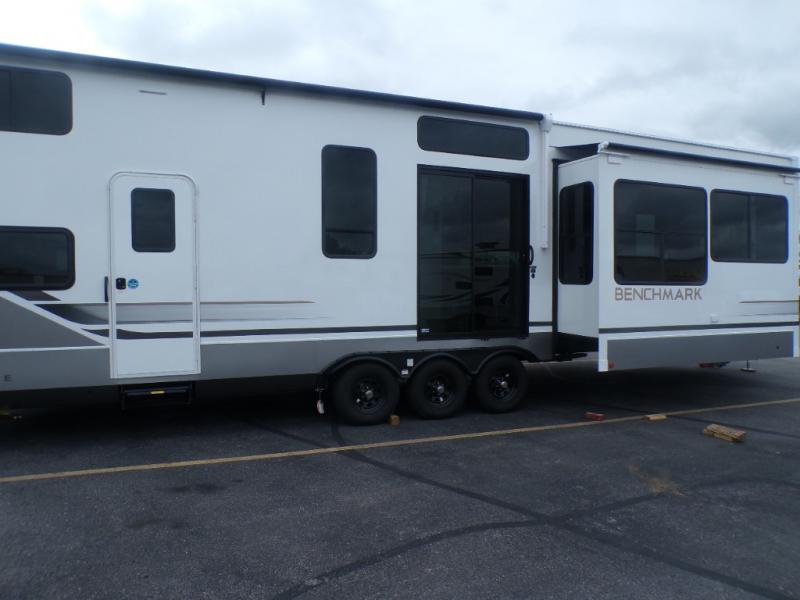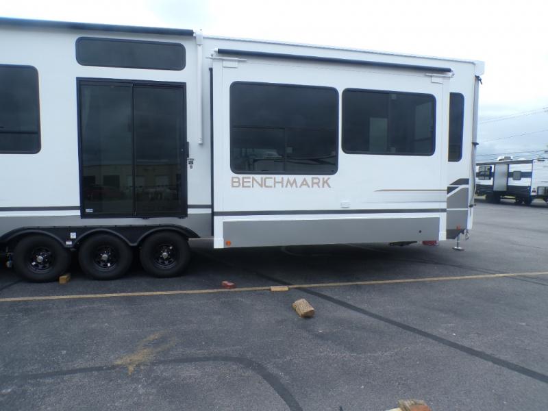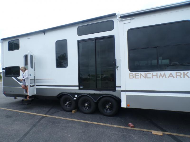 With any Benchmark destination trailer by Alliance RV, you will enjoy luxury features at every turn! The high gloss fiberglass exterior is ultra sleek, and the Azdel composite fiberglass sidewalls add durability so you can camp for years to come. You'll also find a residential exterior garden hose connection outside, along with a powder coated aluminum rear ladder, and an auxiliary LP tank hook up if you want to bring your grill along. Head inside to find hardwood cabinetry, solid surface countertops throughout, oversized windows in all rooms, and MCD roller shades throughout. The 45,000 BTU A/C and 60,000 BTU furnace will keep you comfortable year around, and there is a stackable washer and dryer to make full-time RV living easier than ever!