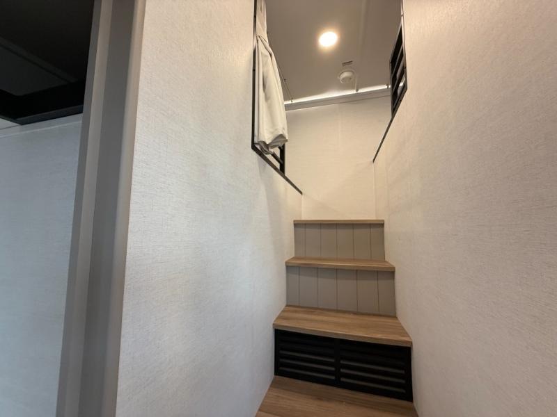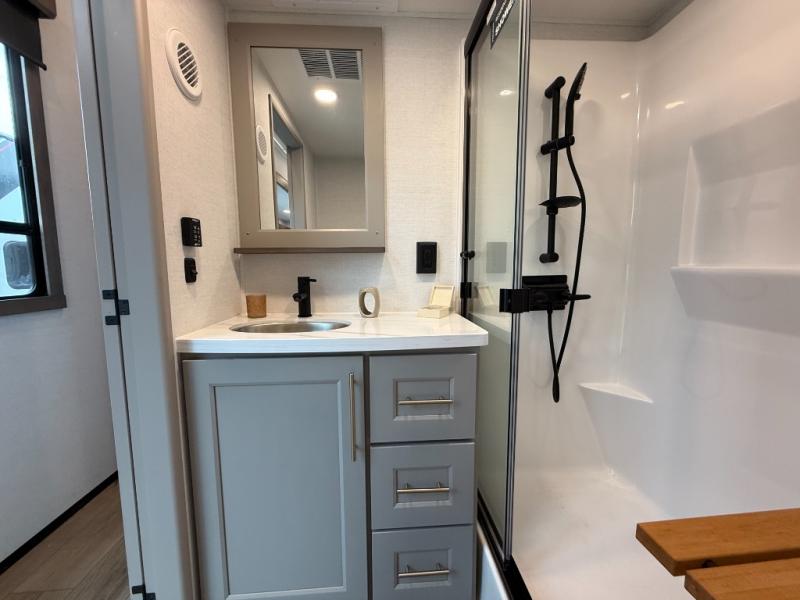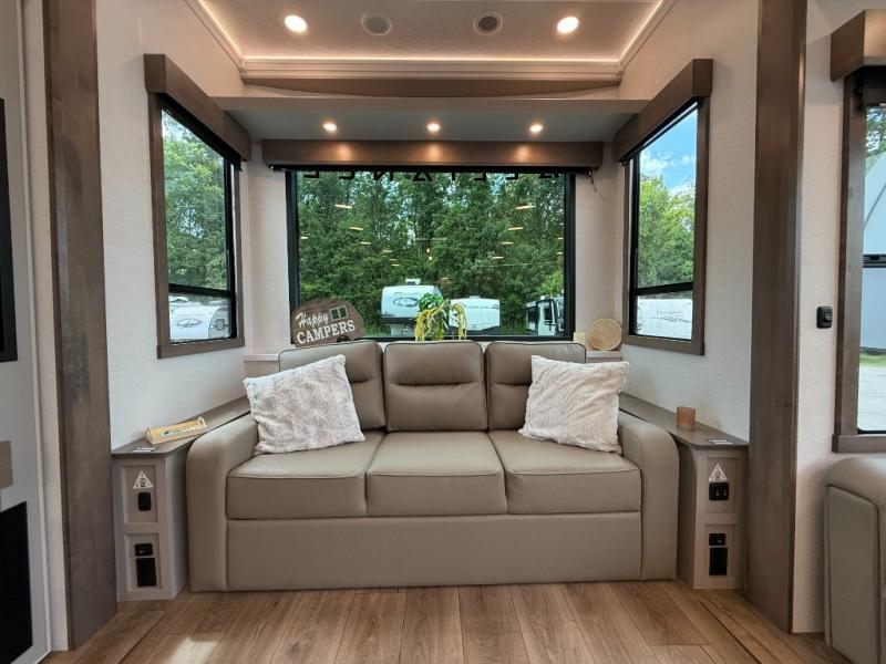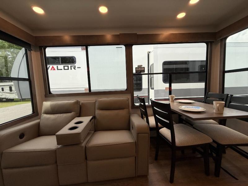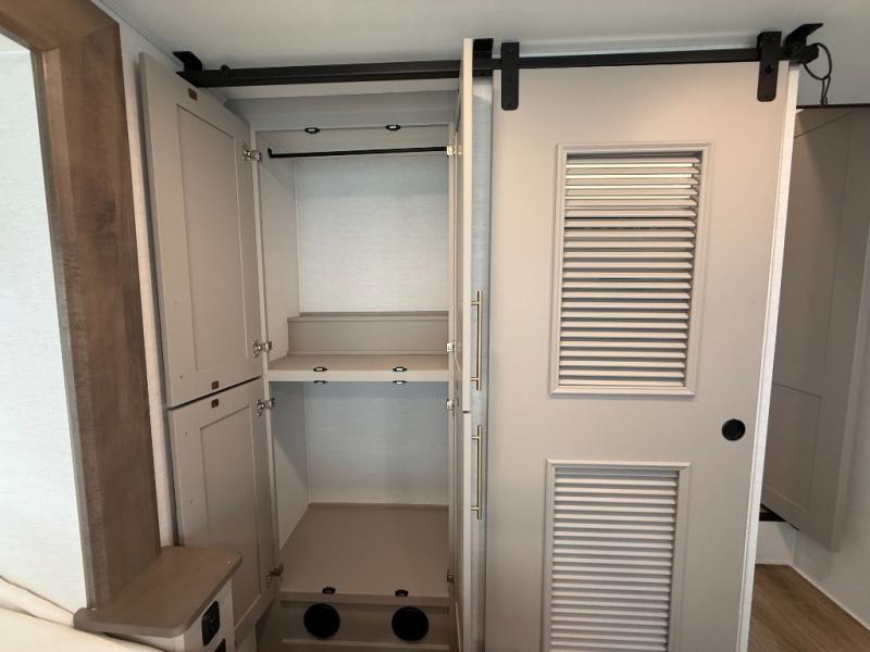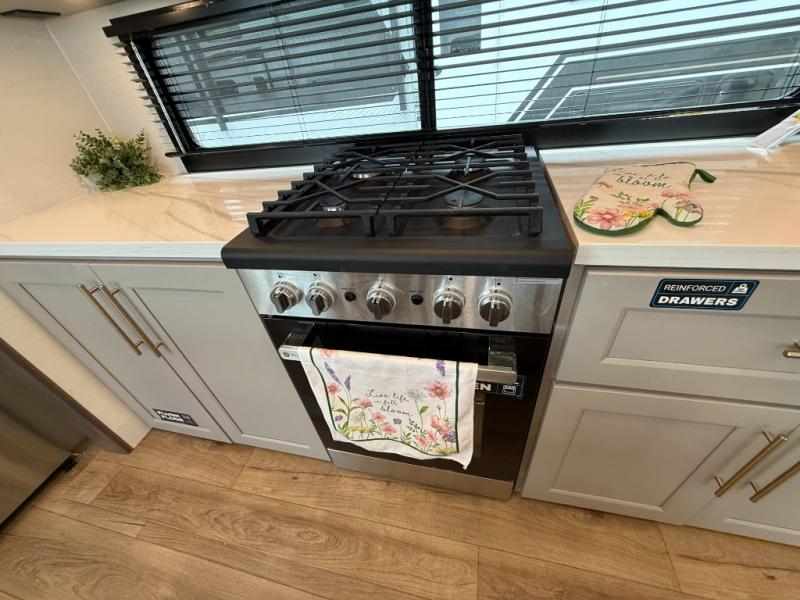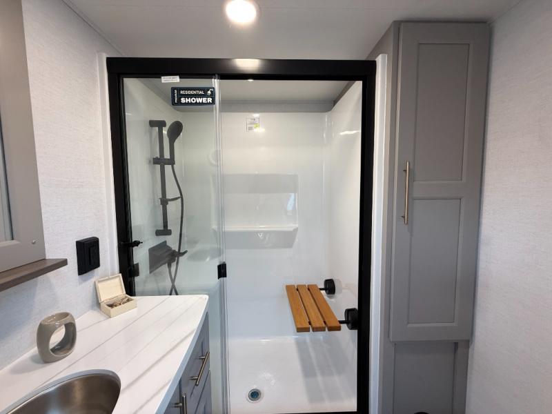 This destination trailer with a loft will be a favorite with the little ones! They will have three bunk mats to choose from plus wardrobes to keep their things picked up. You can take the rear private bedroom that includes a power tilting king bed that will allow you to sit up in bed at night to read. There is also a wardrobe, a dresser with a 32" TV, and a stackable washer and dryer to make laundry day easier than ever. A full bath with a 48" x 30" shower will let you freshen up each day, and there is a linen closet to keep clean towels close by. Everyone will enjoy spending time together in the front living area that includes a two dual recliner theater seats, a 50" TV and fireplace, and hidden storage for games or books. The chef of your group can make meals each day on the residential range and microwave, and there is a 110V Samsung refrigerator to keep your food fresh.
