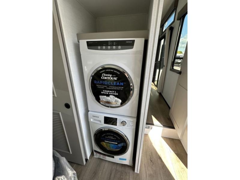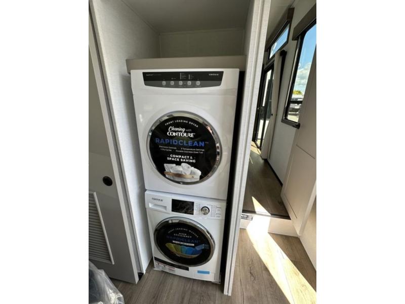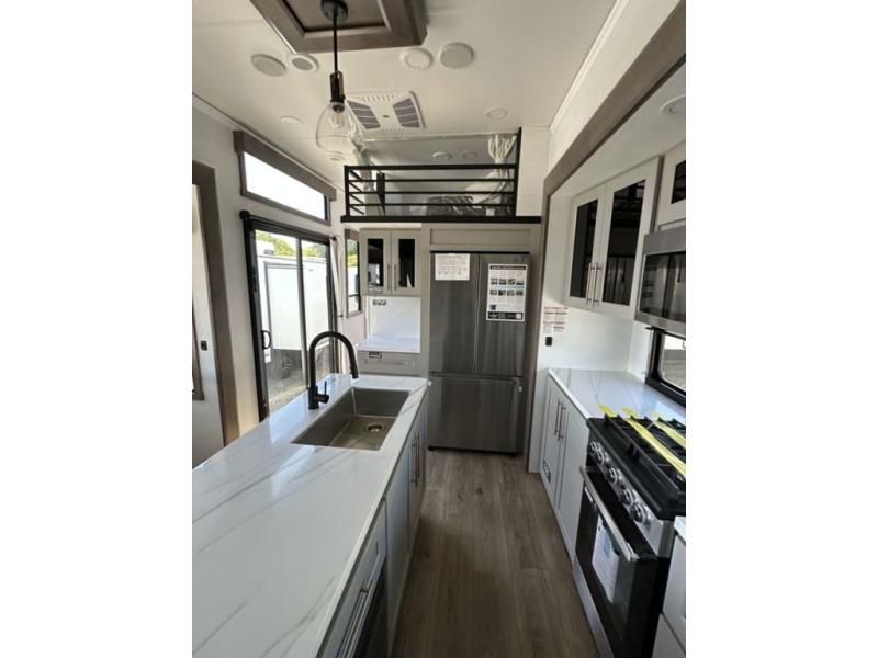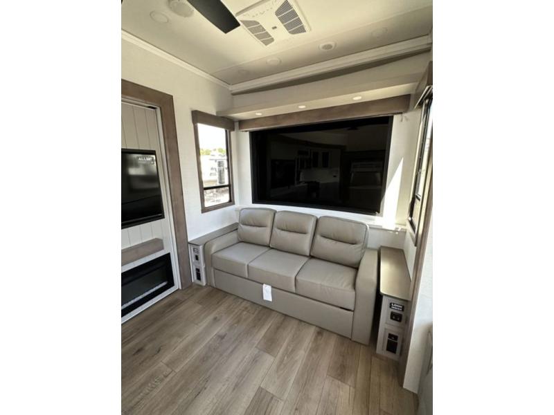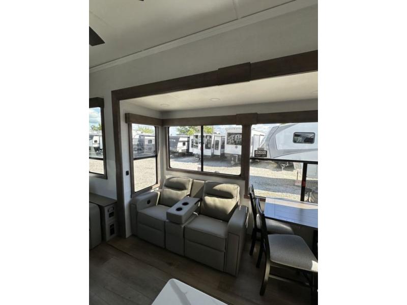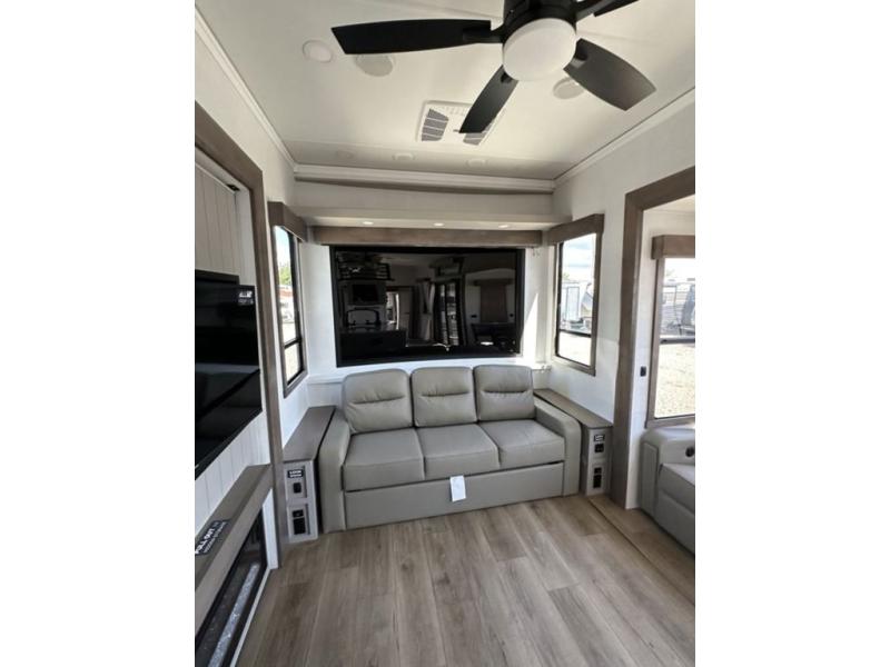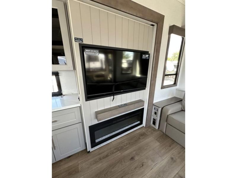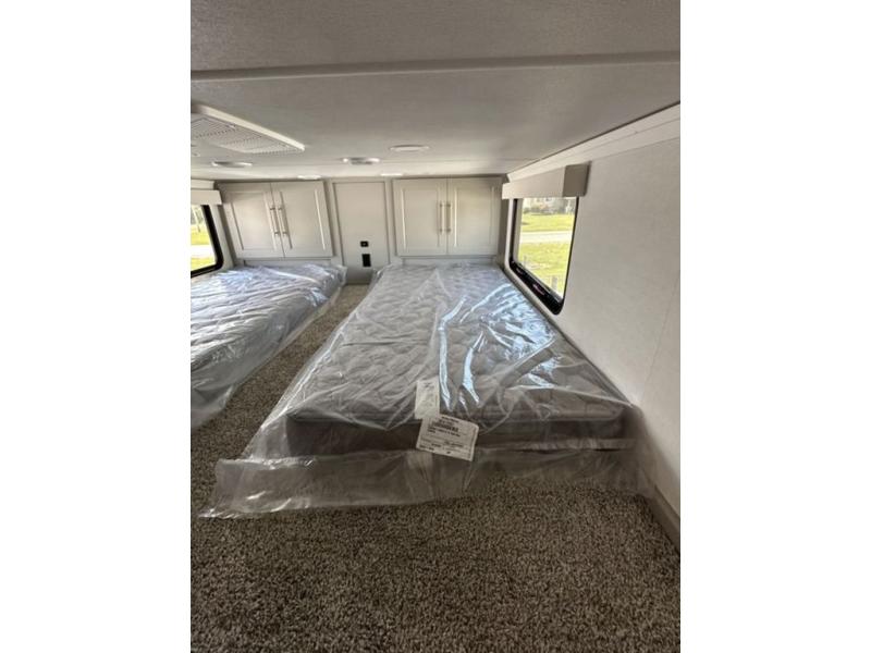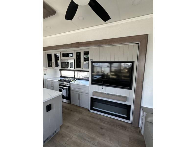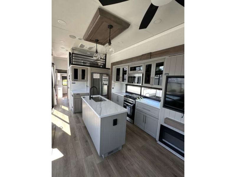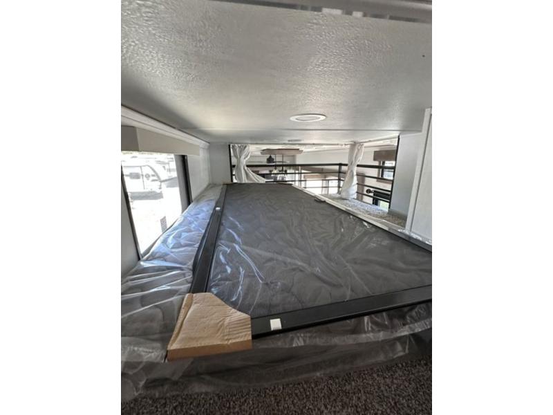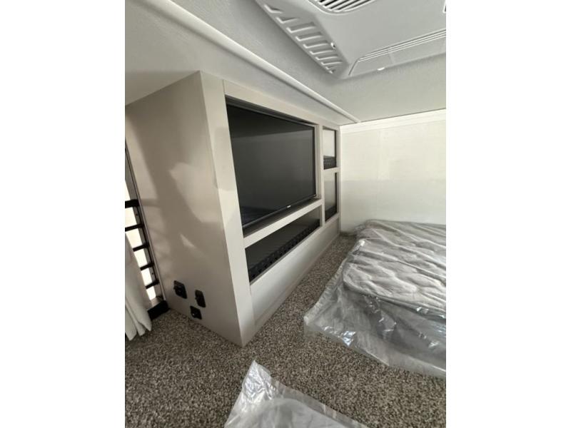This destination trailer with a loft will be a favorite with the little ones! They will have three bunk mats to choose from plus wardrobes to keep their things picked up. You can take the rear private bedroom that includes a power tilting king bed that will allow you to sit up in bed at night to read. There is also a wardrobe, a dresser with a 32" TV, and a stackable washer and dryer to make laundry day easier than ever. A full bath with a 48" x 30" shower will let you freshen up each day, and there is a linen closet to keep clean towels close by. Everyone will enjoy spending time together in the front living area that includes a two dual recliner theater seats, a 50" TV and fireplace, and hidden storage for games or books. The chef of your group can make meals each day on the residential range and microwave, and there is a 110V Samsung refrigerator to keep your food fresh.