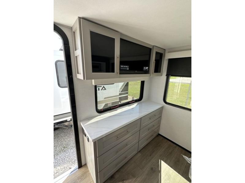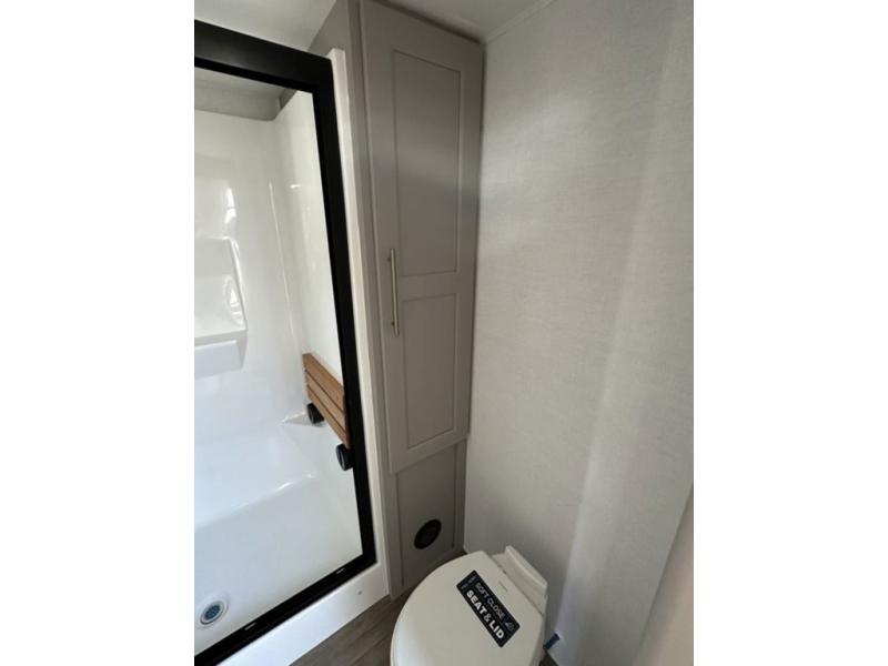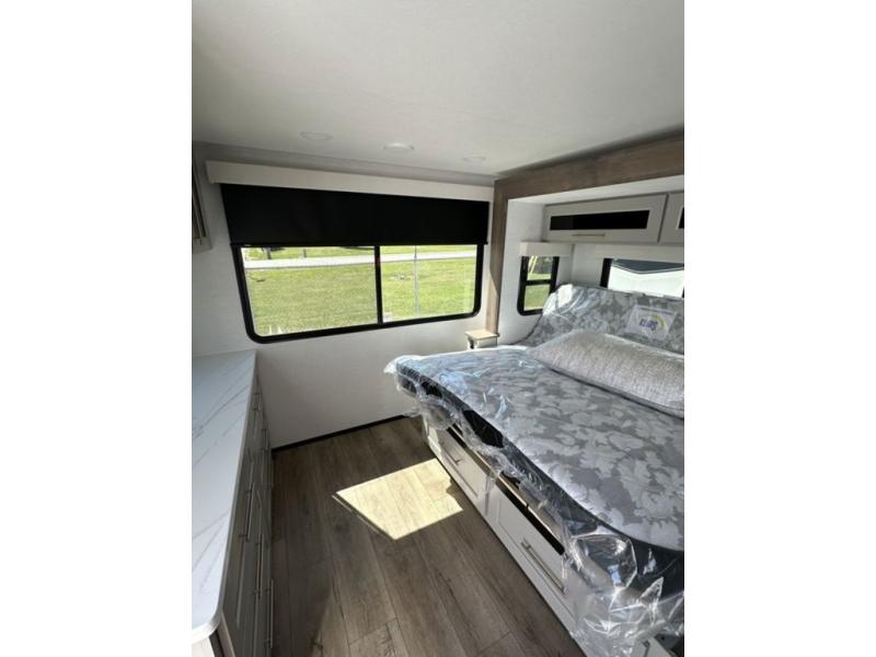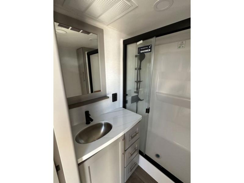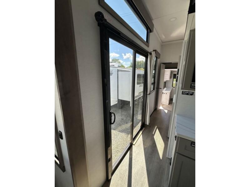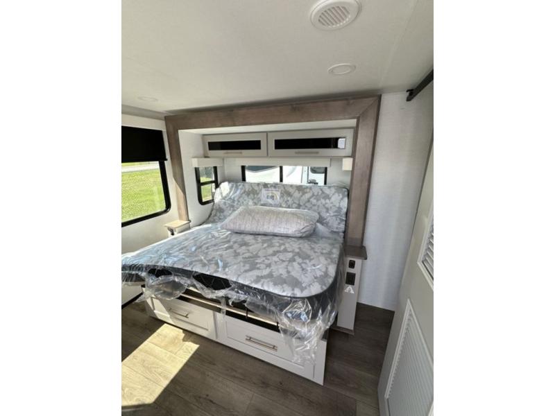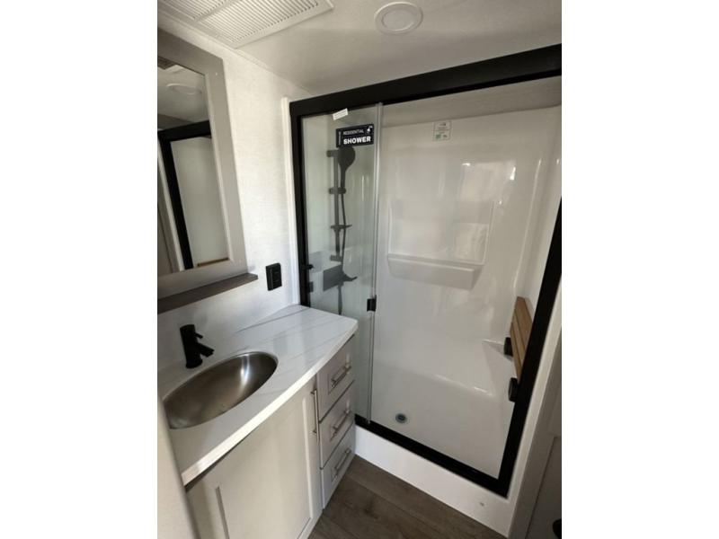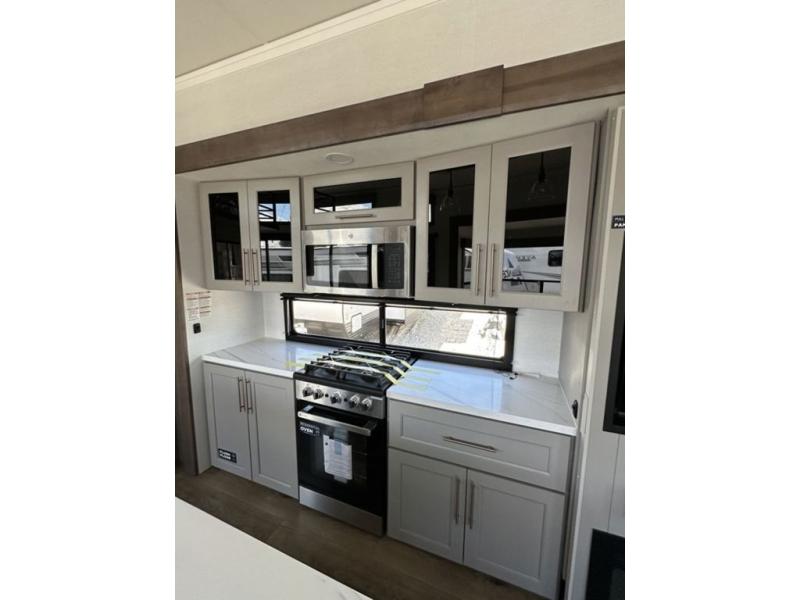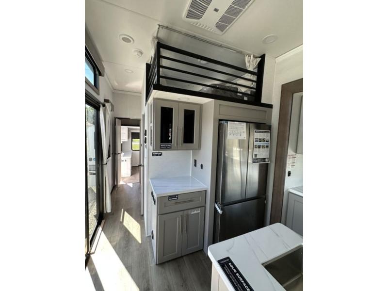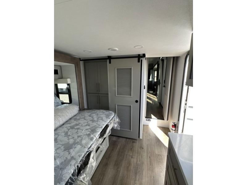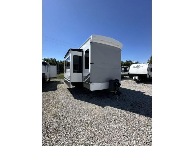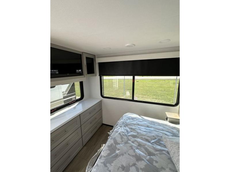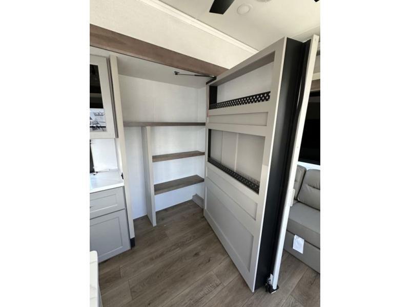 This destination trailer with a loft will be a favorite with the little ones! They will have three bunk mats to choose from plus wardrobes to keep their things picked up. You can take the rear private bedroom that includes a power tilting king bed that will allow you to sit up in bed at night to read. There is also a wardrobe, a dresser with a 32" TV, and a stackable washer and dryer to make laundry day easier than ever. A full bath with a 48" x 30" shower will let you freshen up each day, and there is a linen closet to keep clean towels close by. Everyone will enjoy spending time together in the front living area that includes a two dual recliner theater seats, a 50" TV and fireplace, and hidden storage for games or books. The chef of your group can make meals each day on the residential range and microwave, and there is a 110V Samsung refrigerator to keep your food fresh.