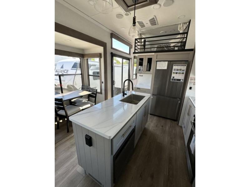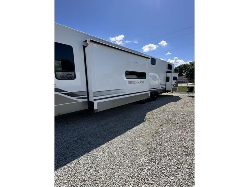 With any Benchmark destination trailer by Alliance RV, you will enjoy luxury features at every turn! The high gloss fiberglass exterior is ultra sleek, and the Azdel composite fiberglass sidewalls add durability so you can camp for years to come. You'll also find a residential exterior garden hose connection outside, along with a powder coated aluminum rear ladder, and an auxiliary LP tank hook up if you want to bring your grill along. Head inside to find hardwood cabinetry, solid surface countertops throughout, oversized windows in all rooms, and MCD roller shades throughout. The 45,000 BTU A/C and 60,000 BTU furnace will keep you comfortable year around, and there is a stackable washer and dryer to make full-time RV living easier than ever!
