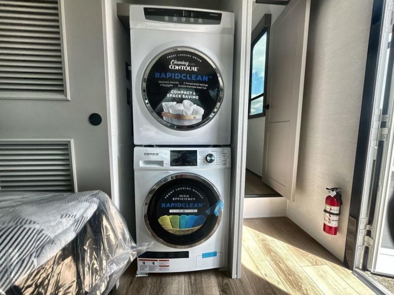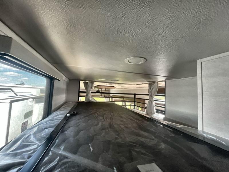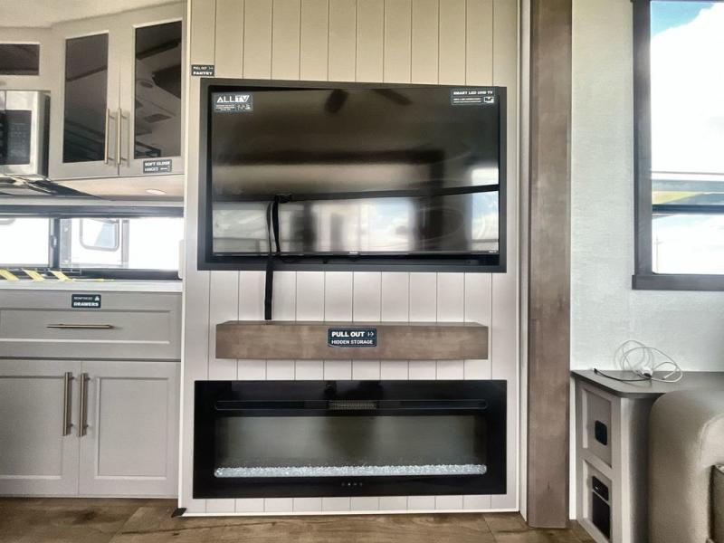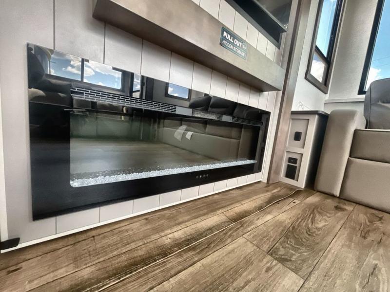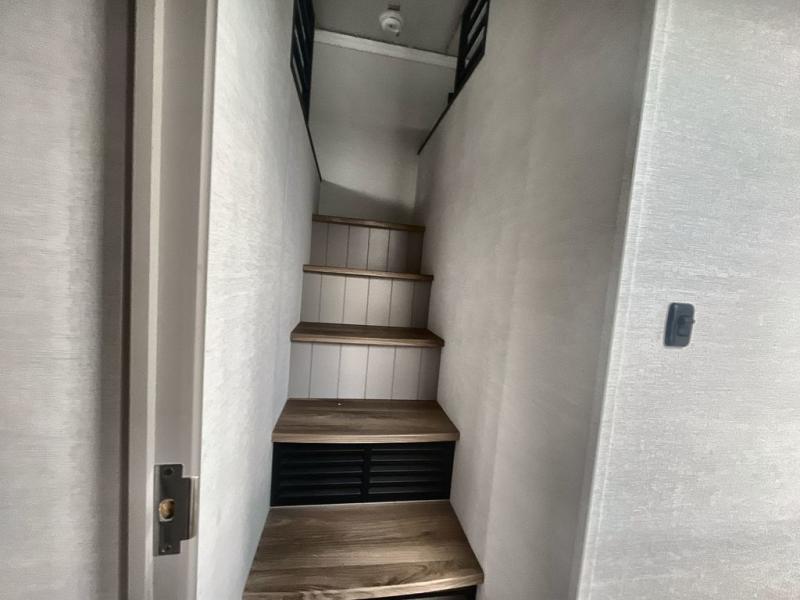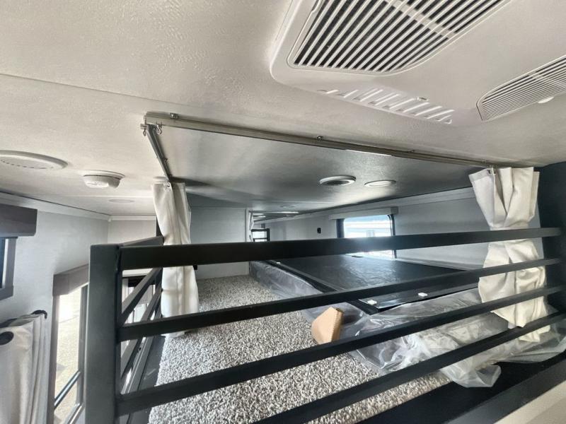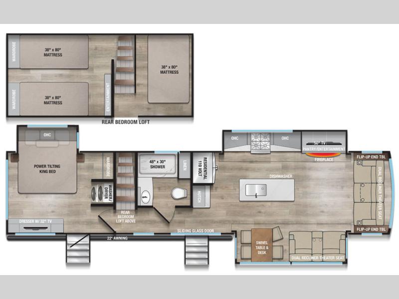 This destination trailer with a loft will be a favorite with the little ones! They will have three bunk mats to choose from plus wardrobes to keep their things picked up. You can take the rear private bedroom that includes a power tilting king bed that will allow you to sit up in bed at night to read. There is also a wardrobe, a dresser with a 32" TV, and a stackable washer and dryer to make laundry day easier than ever. A full bath with a 48" x 30" shower will let you freshen up each day, and there is a linen closet to keep clean towels close by. Everyone will enjoy spending time together in the front living area that includes a two dual recliner theater seats, a 50" TV and fireplace, and hidden storage for games or books. The chef of your group can make meals each day on the residential range and microwave, and there is a 110V Samsung refrigerator to keep your food fresh.