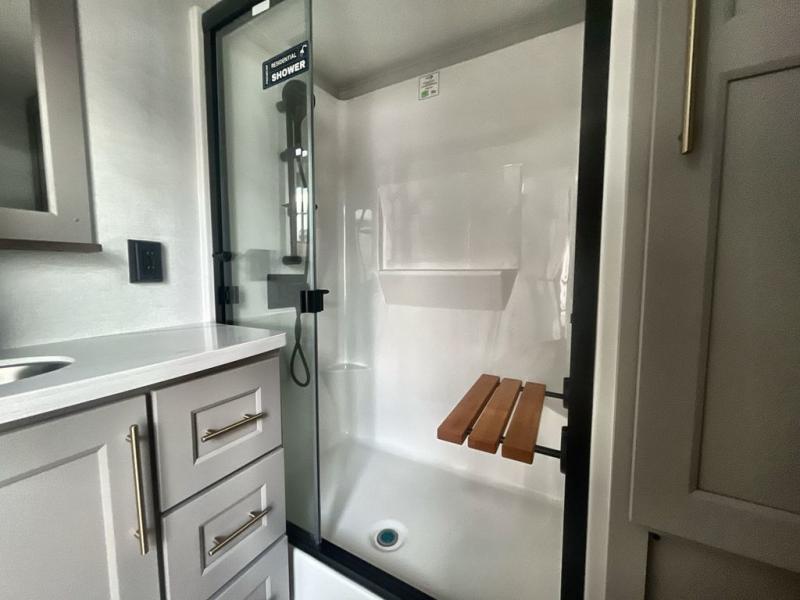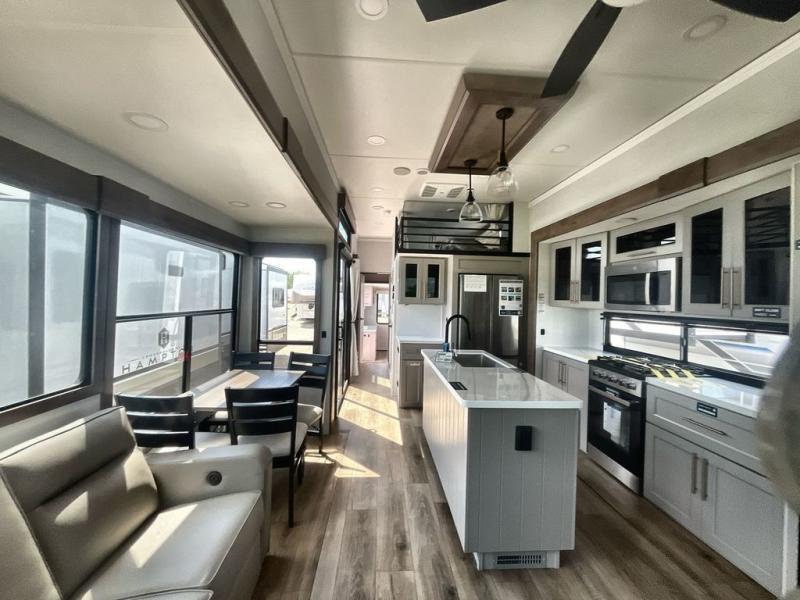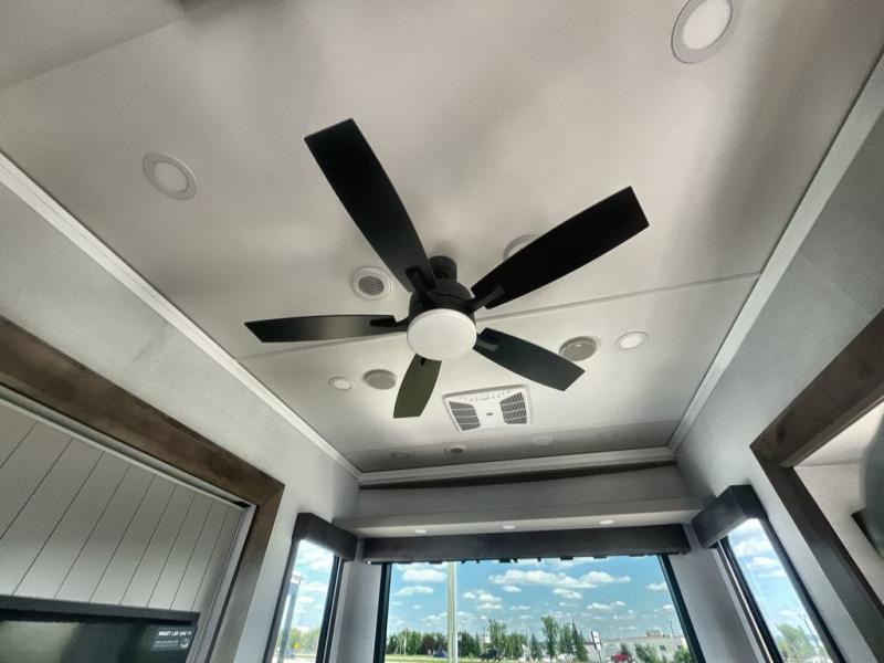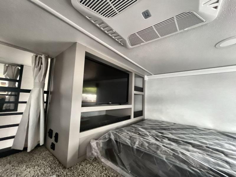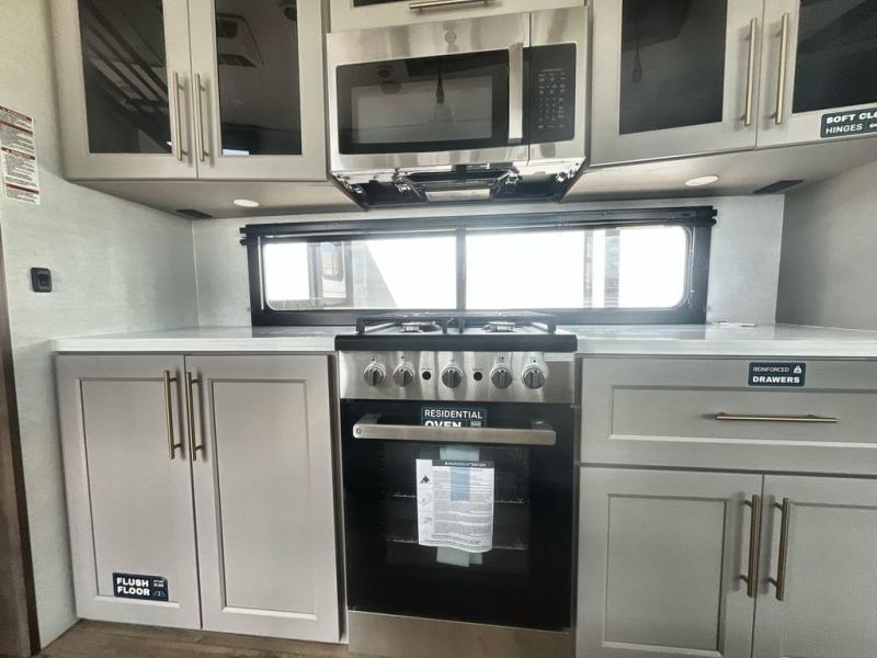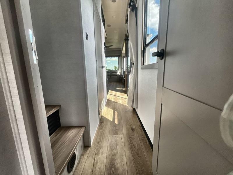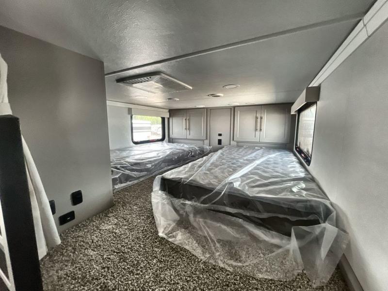 This destination trailer with a loft will be a favorite with the little ones! They will have three bunk mats to choose from plus wardrobes to keep their things picked up. You can take the rear private bedroom that includes a power tilting king bed that will allow you to sit up in bed at night to read. There is also a wardrobe, a dresser with a 32" TV, and a stackable washer and dryer to make laundry day easier than ever. A full bath with a 48" x 30" shower will let you freshen up each day, and there is a linen closet to keep clean towels close by. Everyone will enjoy spending time together in the front living area that includes a two dual recliner theater seats, a 50" TV and fireplace, and hidden storage for games or books. The chef of your group can make meals each day on the residential range and microwave, and there is a 110V Samsung refrigerator to keep your food fresh.