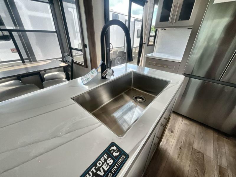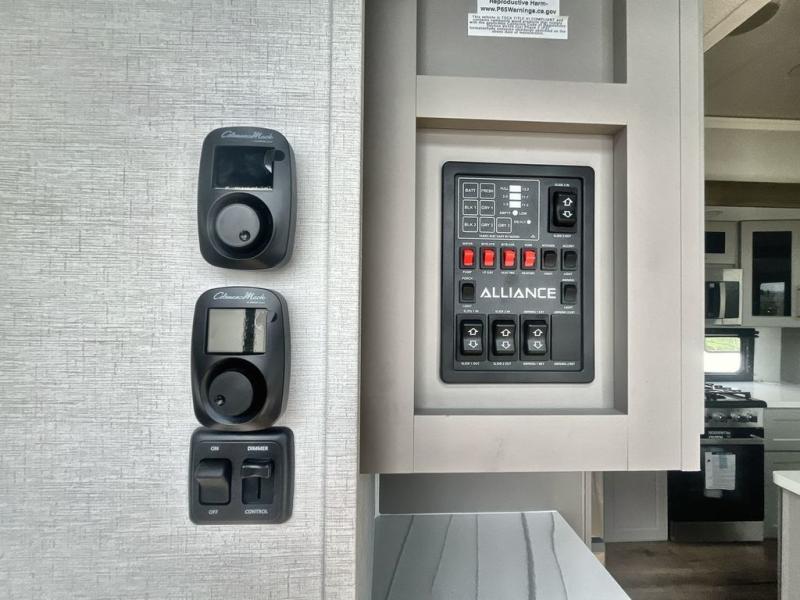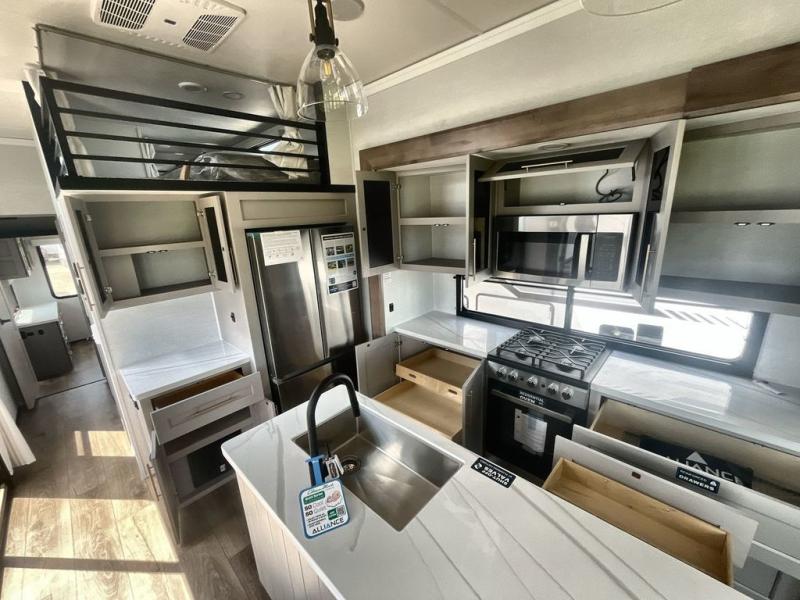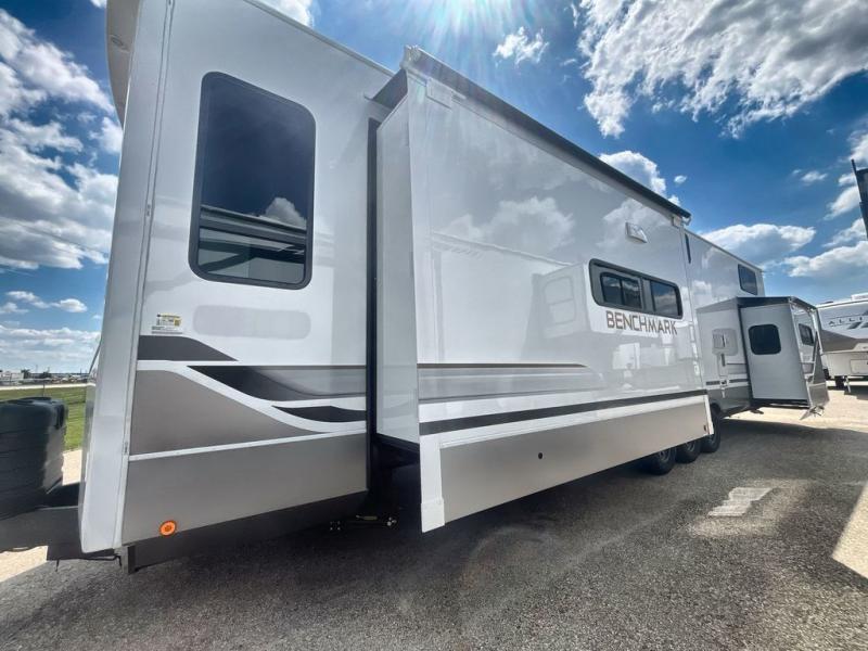With any Benchmark destination trailer by Alliance RV, you will enjoy luxury features at every turn! The high gloss fiberglass exterior is ultra sleek, and the Azdel composite fiberglass sidewalls add durability so you can camp for years to come. You'll also find a residential exterior garden hose connection outside, along with a powder coated aluminum rear ladder, and an auxiliary LP tank hook up if you want to bring your grill along. Head inside to find hardwood cabinetry, solid surface countertops throughout, oversized windows in all rooms, and MCD roller shades throughout. The 45,000 BTU A/C and 60,000 BTU furnace will keep you comfortable year around, and there is a stackable washer and dryer to make full-time RV living easier than ever!