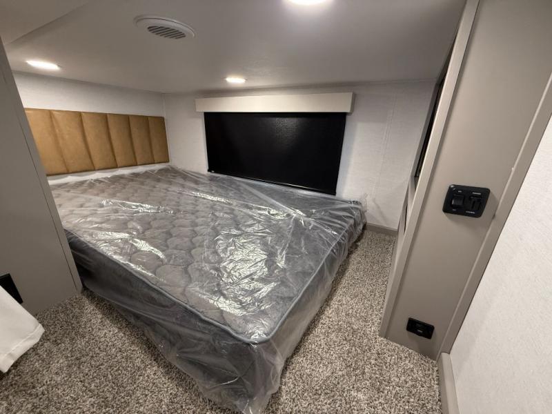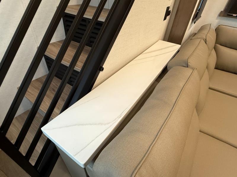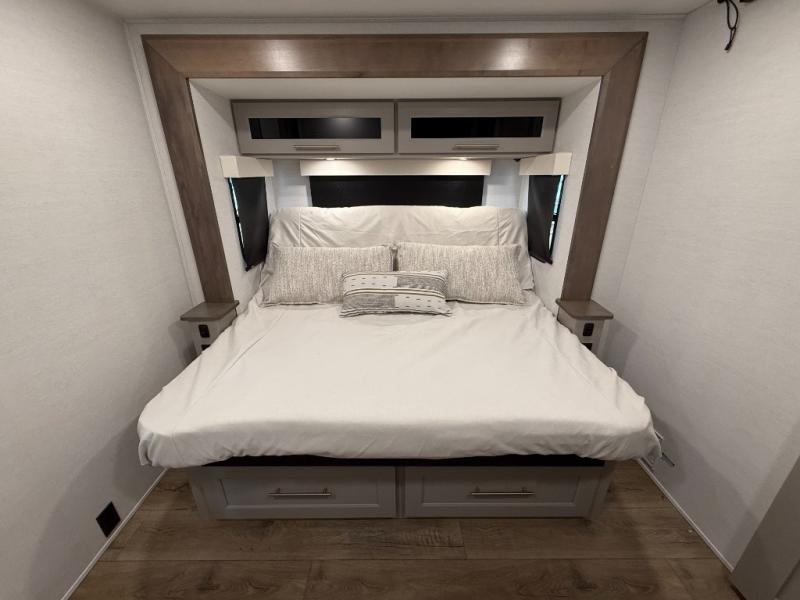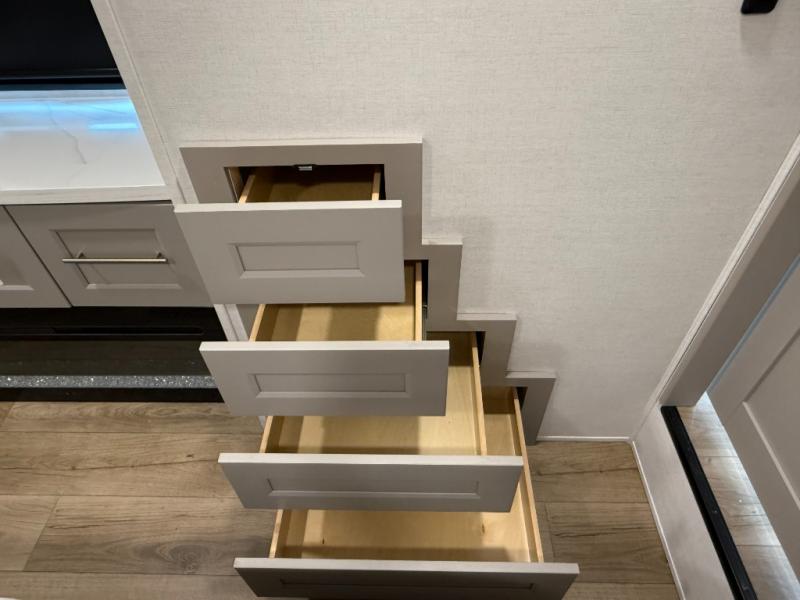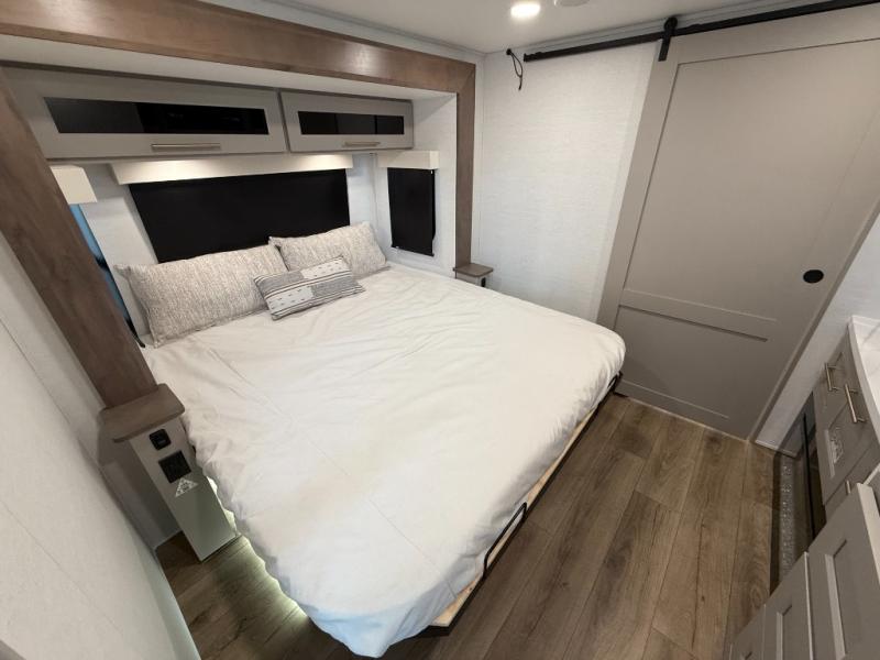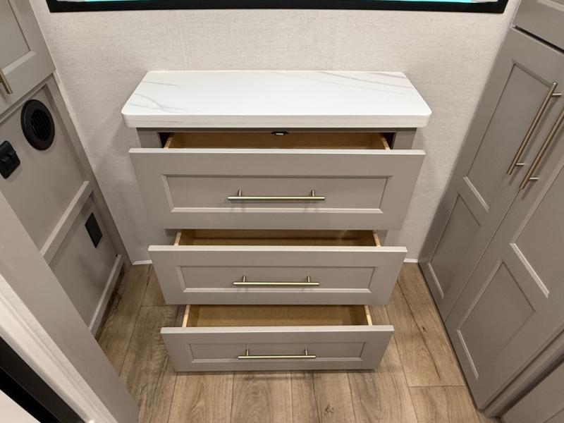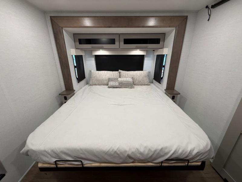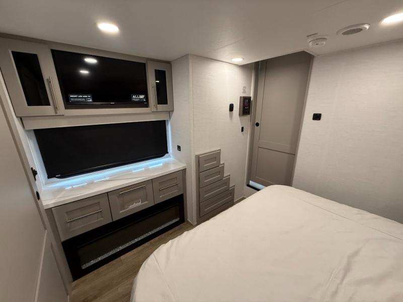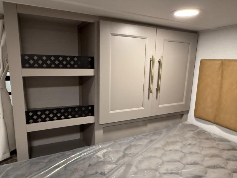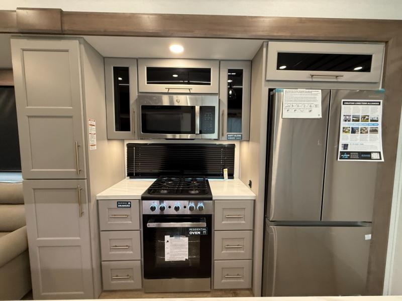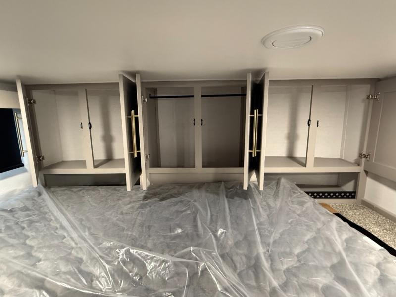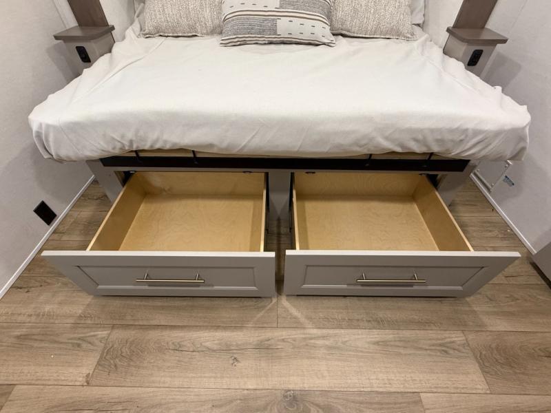High build quality touches: Azdel composite fiberglass sidewalls, full fiberglass front cap, large windshield, soft-close doors/drawers, slide topper awnings, quality cabinetry.