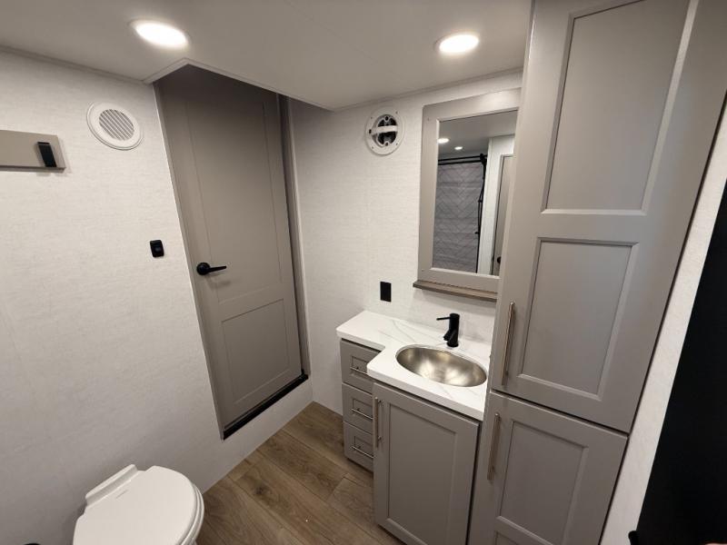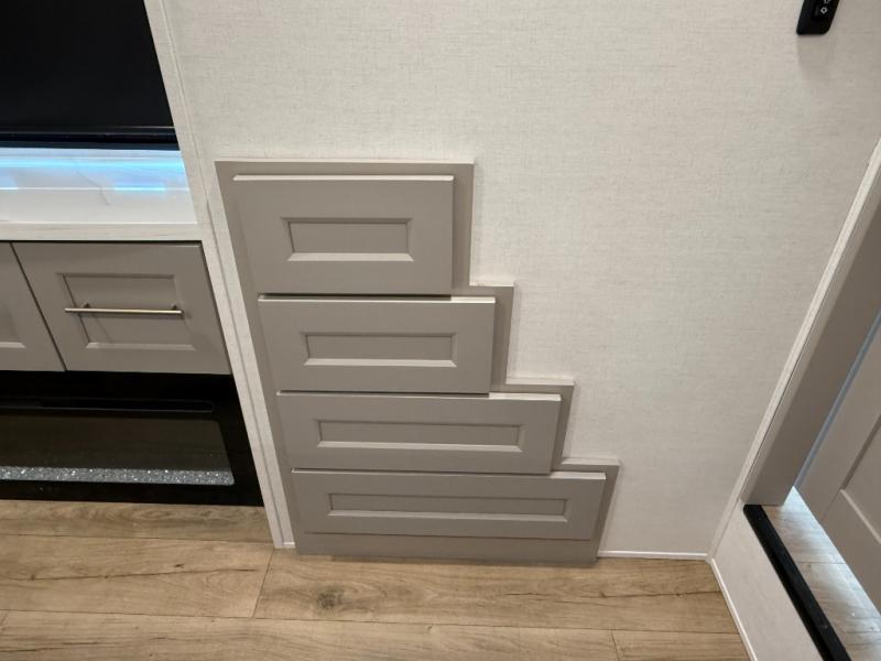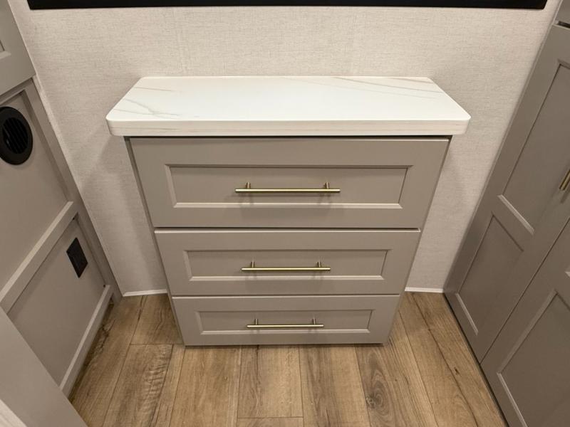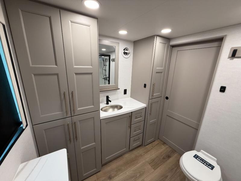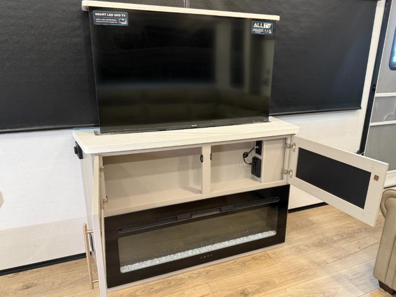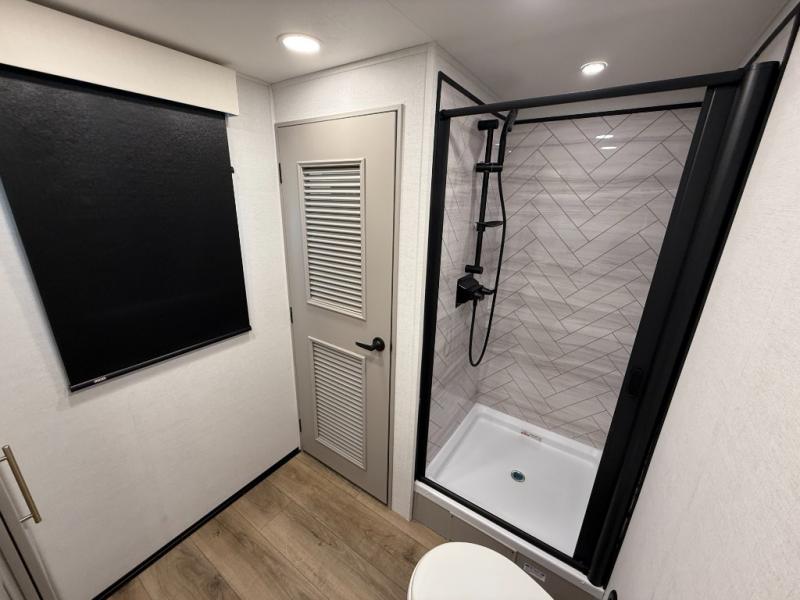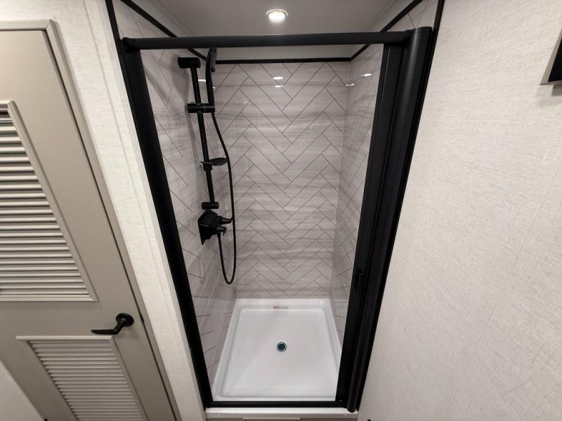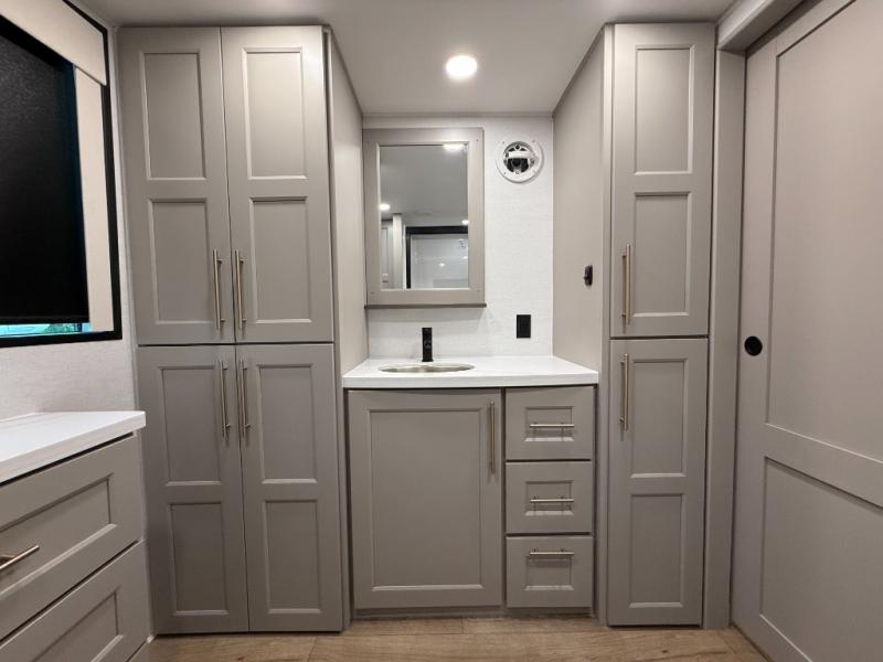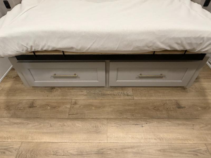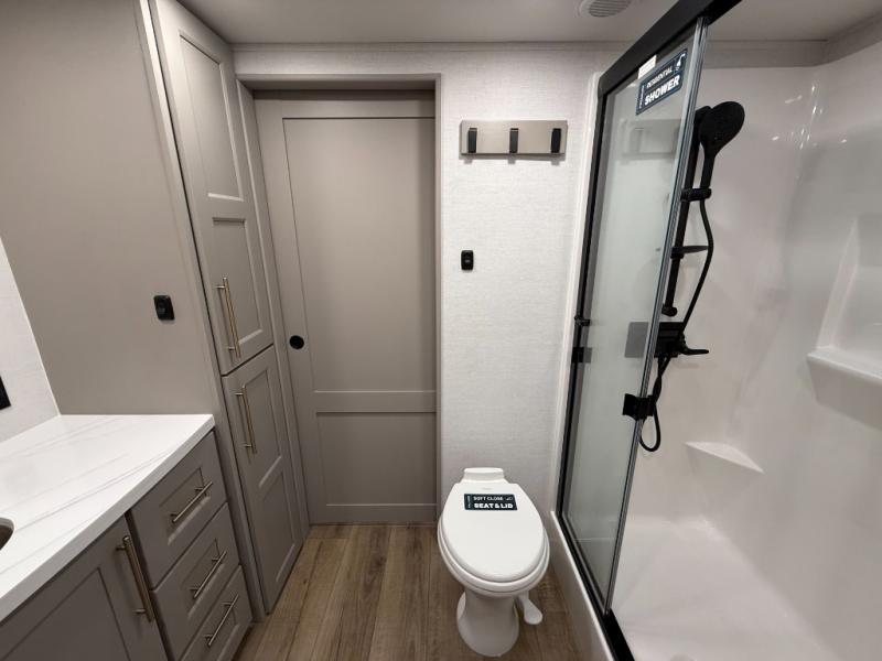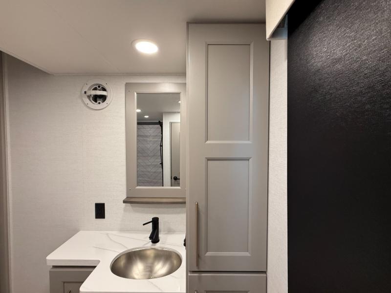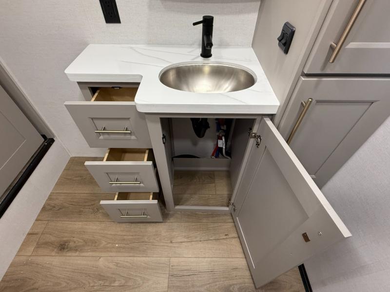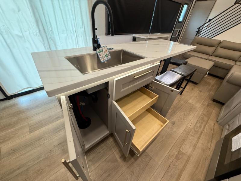 High build quality touches: Azdel composite fiberglass sidewalls, full fiberglass front cap, large windshield, soft-close doors/drawers, slide topper awnings, quality cabinetry.