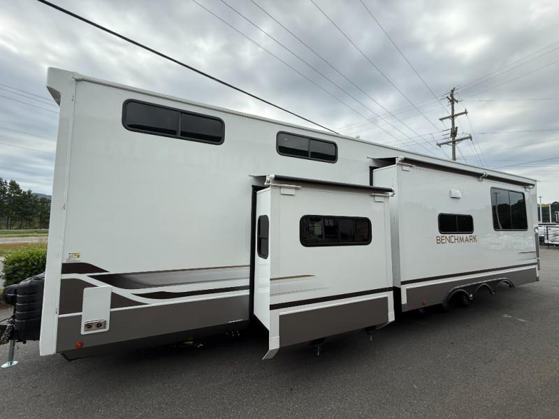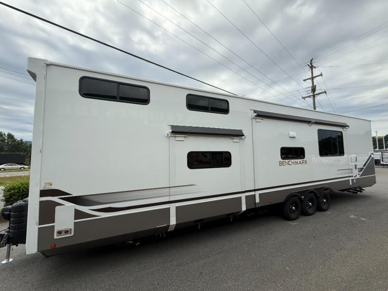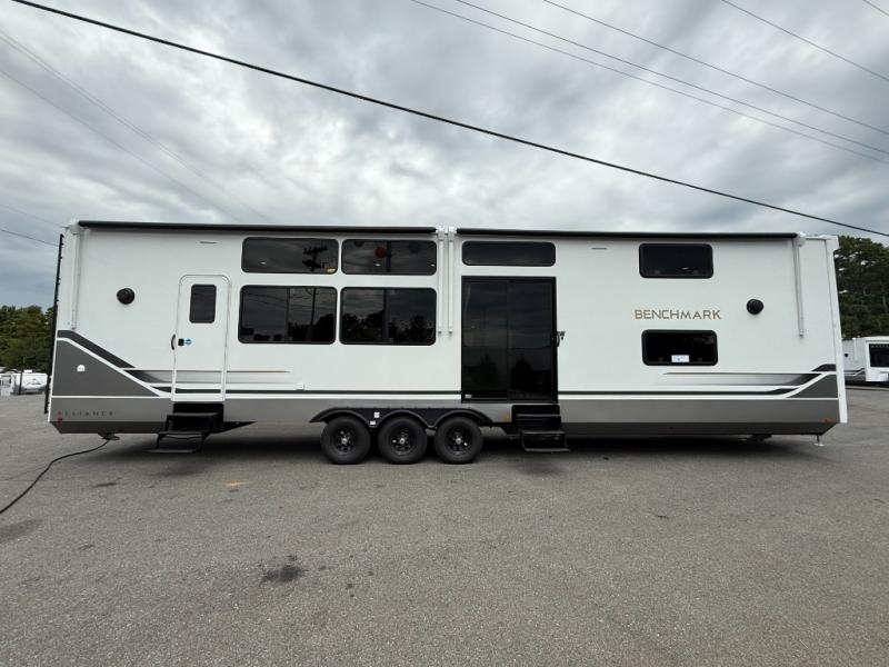 The 2026 Alliance RV Benchmark 44LFT is a luxury destination trailer designed for extended stays and full-time living, offering a blend of residential comfort and innovative design.