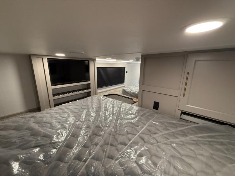 Dual lofts — front and rear loft sleeping / storage areas, with wardrobe & TV in each.