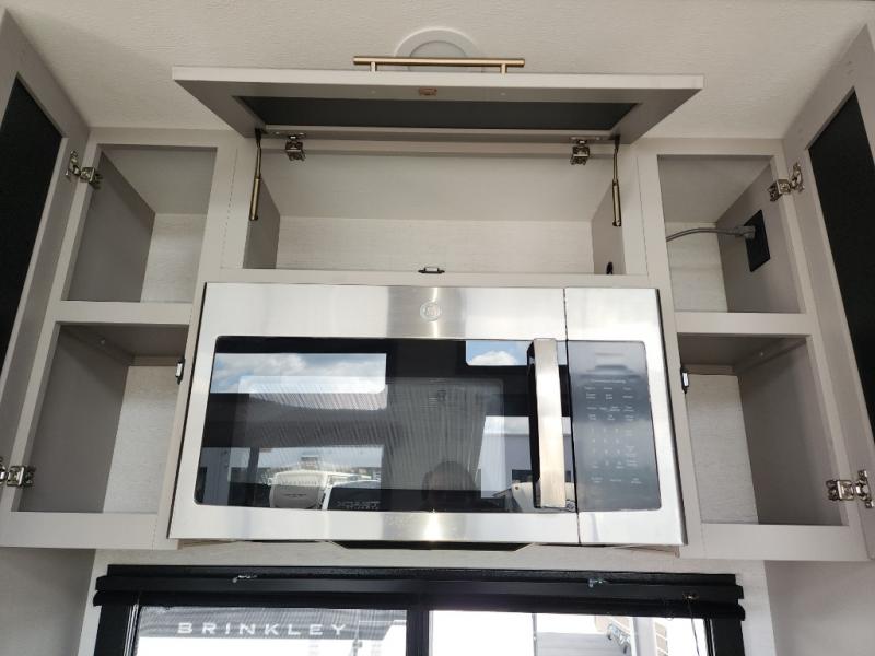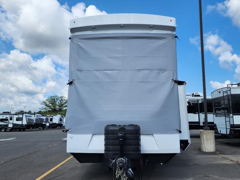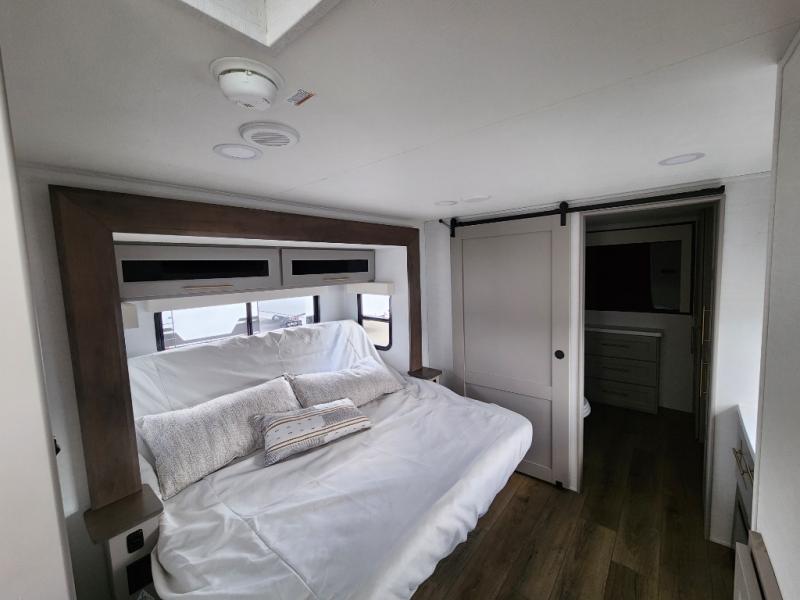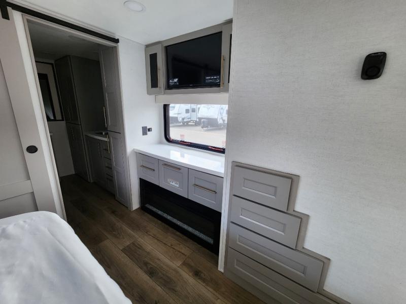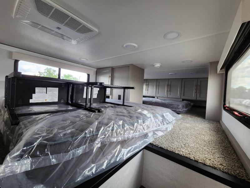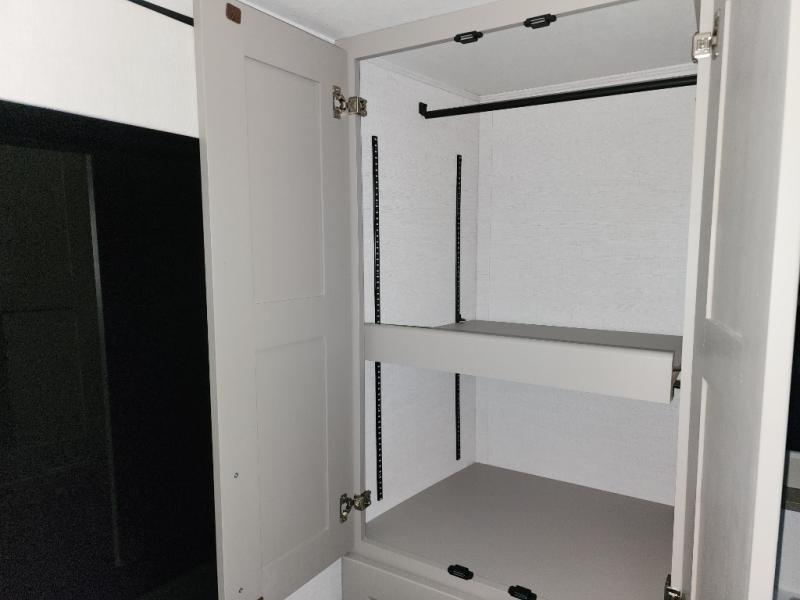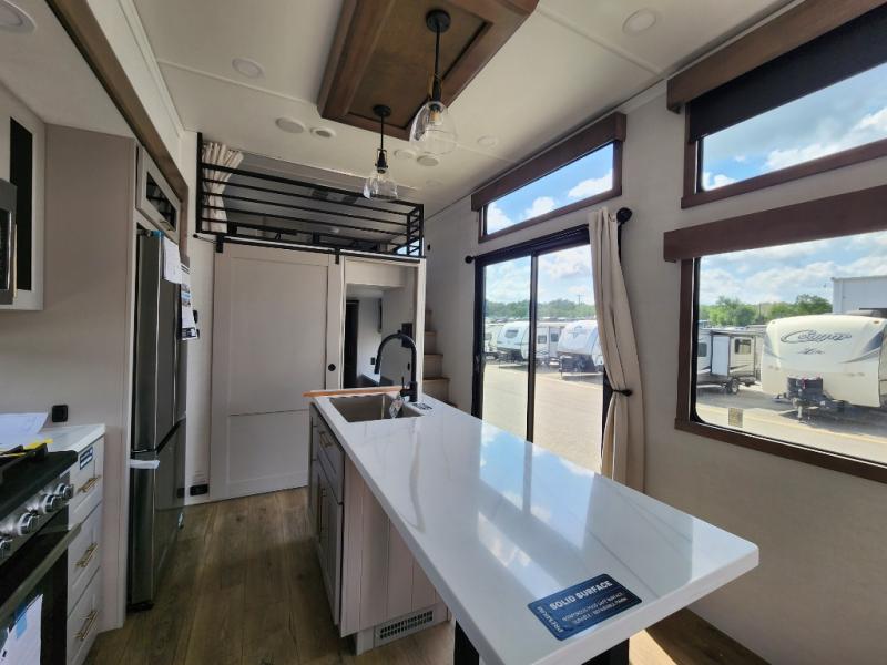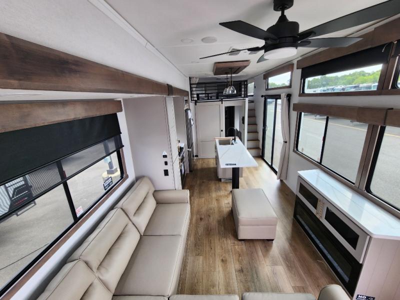 This destination trailer is perfect for a big crowd since it has one Power Tilting king bed, three mattress and an L- shape sofa. Experience the in-home feeling with the amazing kitchen and living room, furnished with a Kitchen island, L- shape sofa and a residential 110 V fridge. Also, you can sense the extreme coziness thanks to the dual fire places and get 24/7 entertainment due to the four TVs along the trailer. Plenty of place can be found in the front and rear loft bedrooms with three wardrobes in total. Lastly the two full bathrooms will allow you to comfortably take a shower after a long day.