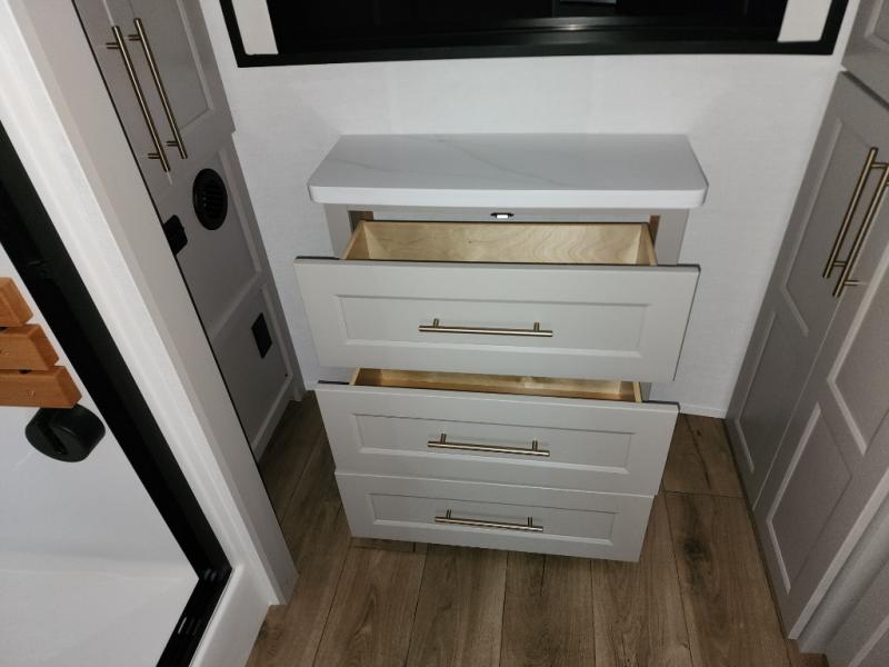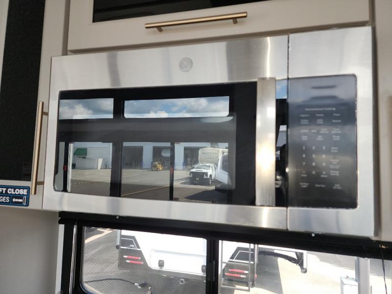 With any Benchmark destination trailer by Alliance RV, you will enjoy luxury features at every turn! The high gloss fiberglass exterior is ultra sleek, and the Azdel composite fiberglass sidewalls add durability so you can camp for years to come. You'll also find a residential exterior garden hose connection outside, along with a powder coated aluminum rear ladder, and an auxiliary LP tank hook up if you want to bring your grill along. Head inside to find hardwood cabinetry, solid surface countertops throughout, oversized windows in all rooms, and MCD roller shades throughout. The 45,000 BTU A/C and 60,000 BTU furnace will keep you comfortable year around, and there is a stackable washer and dryer to make full-time RV living easier than ever!
