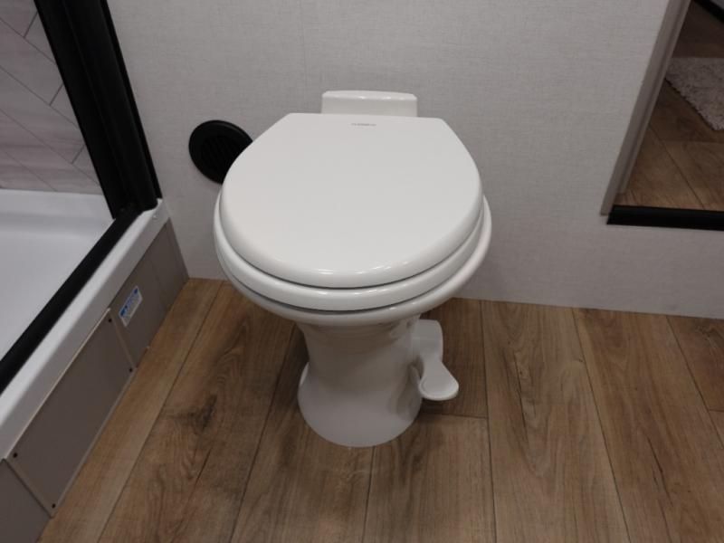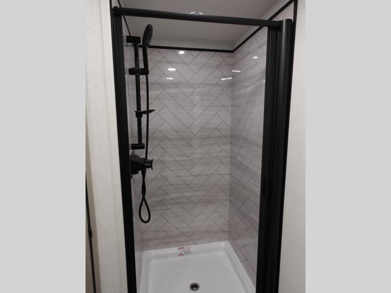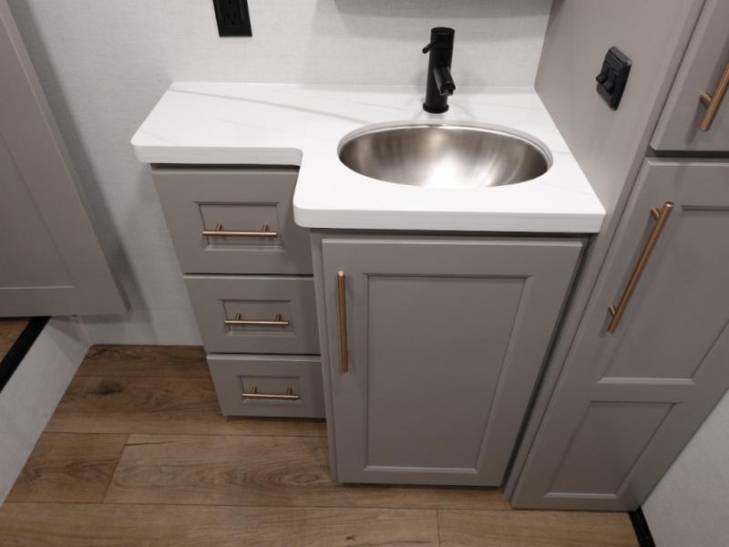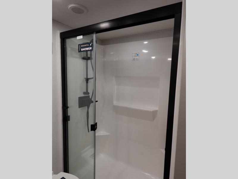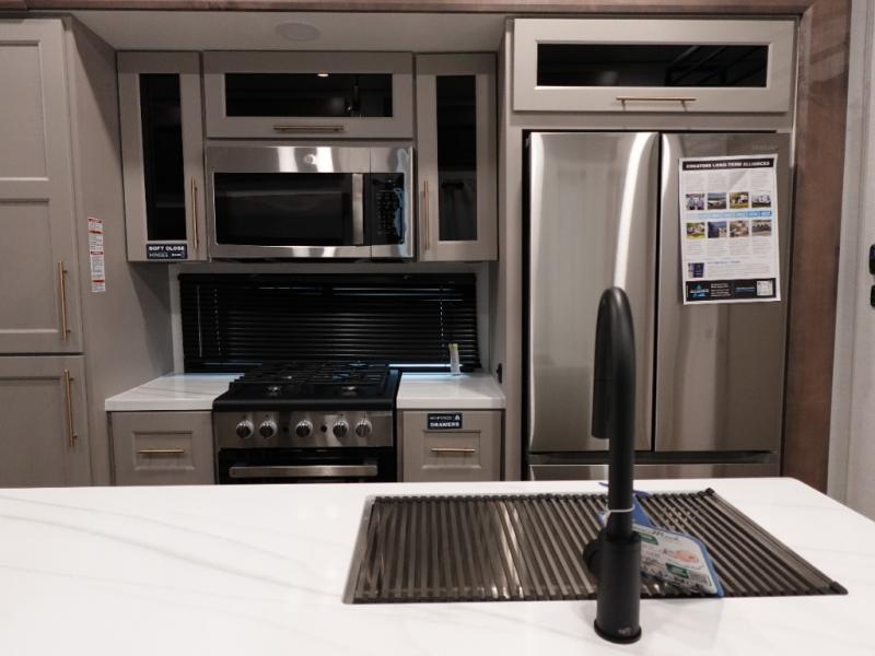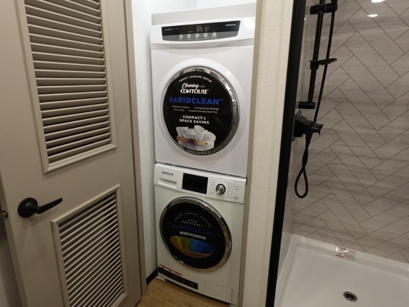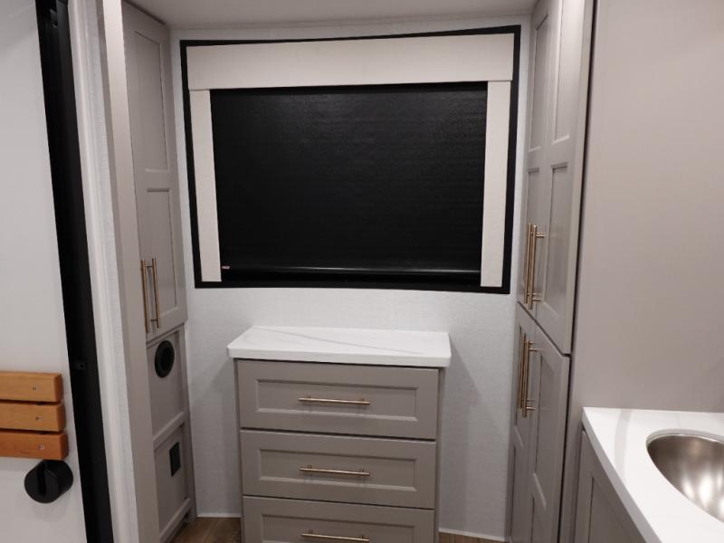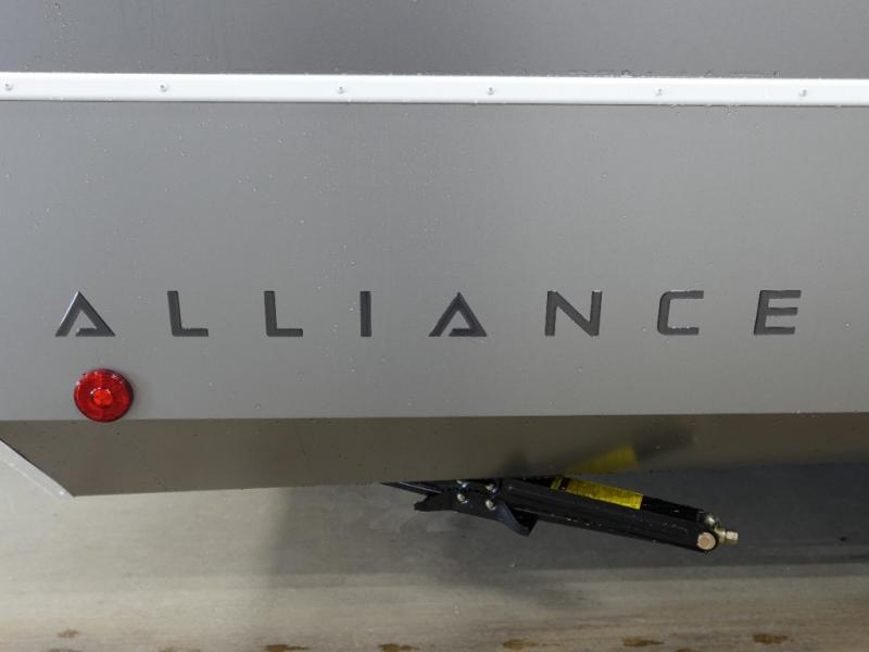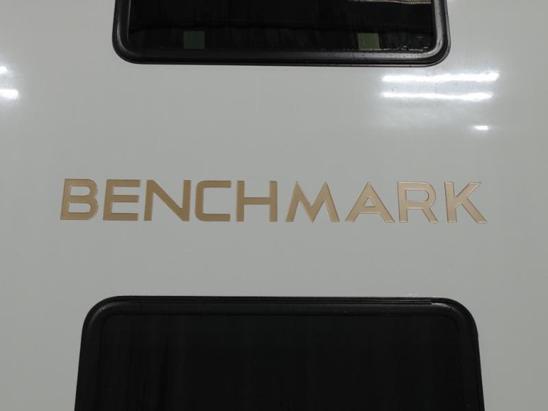 With any Benchmark destination trailer by Alliance RV, you will enjoy luxury features at every turn! The high gloss fiberglass exterior is ultra sleek, and the Azdel composite fiberglass sidewalls add durability so you can camp for years to come. You'll also find a residential exterior garden hose connection outside, along with a powder coated aluminum rear ladder, and an auxiliary LP tank hook up if you want to bring your grill along. Head inside to find hardwood cabinetry, solid surface countertops throughout, oversized windows in all rooms, and MCD roller shades throughout. The 45,000 BTU A/C and 60,000 BTU furnace will keep you comfortable year around, and there is a stackable washer and dryer to make full-time RV living easier than ever!