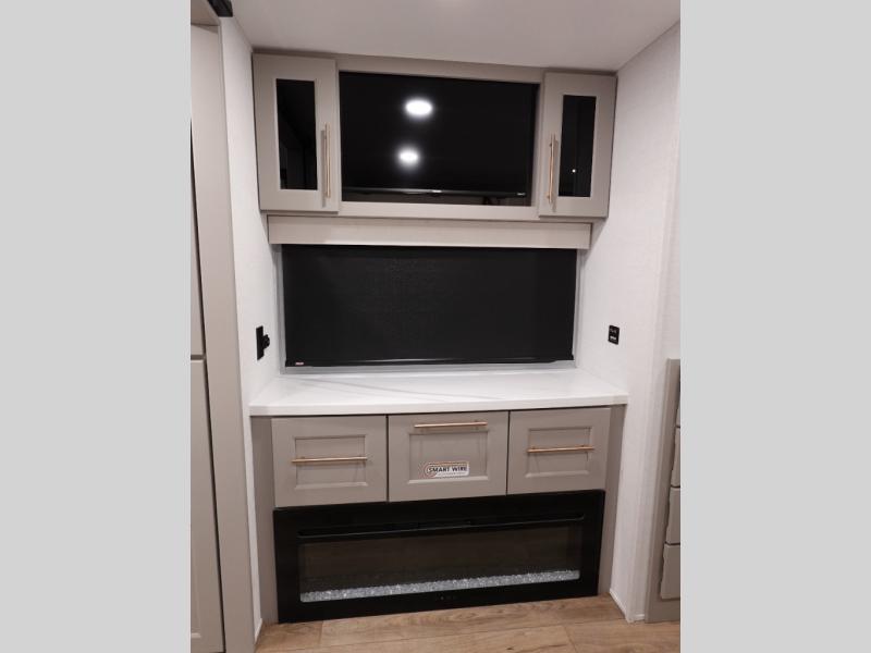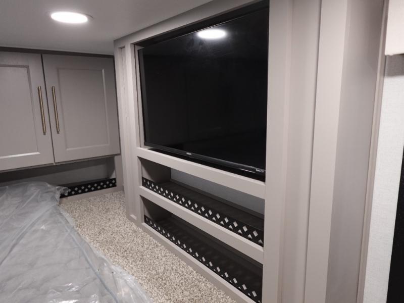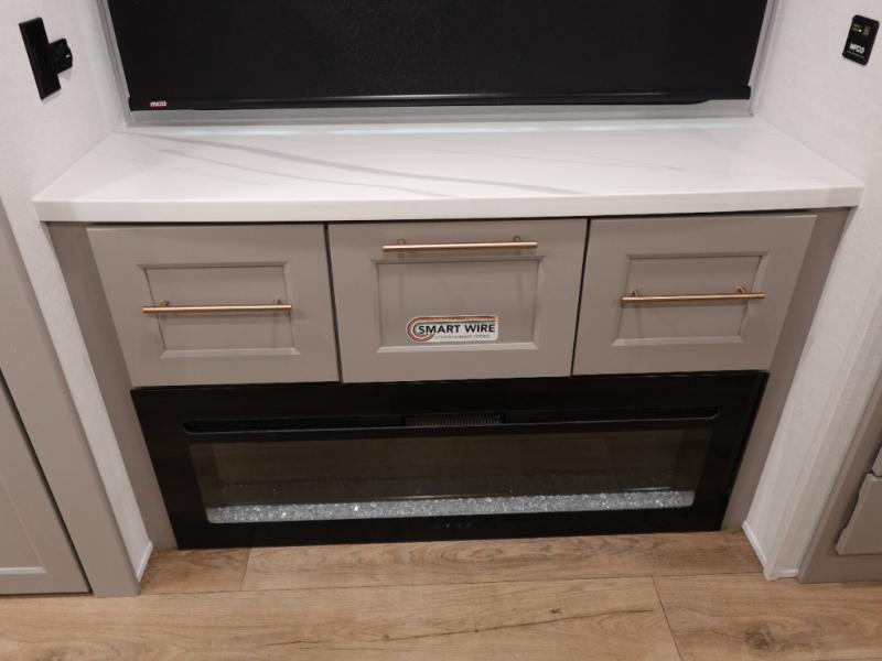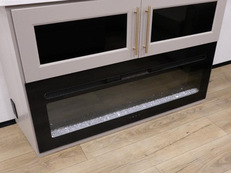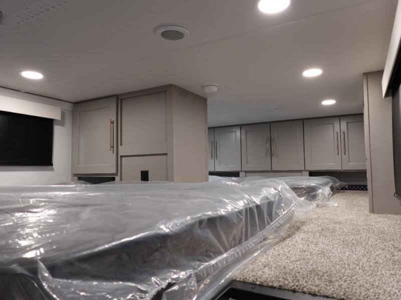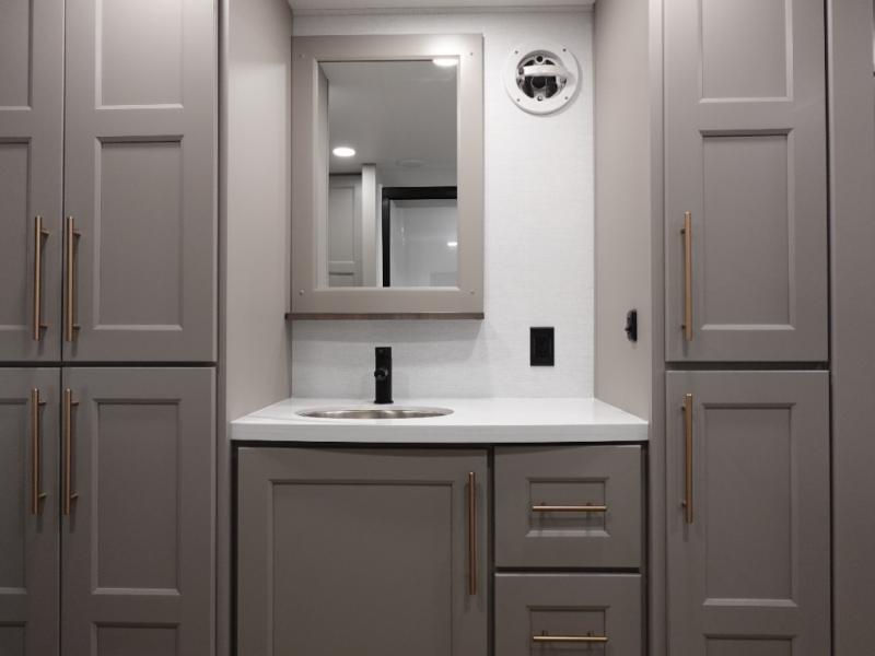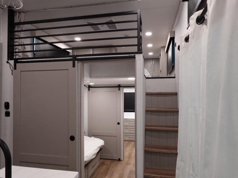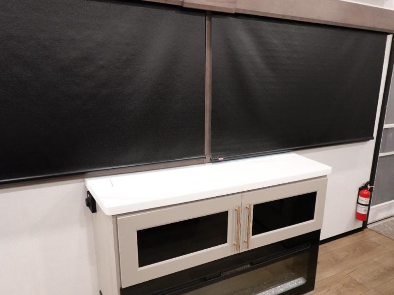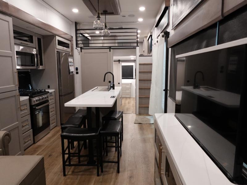 This destination trailer is perfect for a big crowd since it has one Power Tilting king bed, three mattress and an L- shape sofa. Experience the in-home feeling with the amazing kitchen and living room, furnished with a Kitchen island, L- shape sofa and a residential 110 V fridge. Also, you can sense the extreme coziness thanks to the dual fire places and get 24/7 entertainment due to the four TVs along the trailer. Plenty of place can be found in the front and rear loft bedrooms with three wardrobes in total. Lastly the two full bathrooms will allow you to comfortably take a shower after a long day.