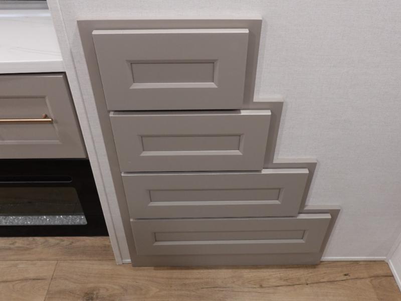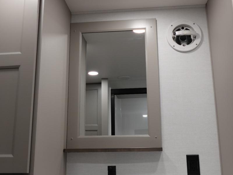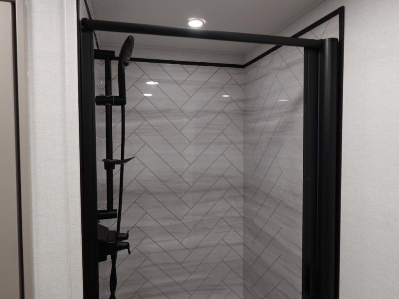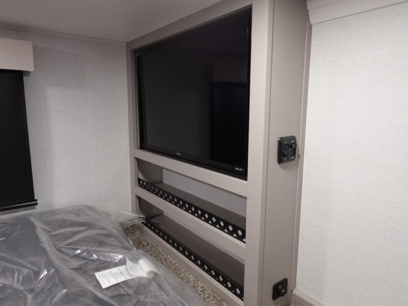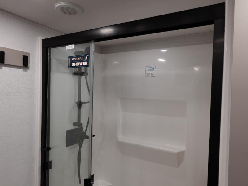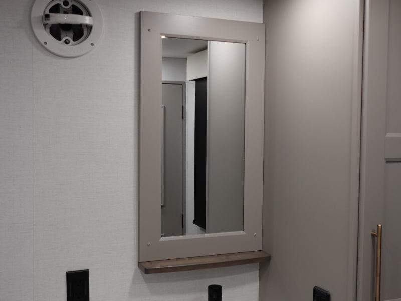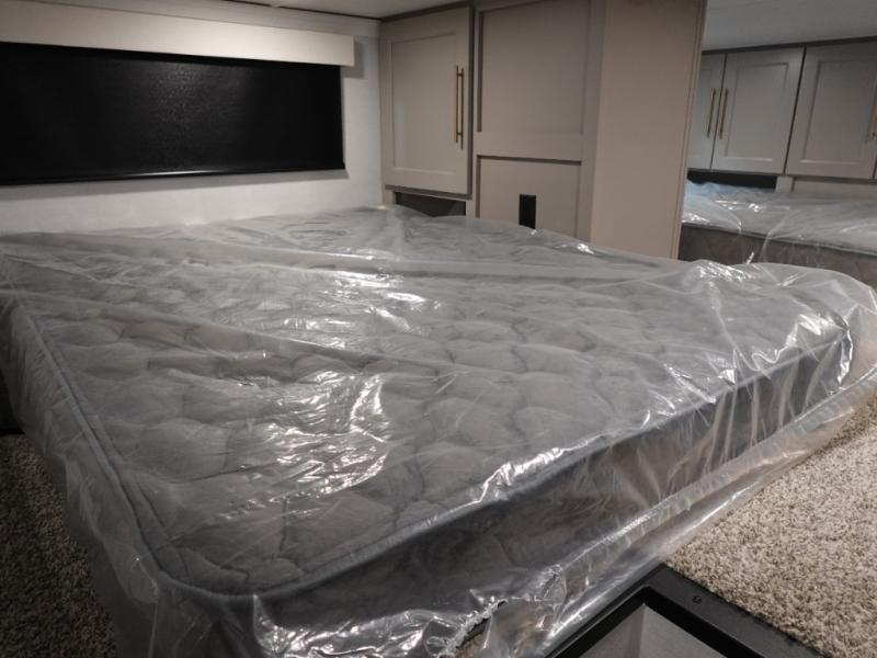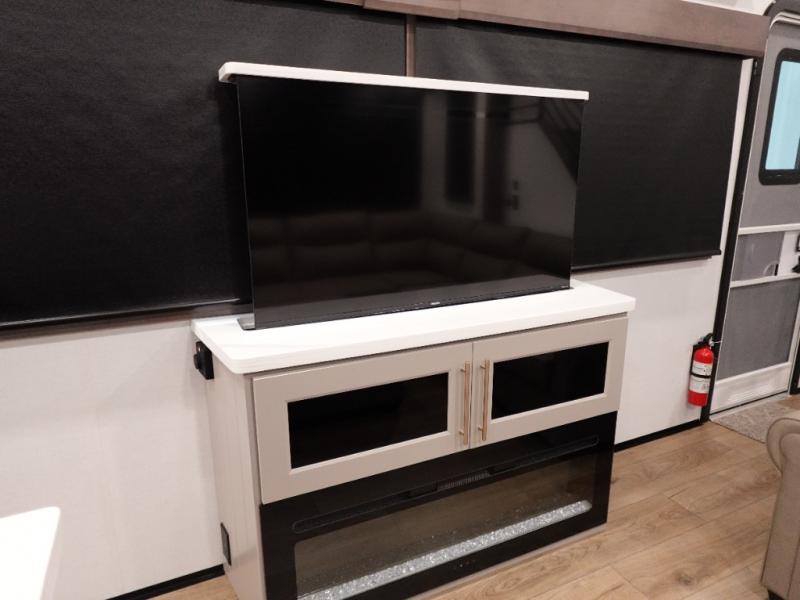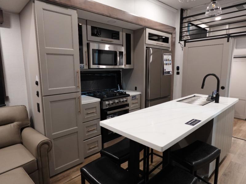 This destination trailer is perfect for a big crowd since it has one Power Tilting king bed, three mattress and an L- shape sofa. Experience the in-home feeling with the amazing kitchen and living room, furnished with a Kitchen island, L- shape sofa and a residential 110 V fridge. Also, you can sense the extreme coziness thanks to the dual fire places and get 24/7 entertainment due to the four TVs along the trailer. Plenty of place can be found in the front and rear loft bedrooms with three wardrobes in total. Lastly the two full bathrooms will allow you to comfortably take a shower after a long day.