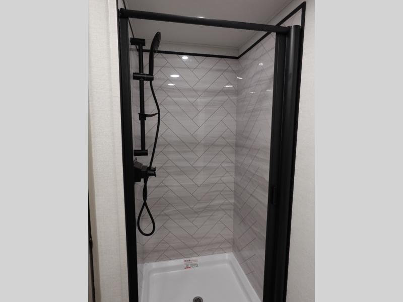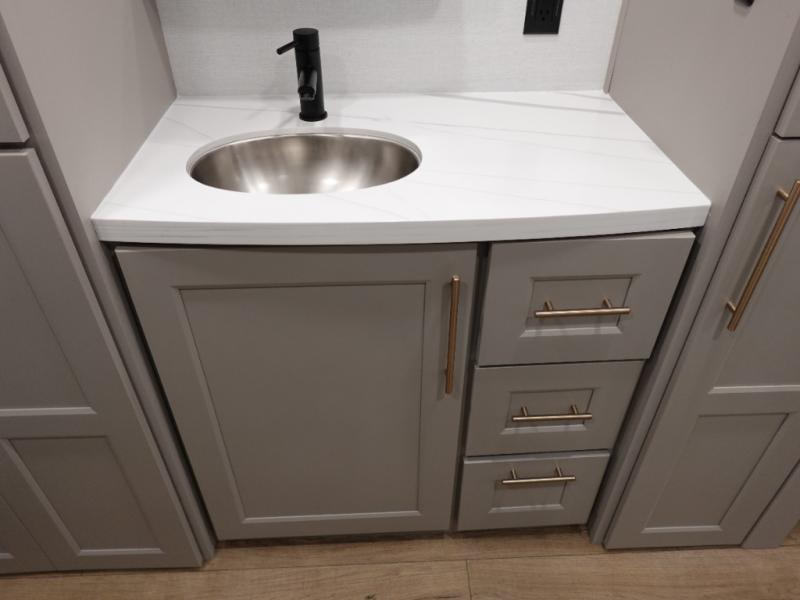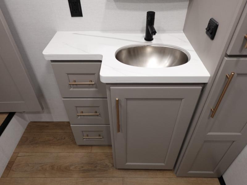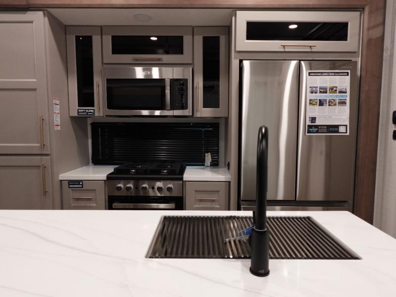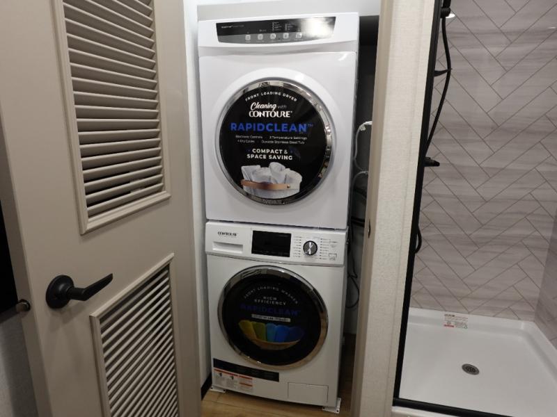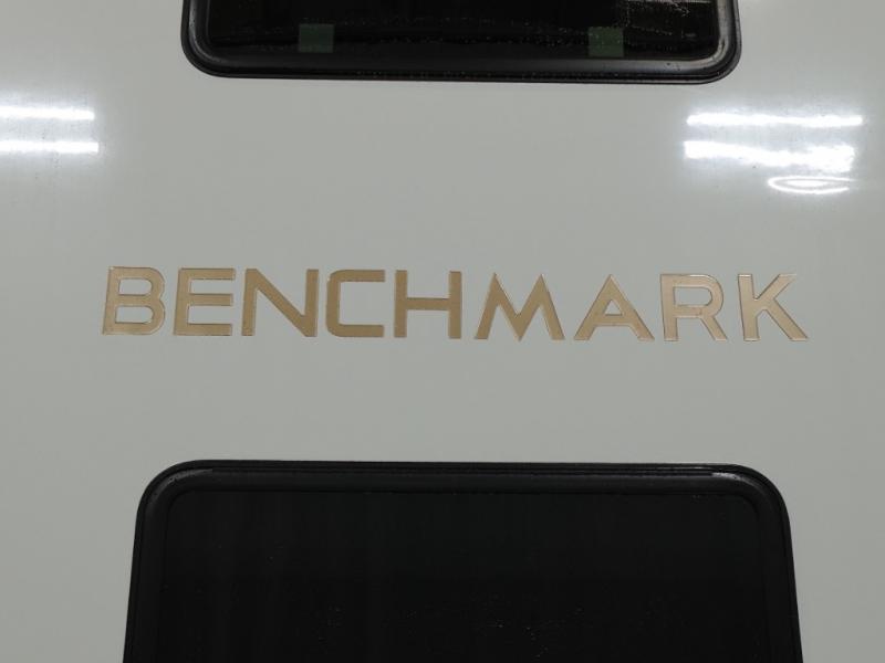 With any Benchmark destination trailer by Alliance RV, you will enjoy luxury features at every turn! The high gloss fiberglass exterior is ultra sleek, and the Azdel composite fiberglass sidewalls add durability so you can camp for years to come. You'll also find a residential exterior garden hose connection outside, along with a powder coated aluminum rear ladder, and an auxiliary LP tank hook up if you want to bring your grill along. Head inside to find hardwood cabinetry, solid surface countertops throughout, oversized windows in all rooms, and MCD roller shades throughout. The 45,000 BTU A/C and 60,000 BTU furnace will keep you comfortable year around, and there is a stackable washer and dryer to make full-time RV living easier than ever!