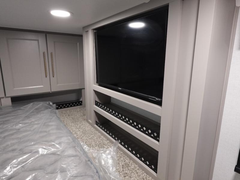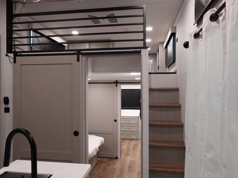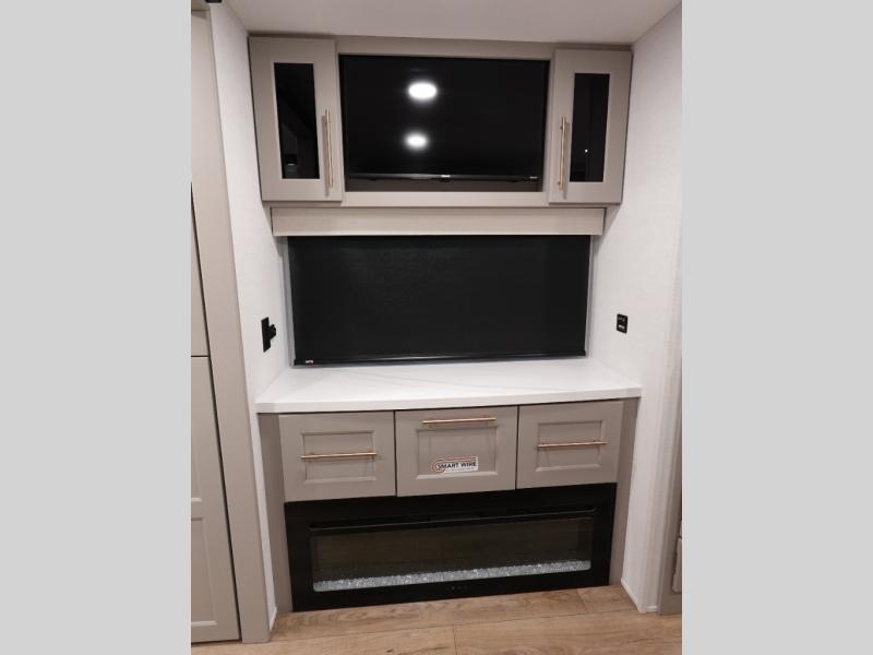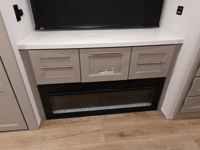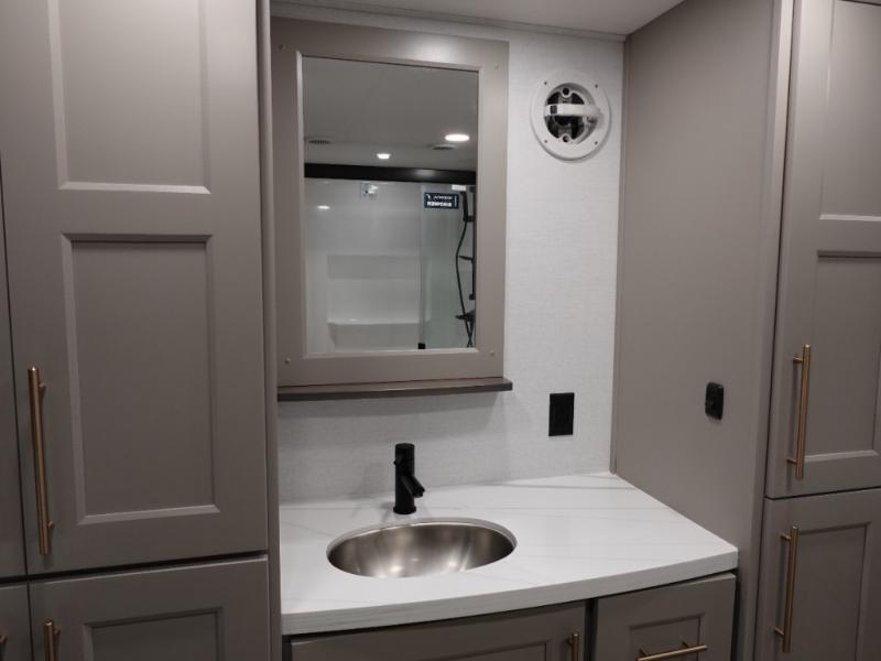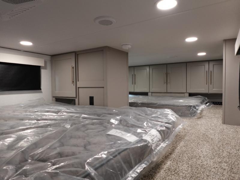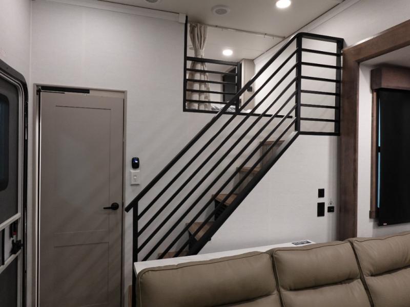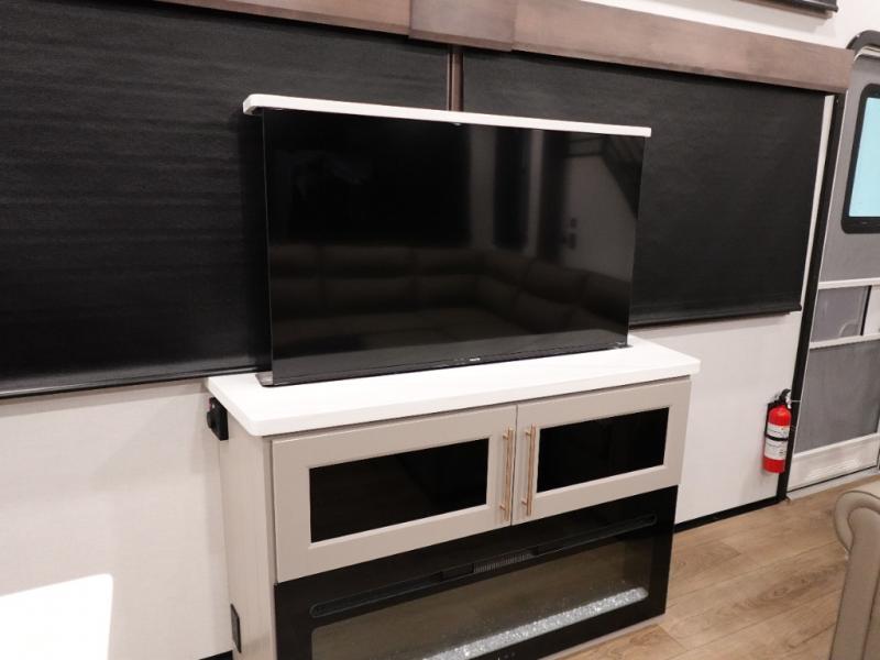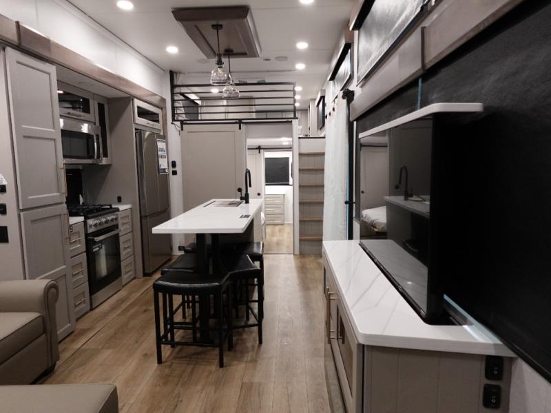 This destination trailer is perfect for a big crowd since it has one Power Tilting king bed, three mattress and an L- shape sofa. Experience the in-home feeling with the amazing kitchen and living room, furnished with a Kitchen island, L- shape sofa and a residential 110 V fridge. Also, you can sense the extreme coziness thanks to the dual fire places and get 24/7 entertainment due to the four TVs along the trailer. Plenty of place can be found in the front and rear loft bedrooms with three wardrobes in total. Lastly the two full bathrooms will allow you to comfortably take a shower after a long day.