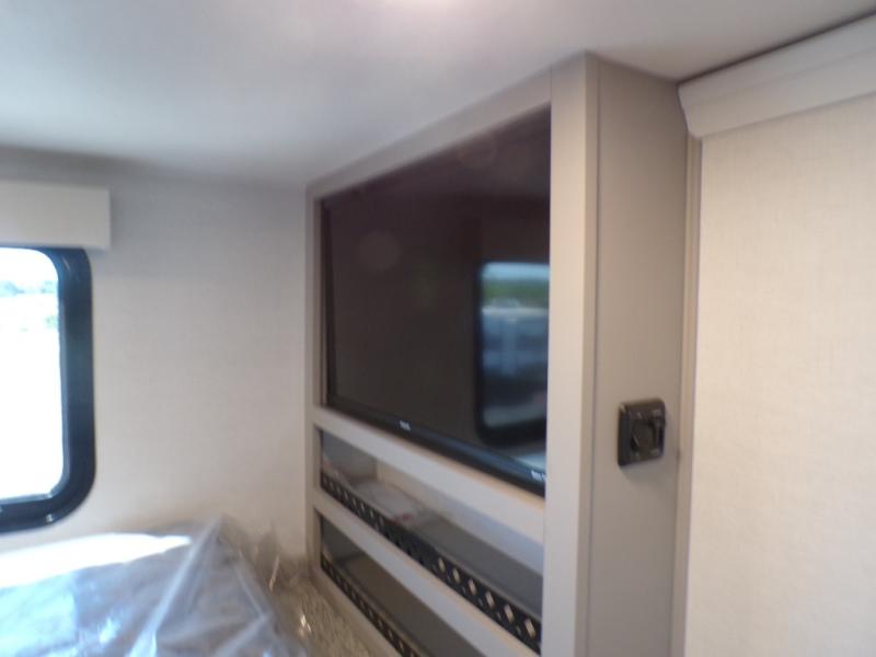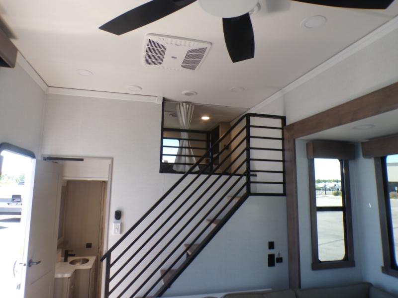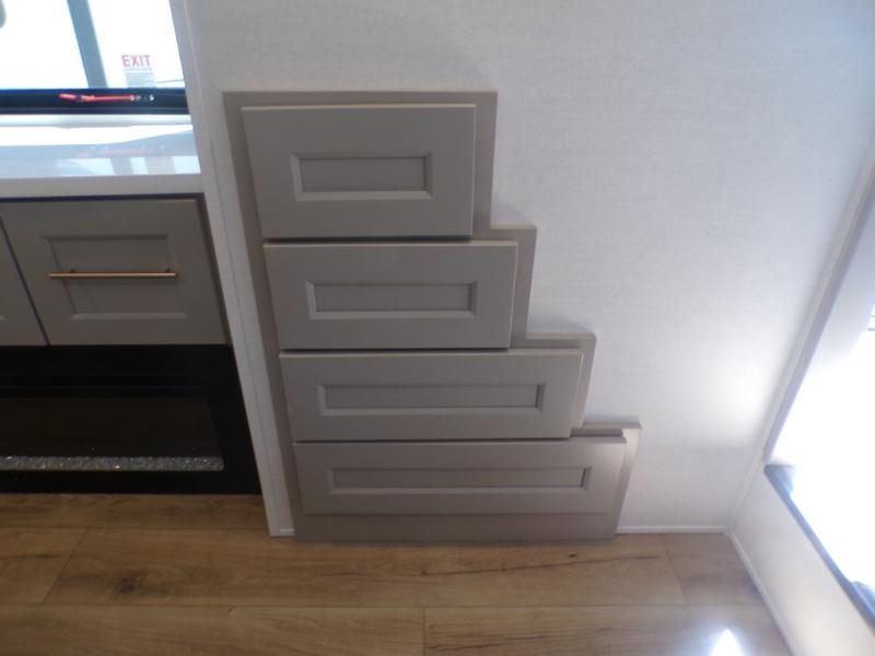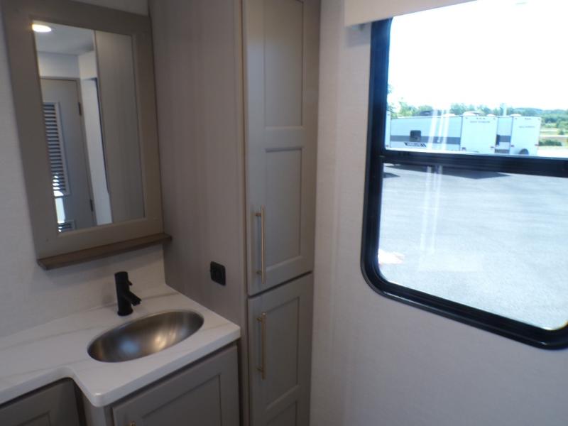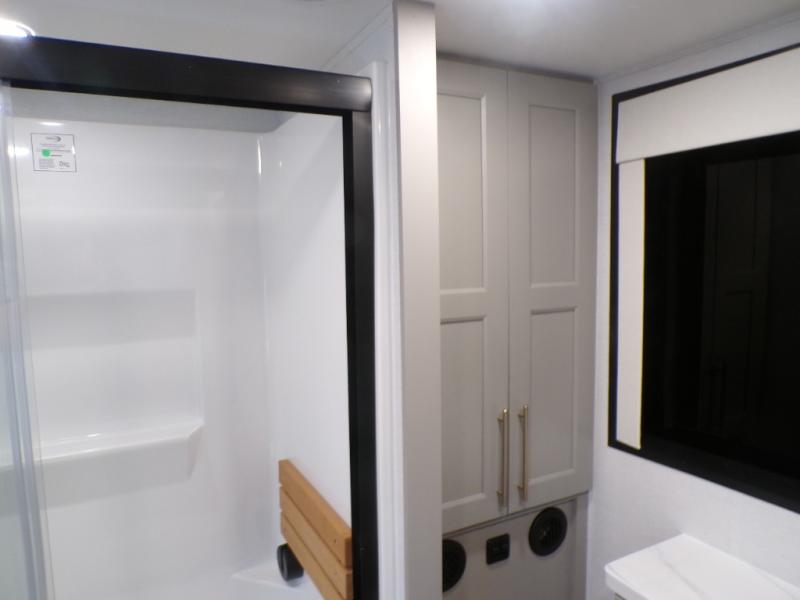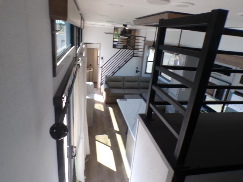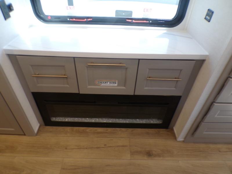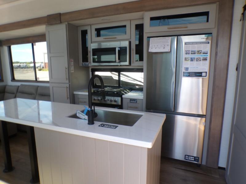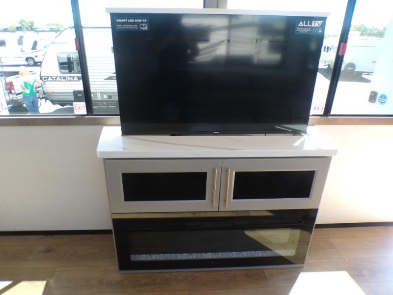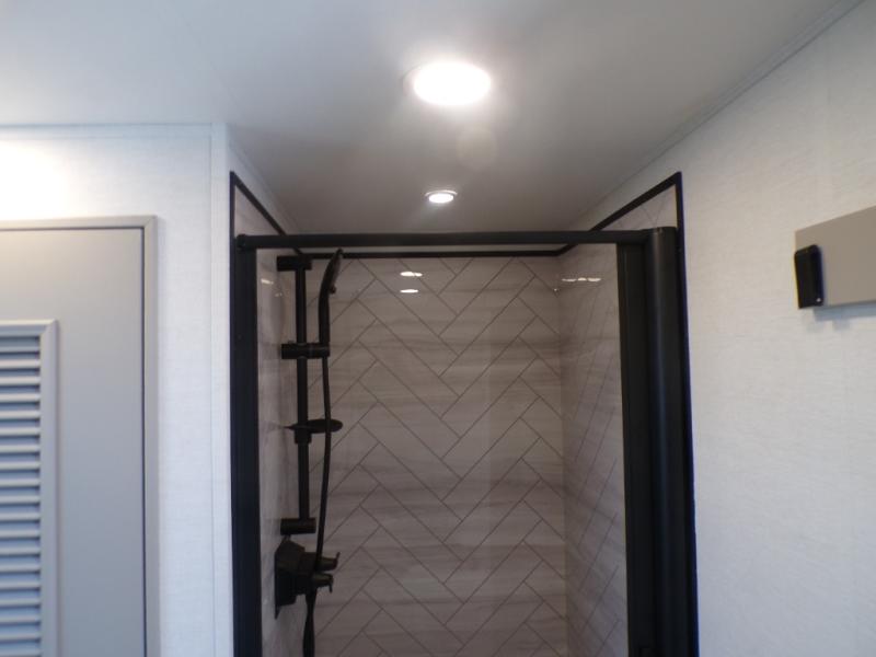 This destination trailer is perfect for a big crowd since it has one Power Tilting king bed, three mattress and an L- shape sofa. Experience the in-home feeling with the amazing kitchen and living room, furnished with a Kitchen island, L- shape sofa and a residential 110 V fridge. Also, you can sense the extreme coziness thanks to the dual fire places and get 24/7 entertainment due to the four TVs along the trailer. Plenty of place can be found in the front and rear loft bedrooms with three wardrobes in total. Lastly the two full bathrooms will allow you to comfortably take a shower after a long day.